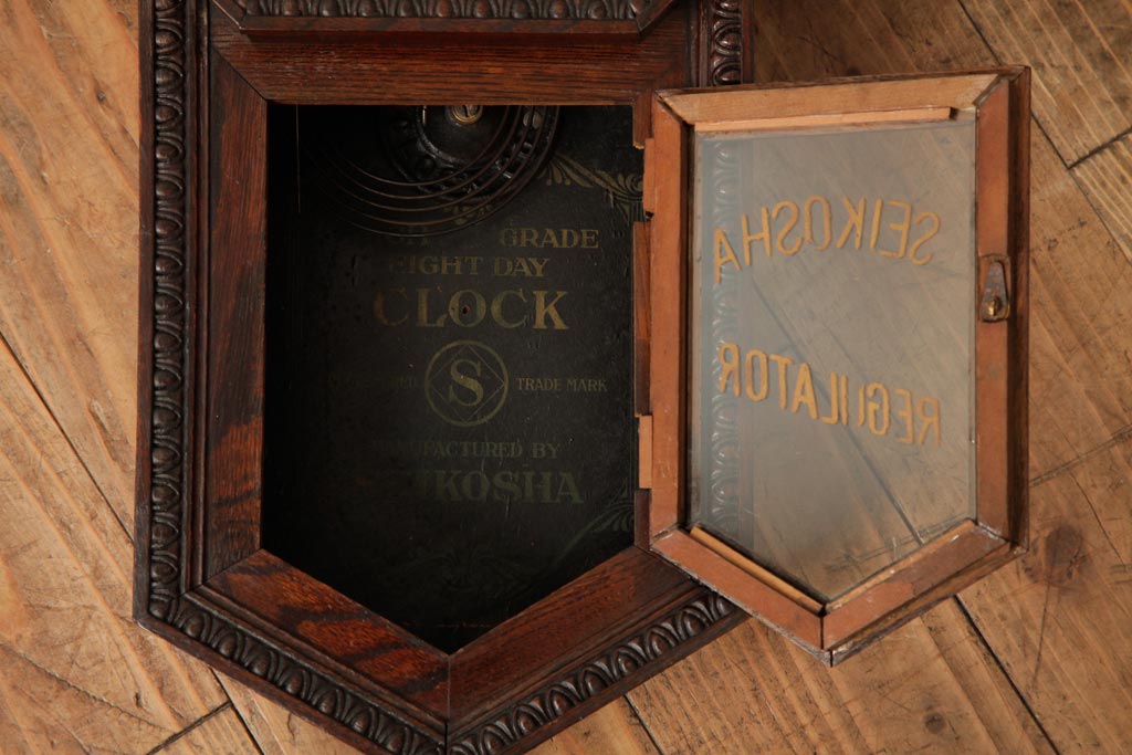 アンティーク雑貨 精工舎(SEIKOSHA、セイコー) 8DAY 浮き彫りがクラシカルなゼンマイ式柱時計(掛け時計、振り子時計)(R-039083)です。