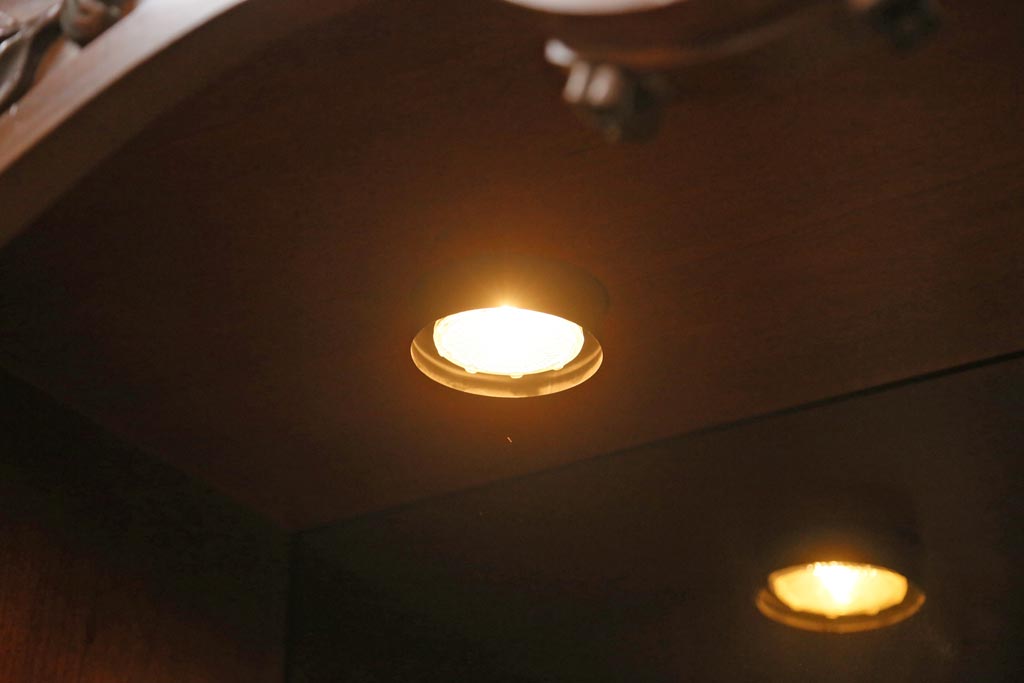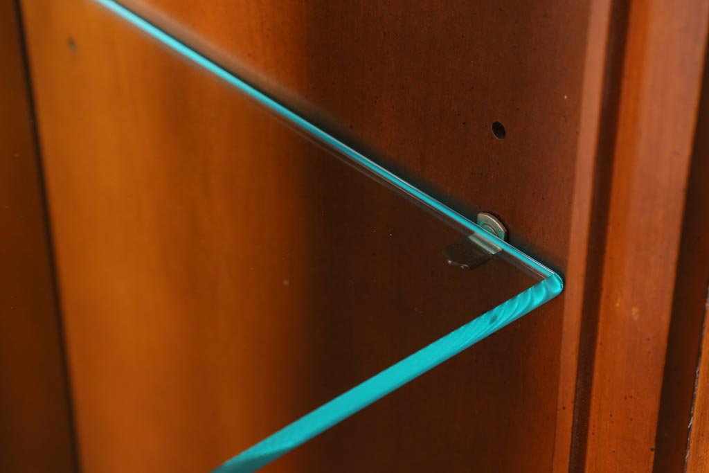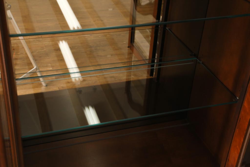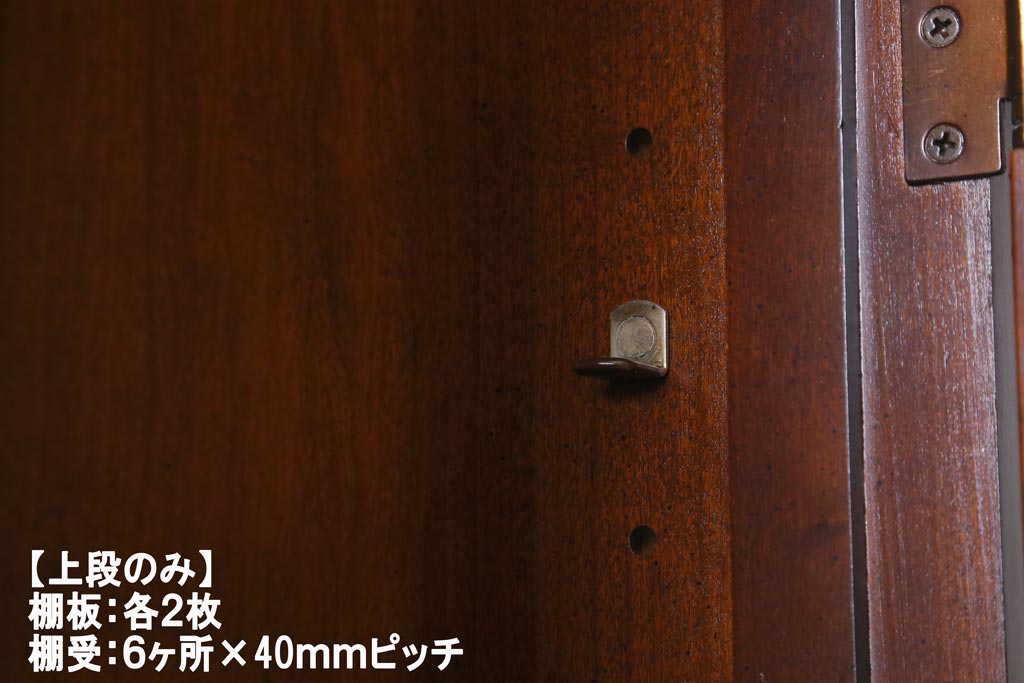 上段の棚板は取り外しできます。ガラス棚板は各2枚ずつあります。棚受けは6ヶ所、40mmピッチで調整できます。棚幅サイズのものが1枚の作りです。