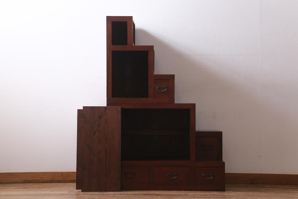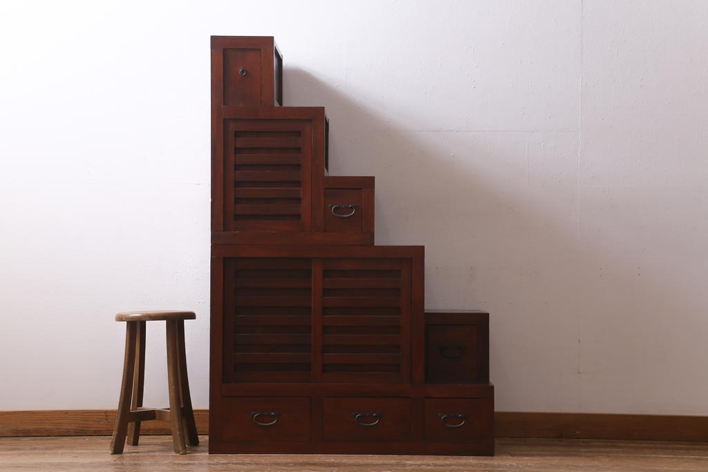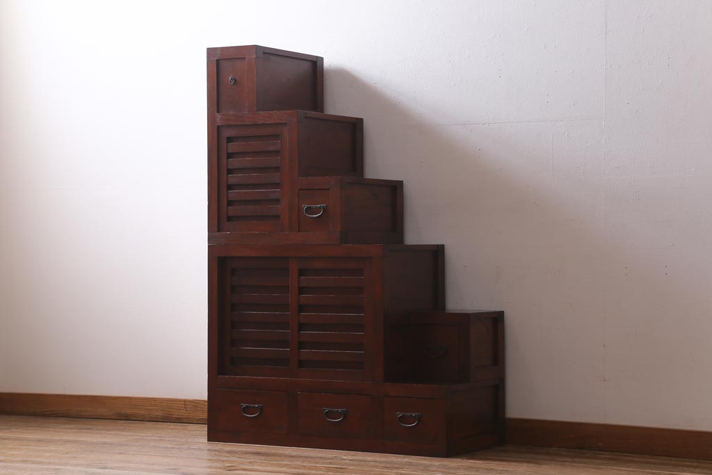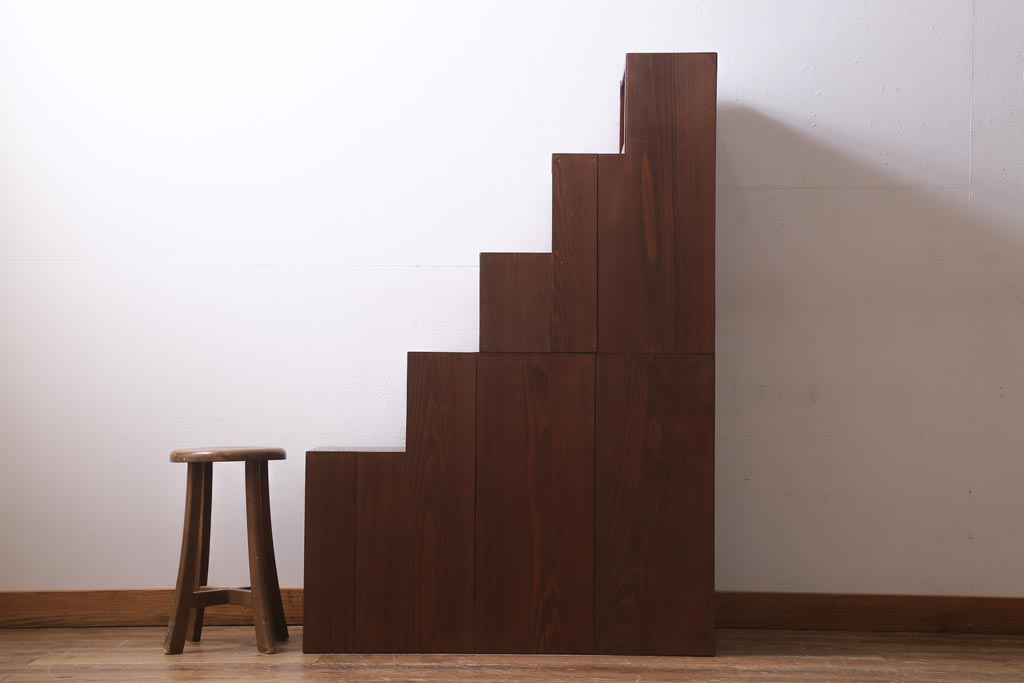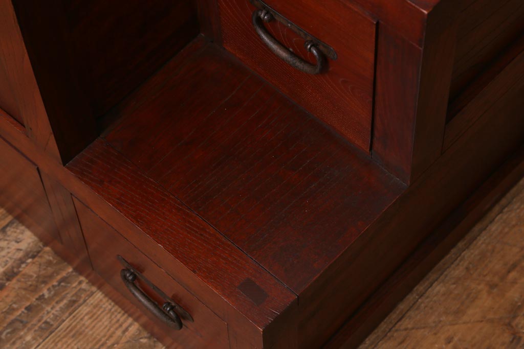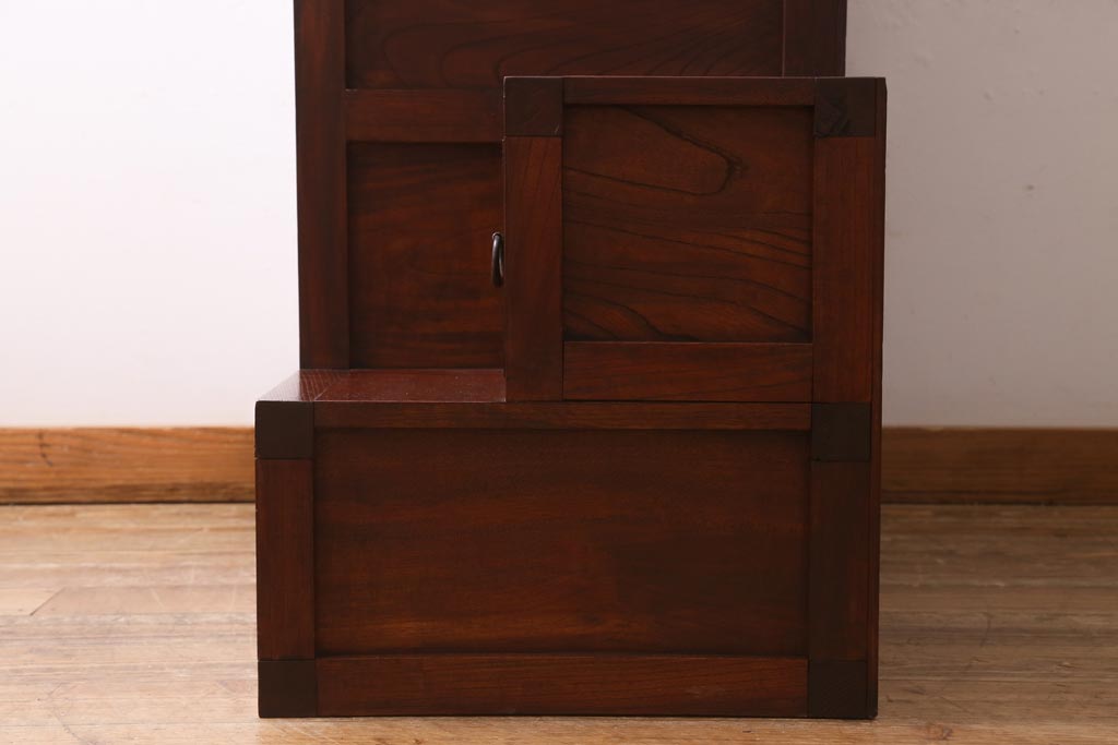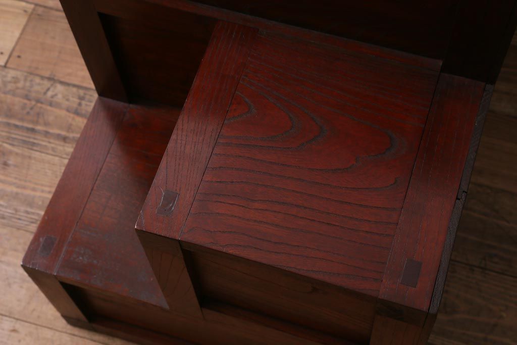 ビンテージ家具 工芸家具 漆塗り 三方にケヤキ無垢材が使われた高級な階段箪笥(R-039129)です。