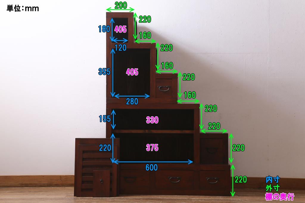 棚の内寸は4枚目の画像に記載しておりますのでそちらをご参考ください。