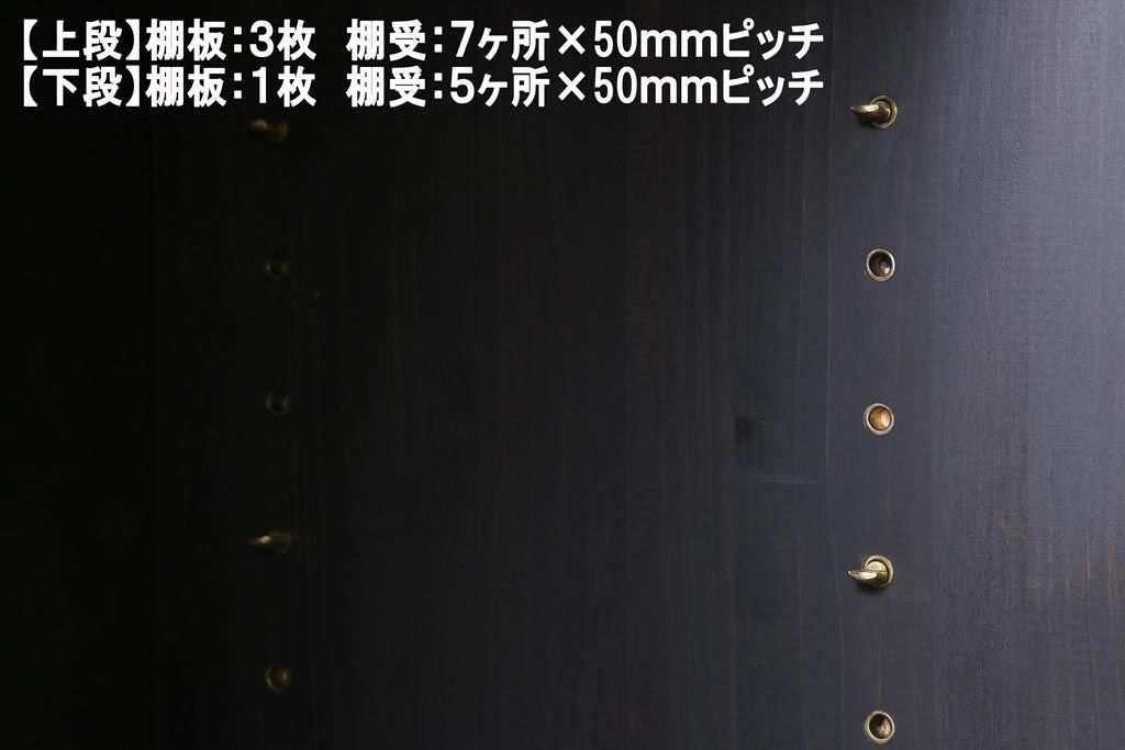 棚板は取り外しできます。棚板は上段3枚、下段1枚あります。棚受けは上段7ヶ所、下段5ヶ所あり、それぞれ50mmピッチで調整できます。棚幅サイズのものが1枚の作りです。