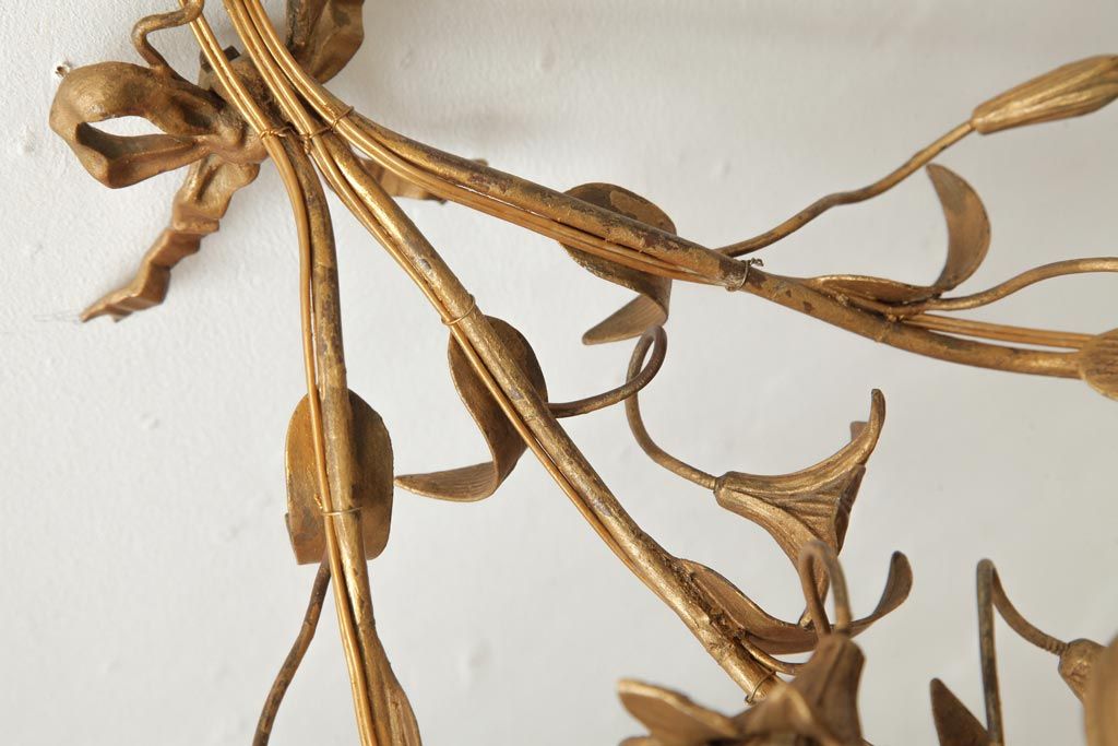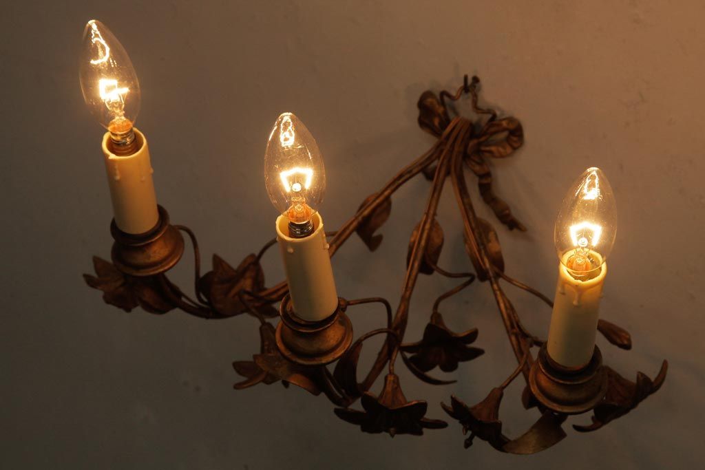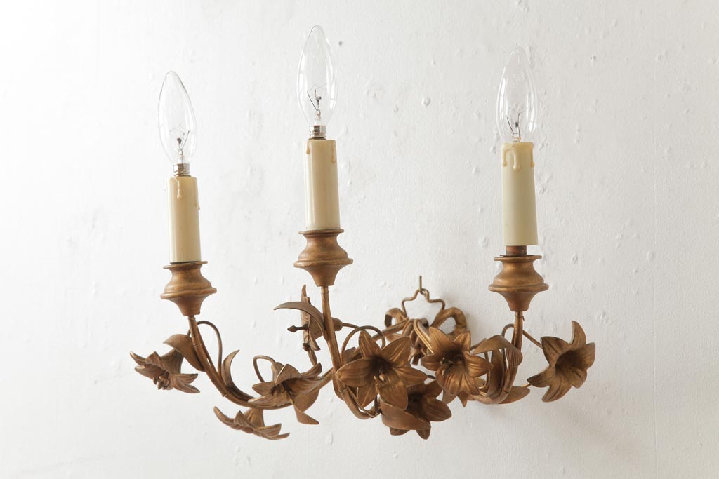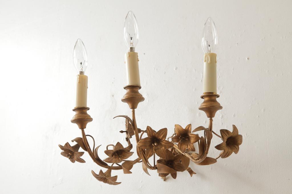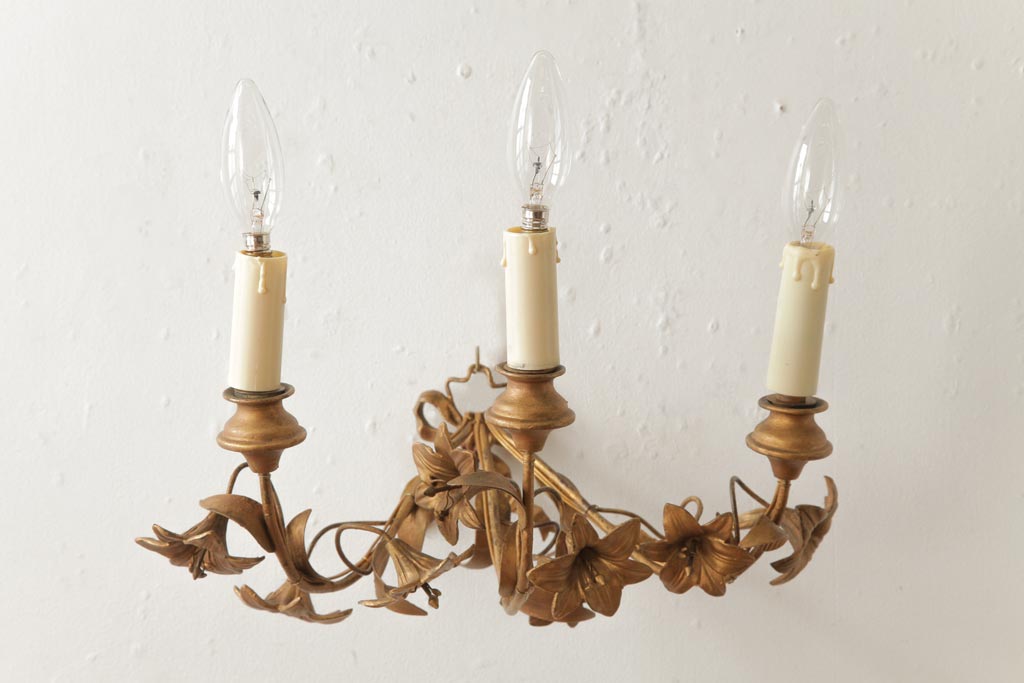 ヴィンテージ照明 フランスビンテージ 真鍮製 3灯 花の装飾がすてきなウォールランプ(壁掛け照明、壁付け照明)(R-039119)