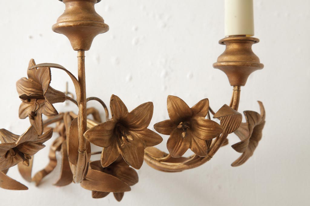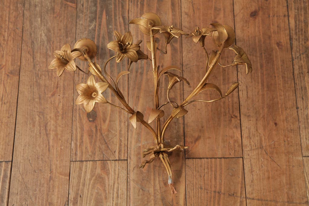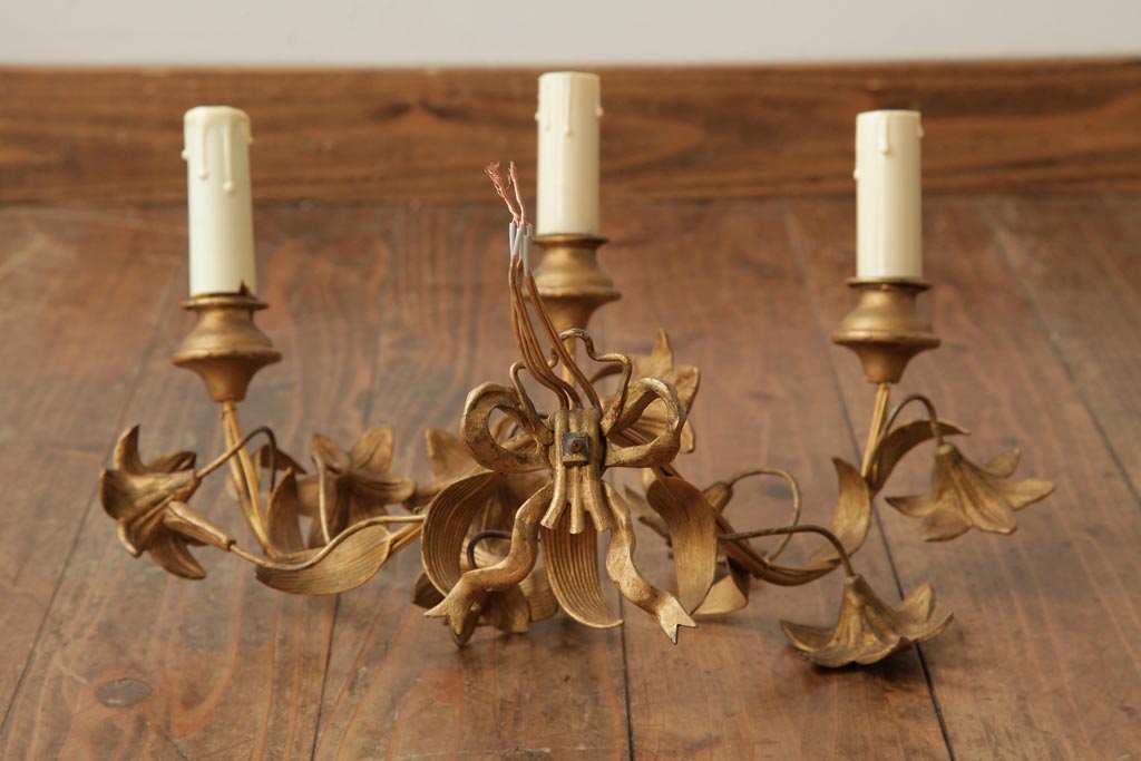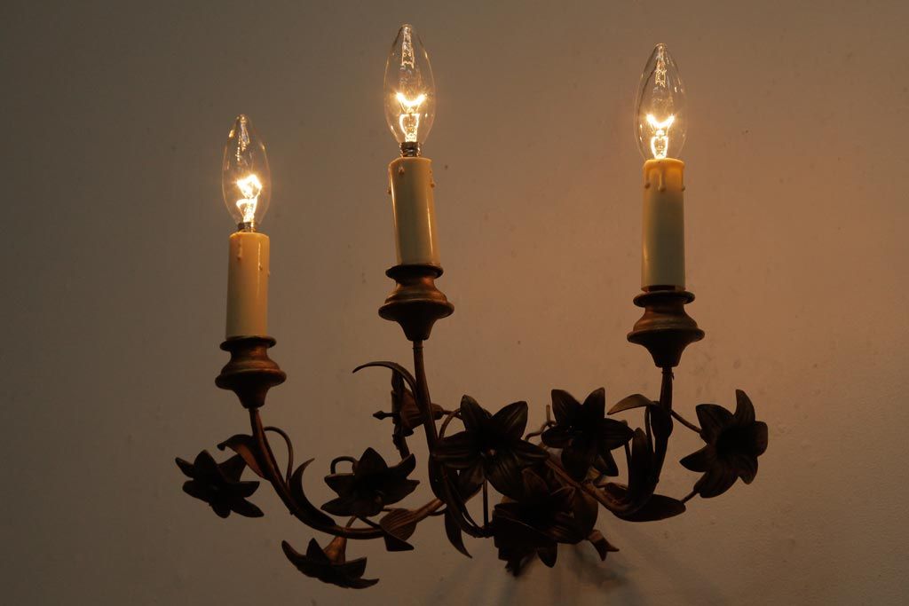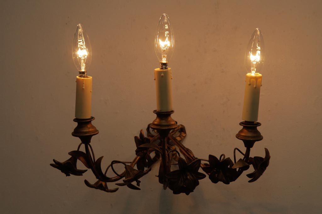 ヴィンテージ照明 フランスビンテージ 真鍮製 3灯 花の装飾がすてきなウォールランプ(壁掛け照明、壁付け照明)(R-039119)です。