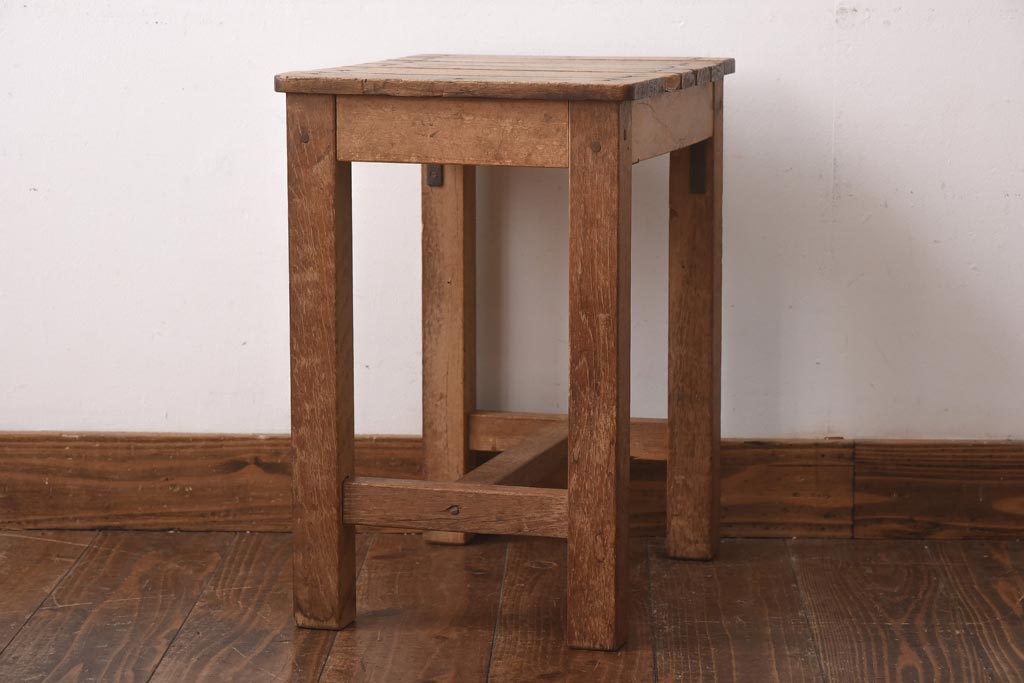 レトロ家具 ナラ材 古い木の素朴な風合いがおしゃれな四角いスツール(板座チェア、花台、角スツール)(R-039226)