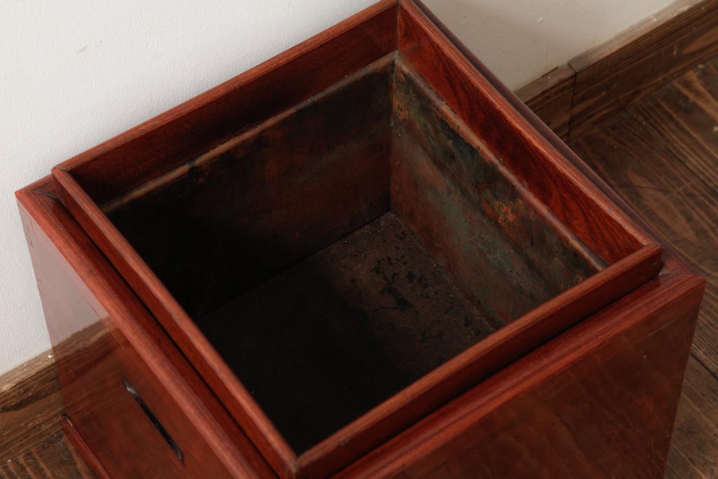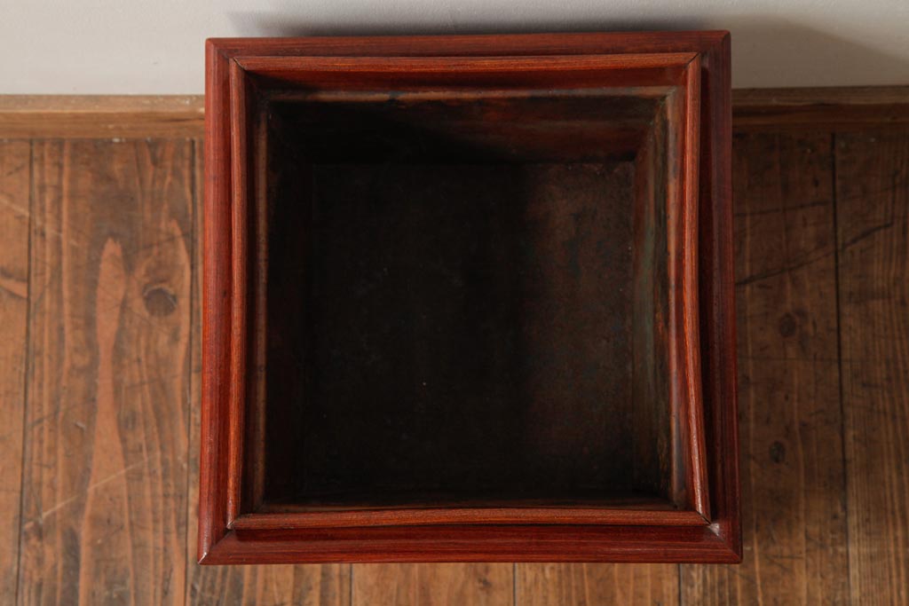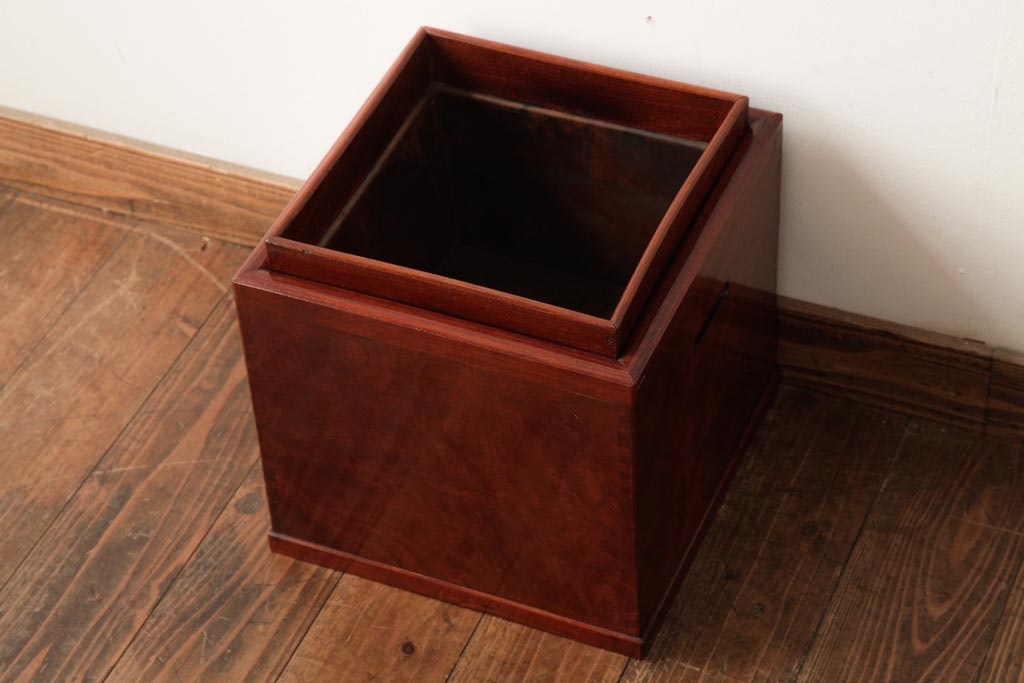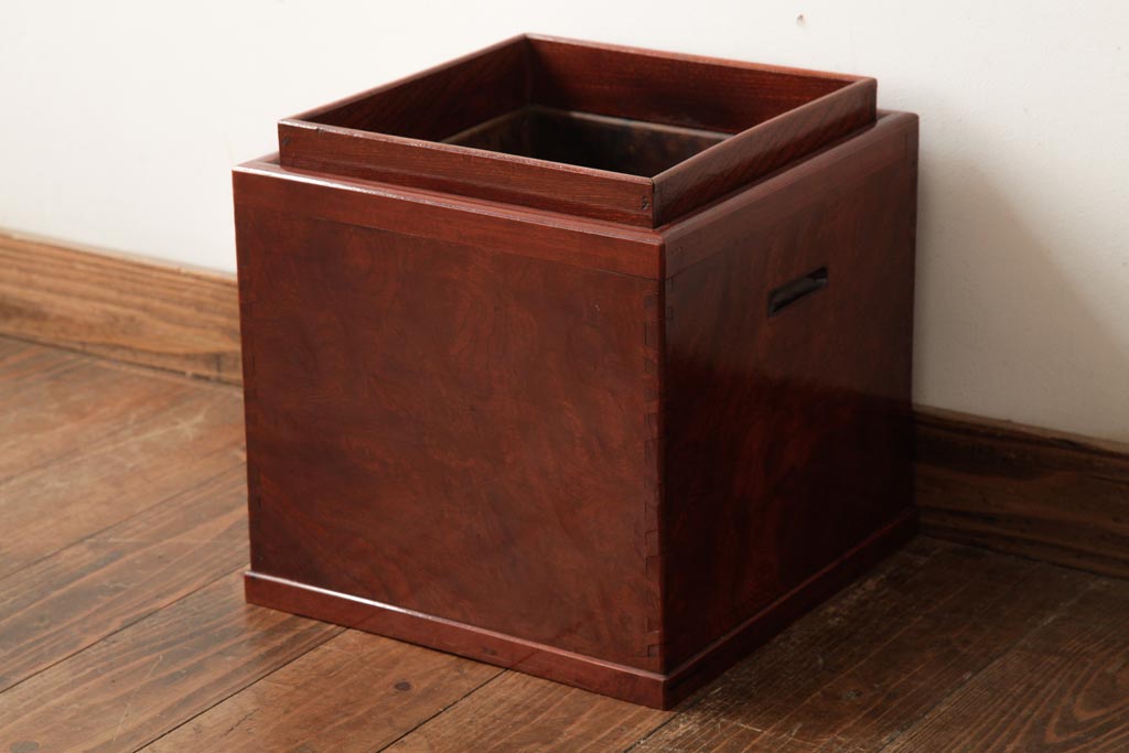 火鉢> 木製火鉢 > アンティーク雑貨 指物家具 昭和初期 ケヤキ玉杢材 漆塗り 上手物!和の風情を堪能できる角火鉢(手あぶり、箱火鉢)(R-039254)