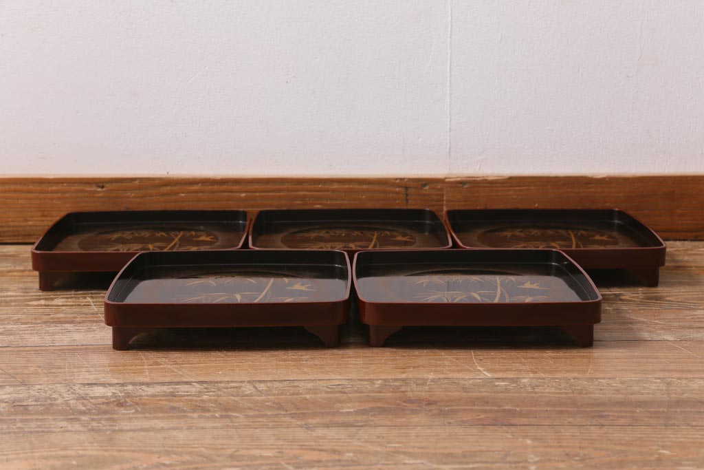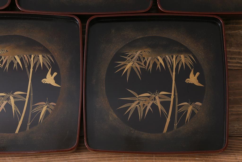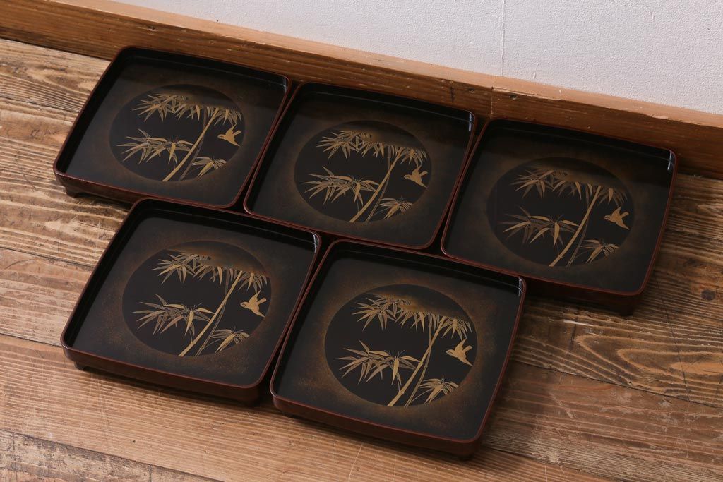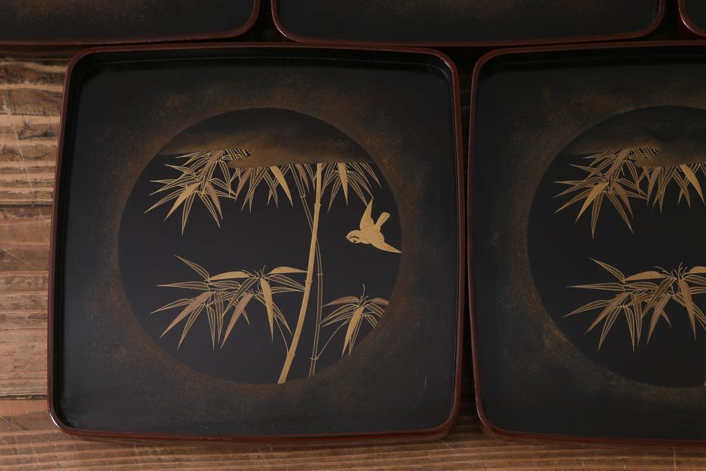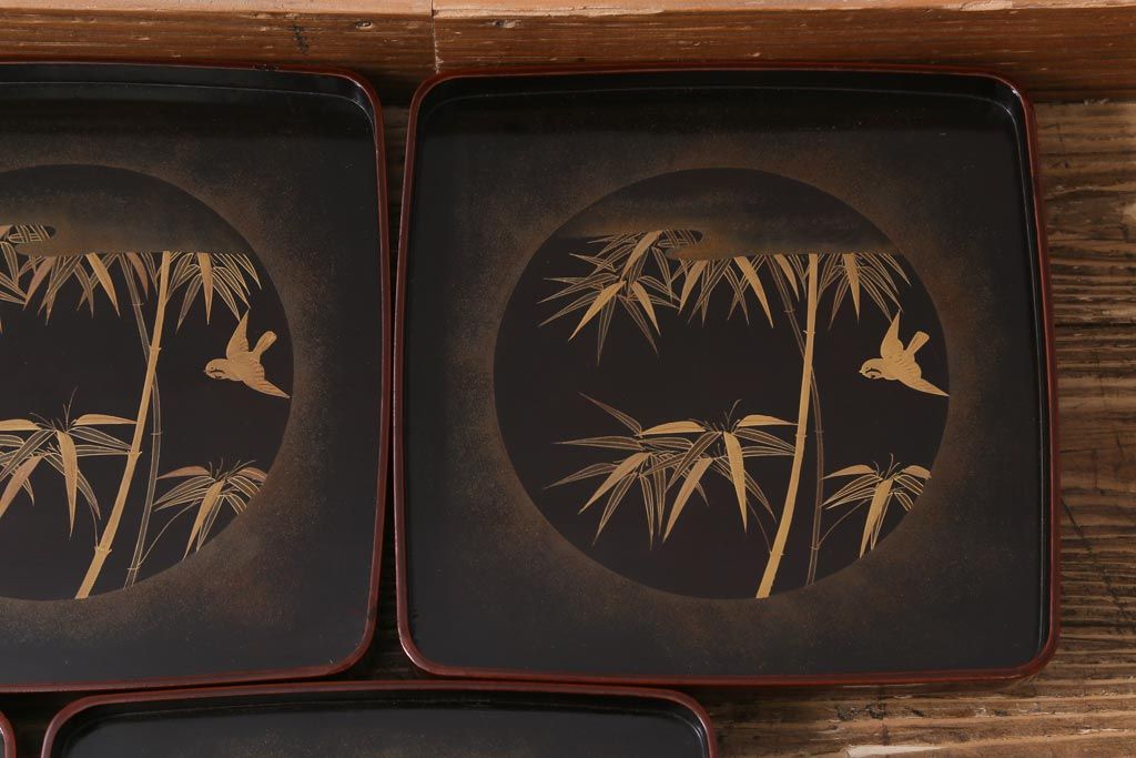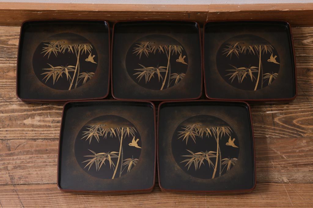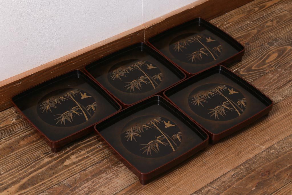 アンティーク雑貨 時代物 大正昭和初期 蒔絵 竹と雀図 漆器 角盆5枚セット(R-039111)