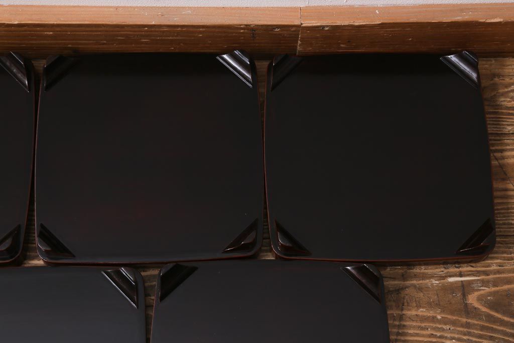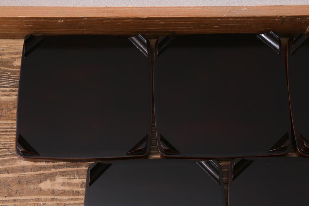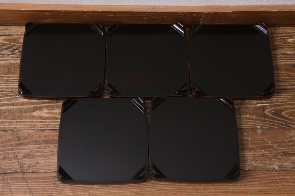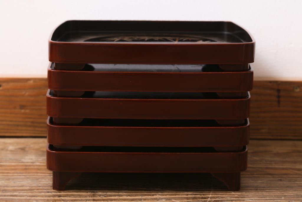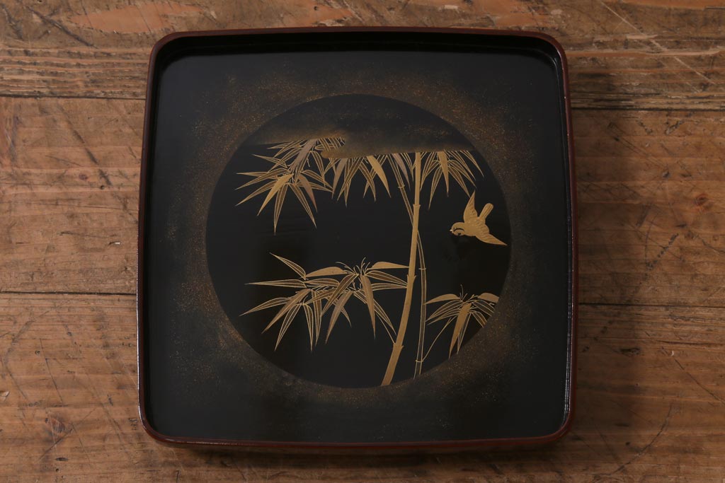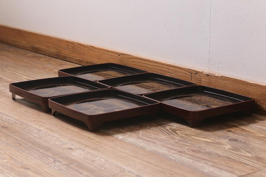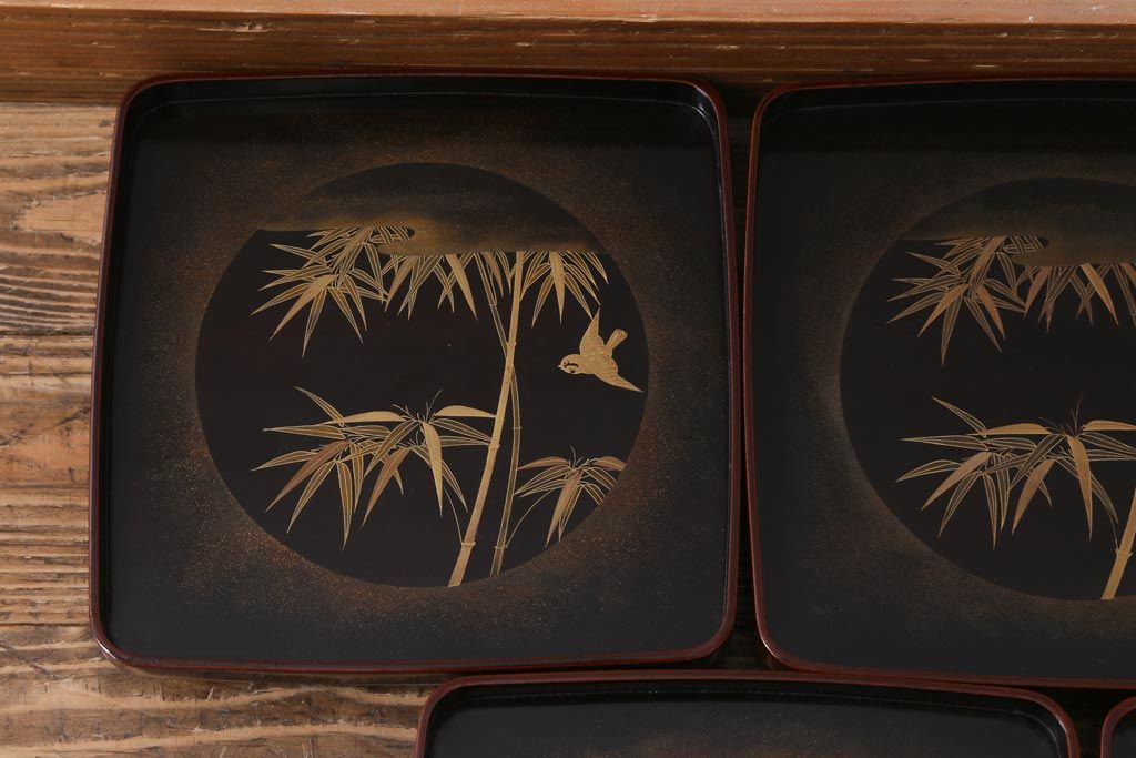 アンティーク雑貨 時代物 大正昭和初期 蒔絵 竹と雀図 漆器 角盆5枚セット(R-039111)