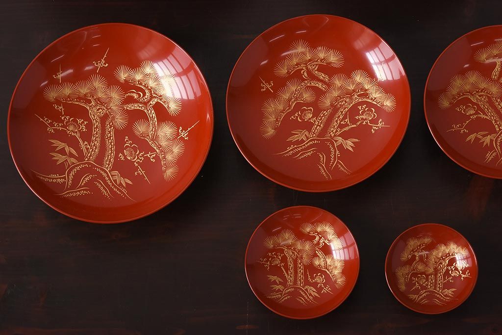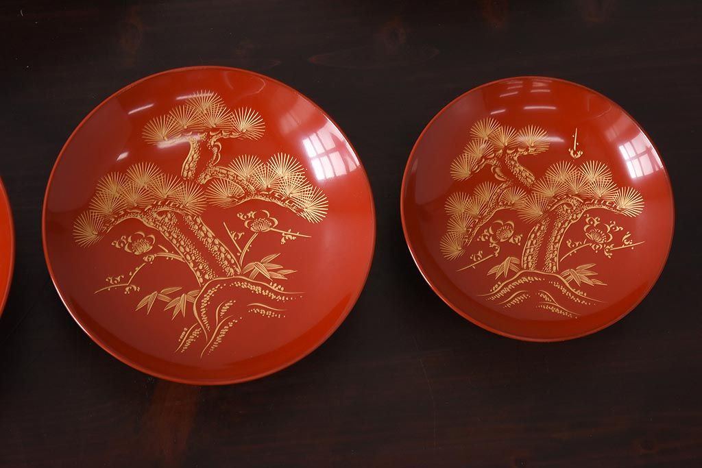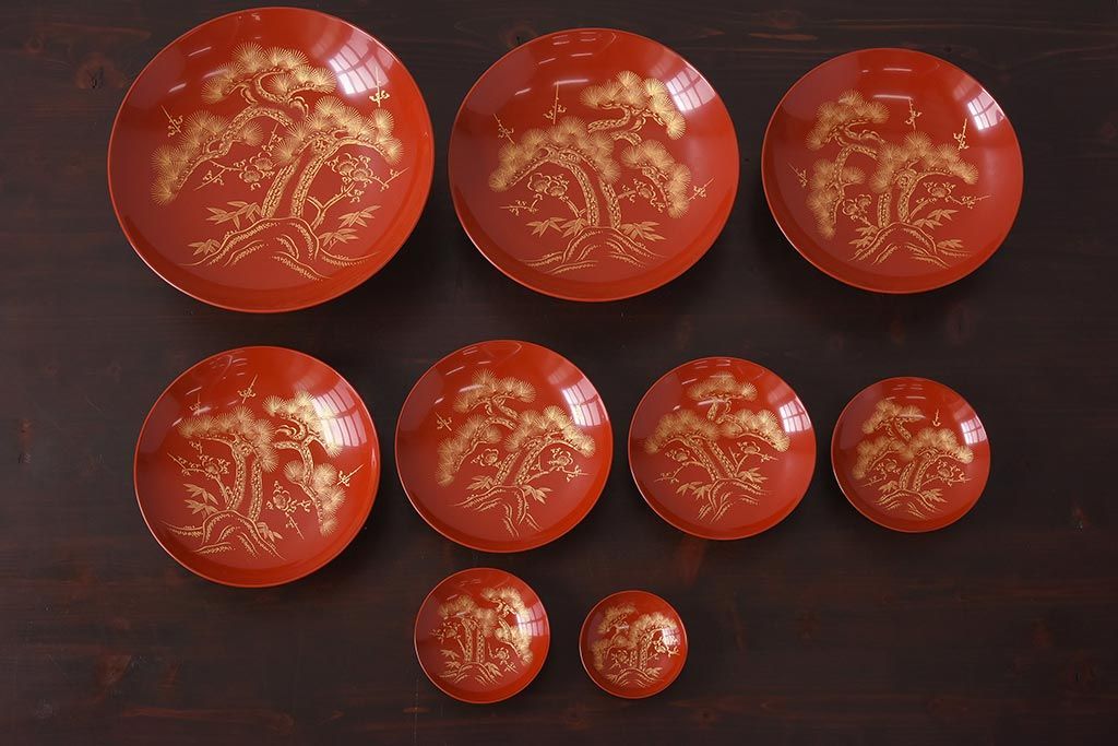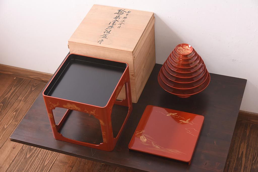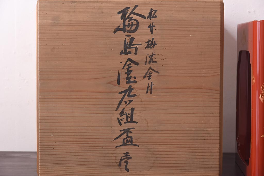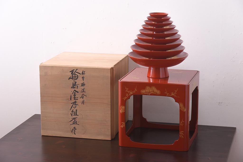 ラフジュ工房> 骨董・美術品> 骨董-漆器 > 大正昭和初期 共箱 松竹梅沈金 輪島塗九ツ組盃・台付き(漆器、酒器、杯)(R-039259)