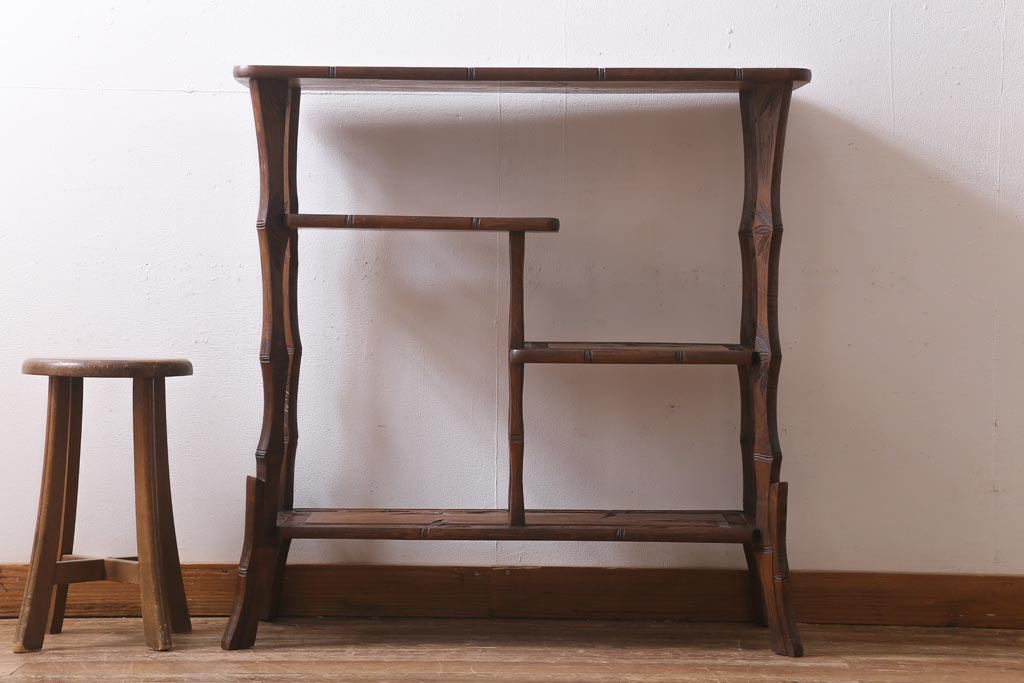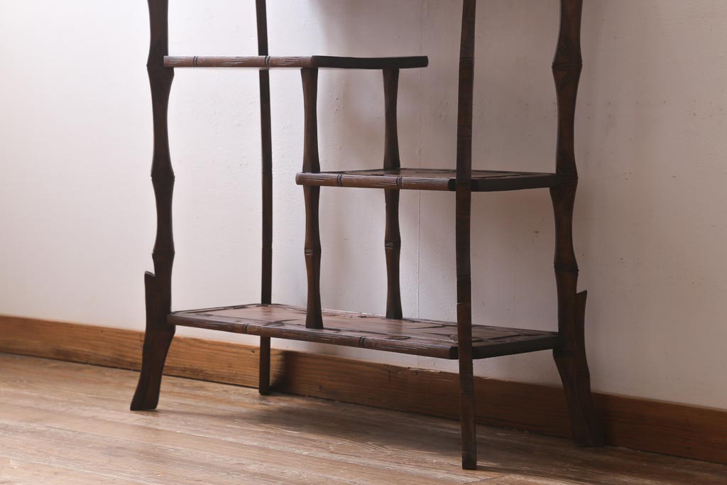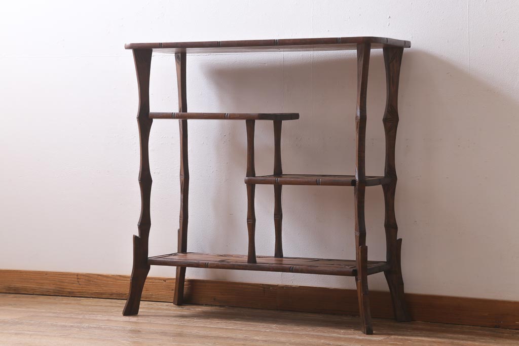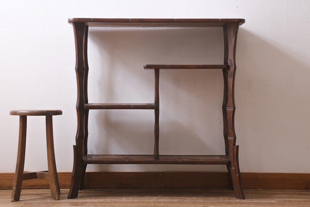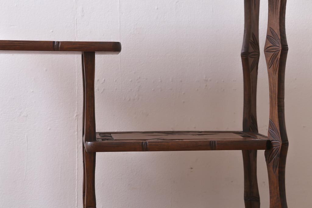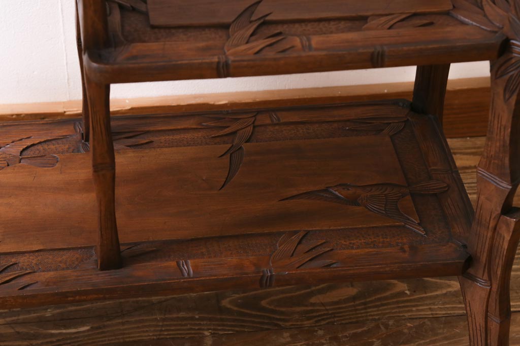 ビンテージ家具 伝統工芸 日光彫り 竹と鳥の彫刻が印象的な飾り棚(茶棚、違い棚、オープンラック)(R-039272)