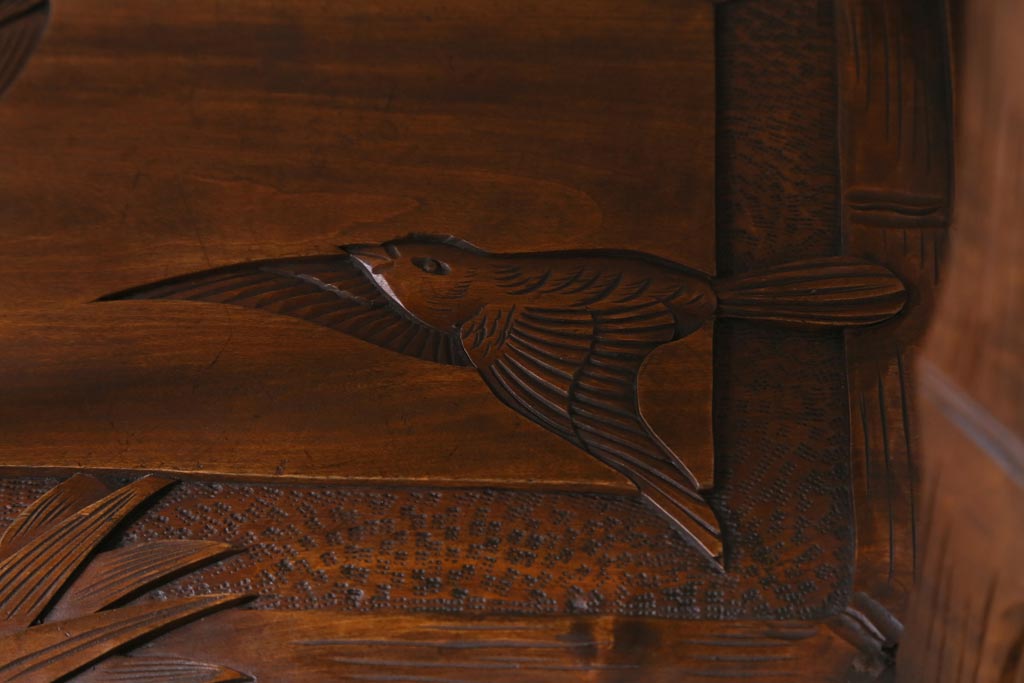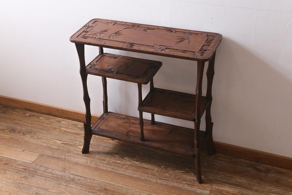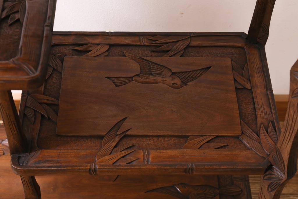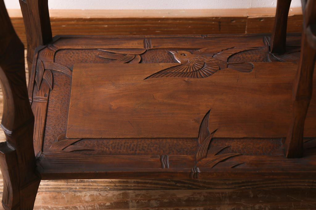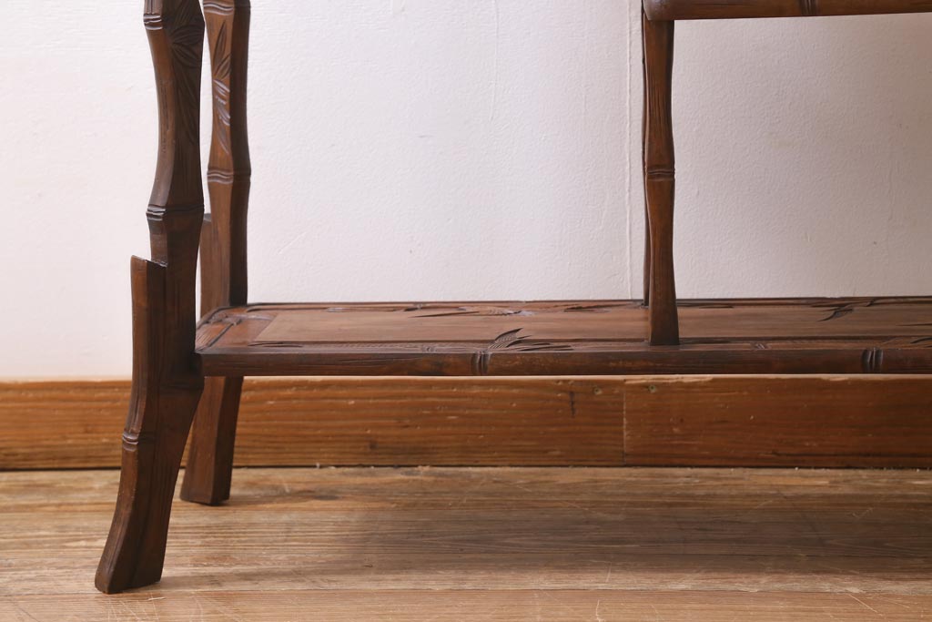 ビンテージ家具 伝統工芸 日光彫り 竹と鳥の彫刻が印象的な飾り棚(茶棚、違い棚、オープンラック)(R-039272)です。