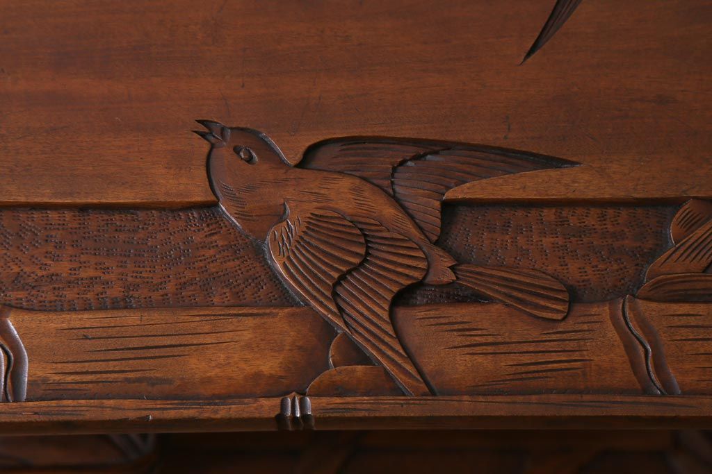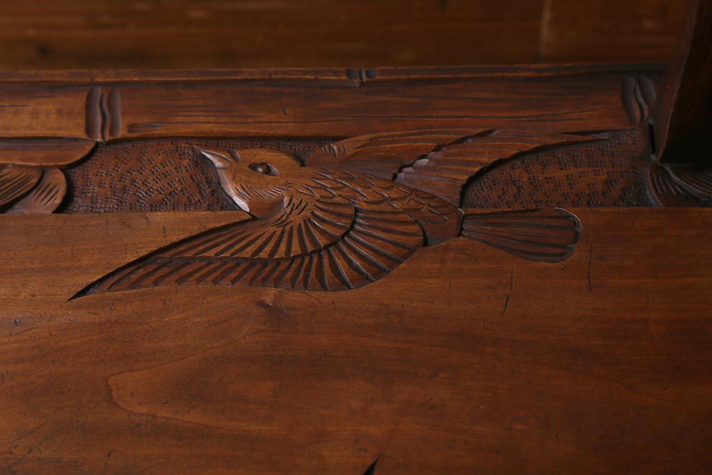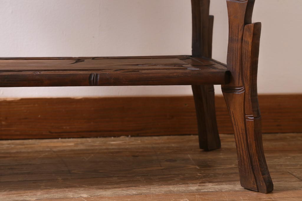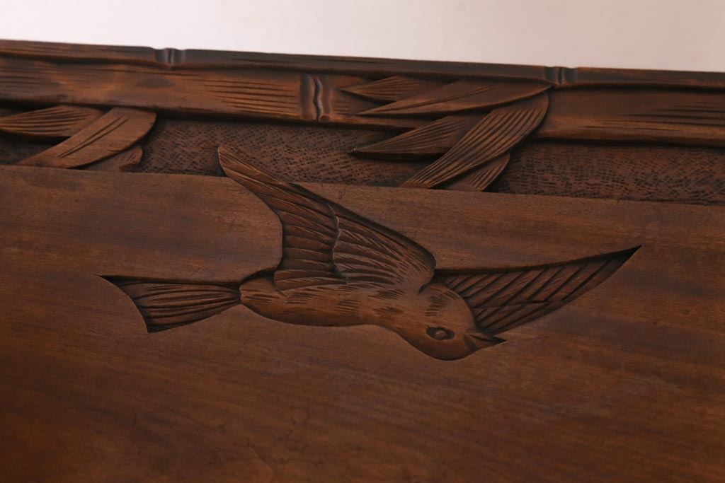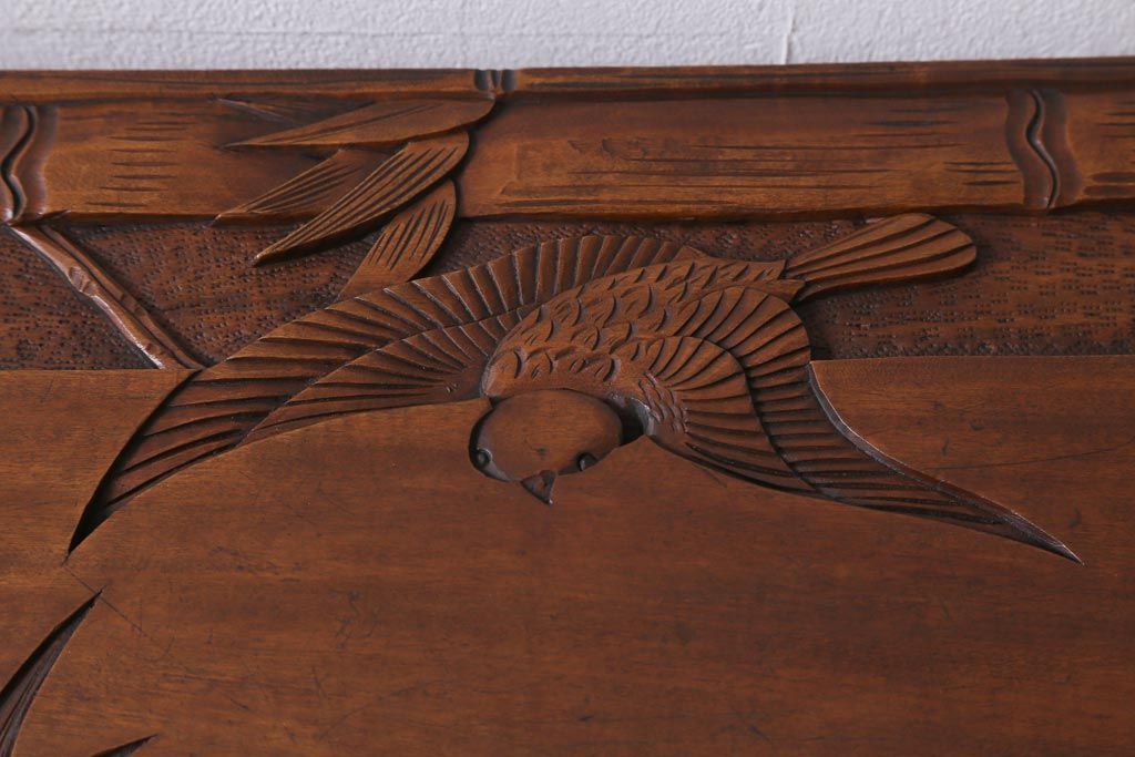ビンテージ家具 伝統工芸 日光彫り 竹と鳥の彫刻が印象的な飾り棚(茶棚、違い棚、オープンラック)(R-039272)です。