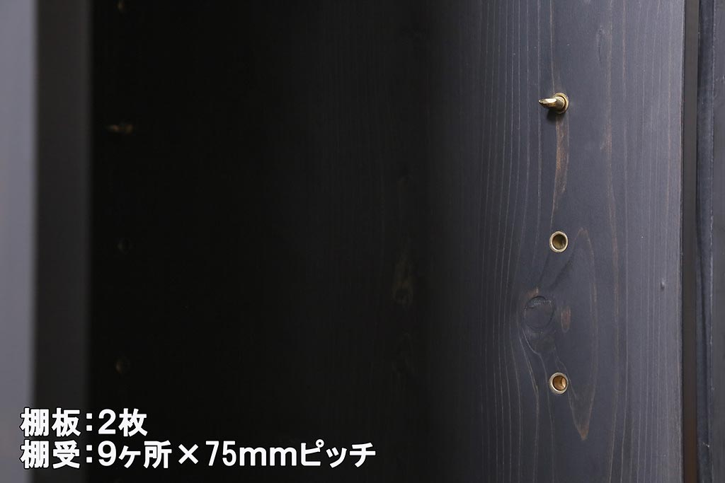 棚板は取り外しできます。棚板は2枚あります。棚受けは9ヶ所、75mmピッチで調整できます。棚幅サイズのものが1枚の作りです。