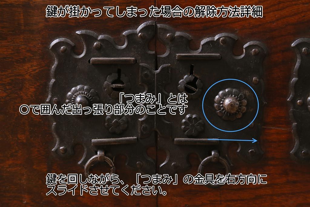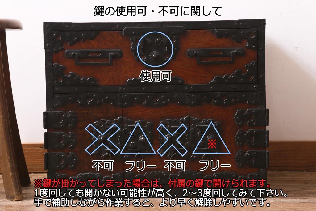 アンティーク商品では稀に引き出しや扉、つまみ等を動かすと鍵がかかる仕組みの商品があります。鍵閉じ込め防止のため、鍵は当該商品の引き出し、扉内ではなく別に保管してくださいますようお願い致します。右下扉のみ手を添えて補助すると動きます。