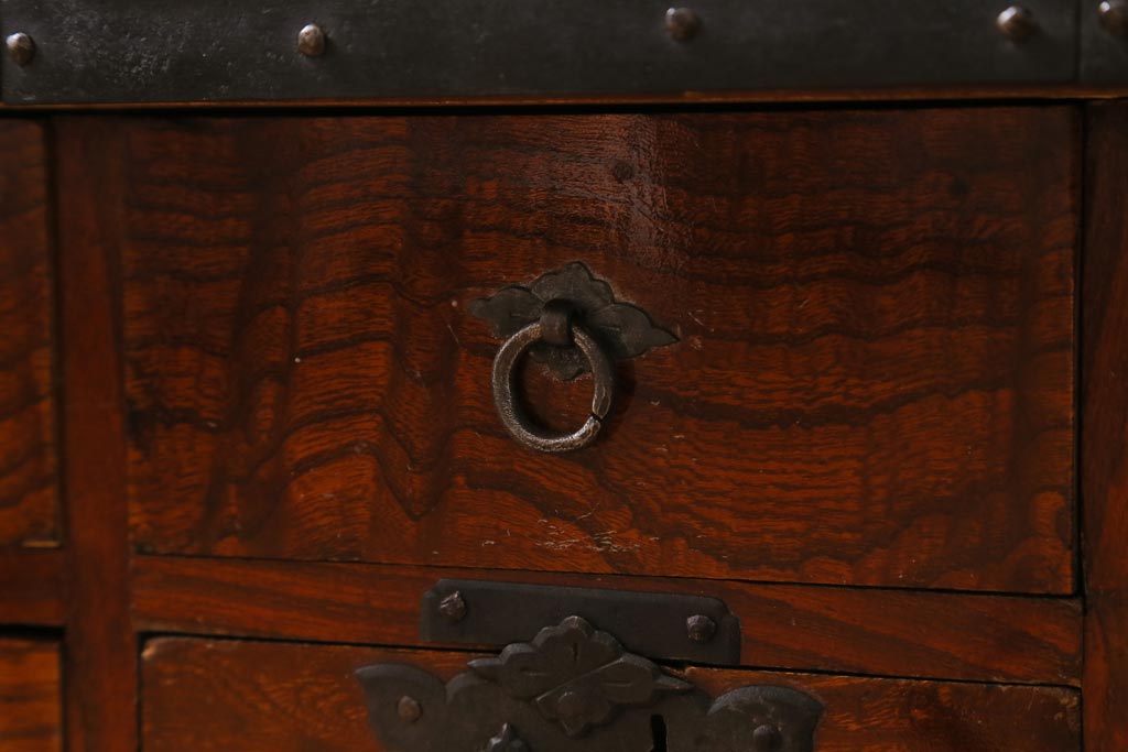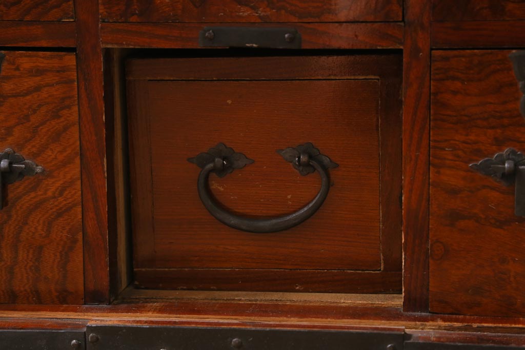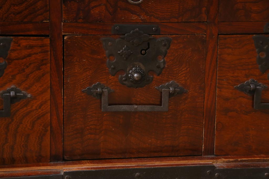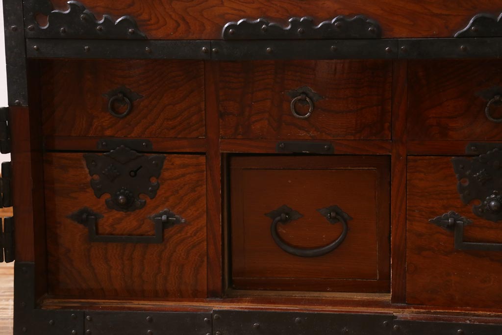 アンティーク家具 和製アンティーク 幕末明治初期 山形県酒田地方産 ケヤキ無垢材・中桐無垢材 前面玉杢 希少品! 船箪笥(帳箱、衣装箪笥、引き出し、チェスト)(R-039005)です。