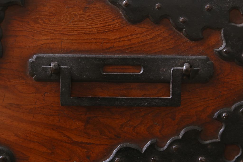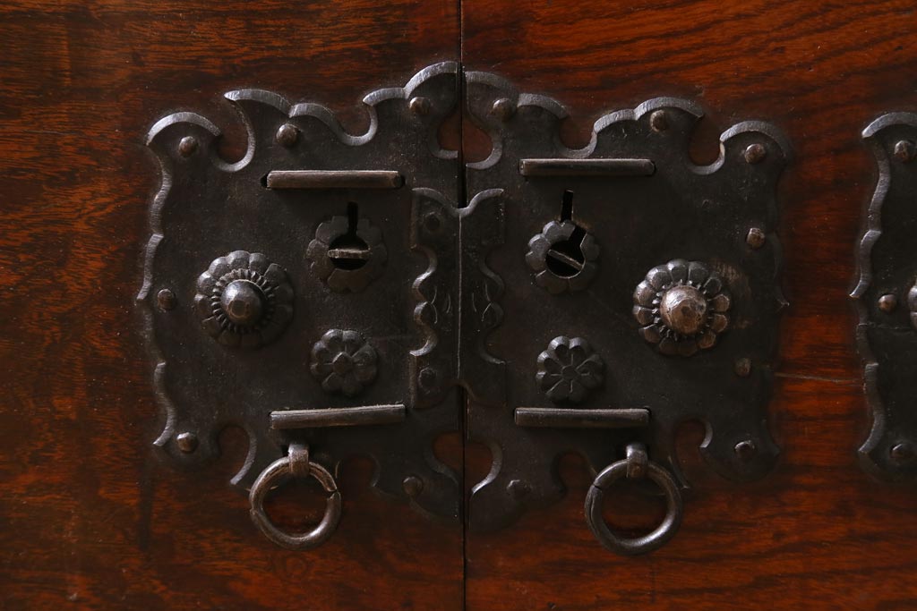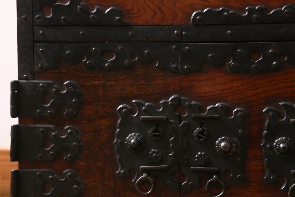 厚みのある黒々とした金具が前面の隅々にまで施され、