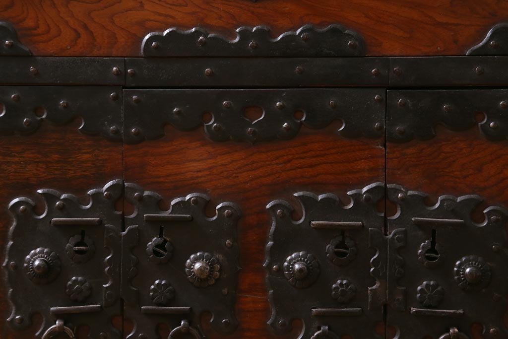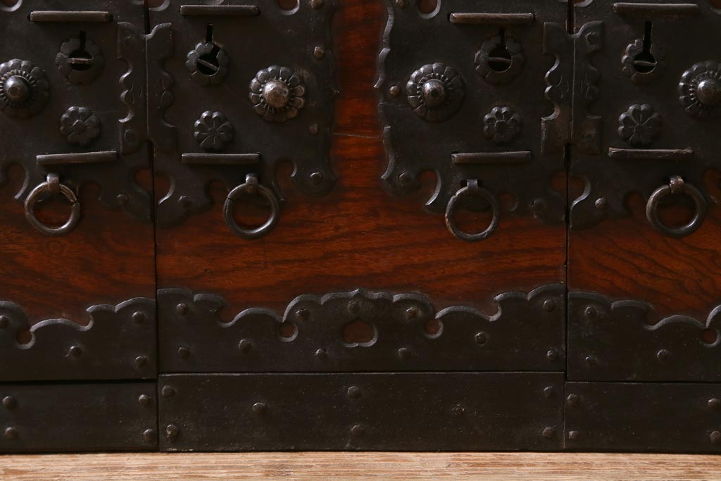 下段両側は開き戸、中央は摩戸(ずりど)になっています。奥の倹飩(けんどん)扉を外すと、かくしの銭函が忍ばせてあるからくりです。