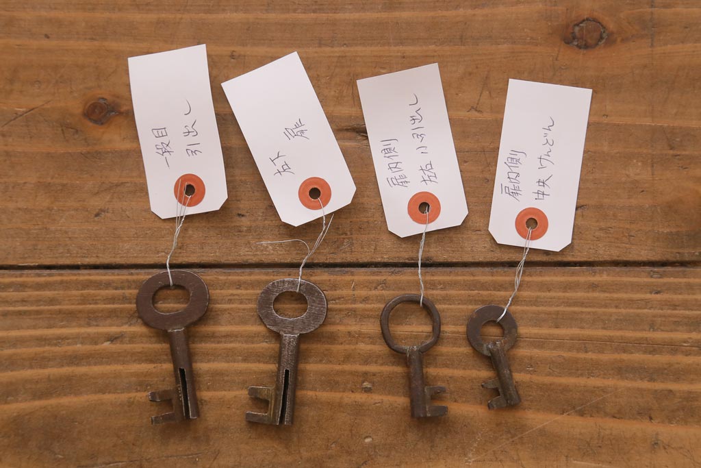 鍵は付属します。画像にありますように、袋に入れお付けします。スムーズに動くように調整していますが、あくまでも古いものや中古品ですので、長期の使用保証は出来かねます。ご購入後不具合が発生した場合は、当店でサポートさせていただきますので、お気軽にご相談くださいませ。