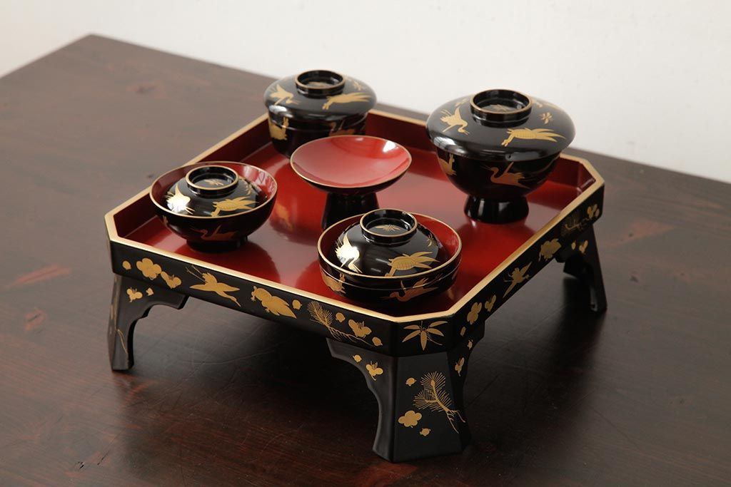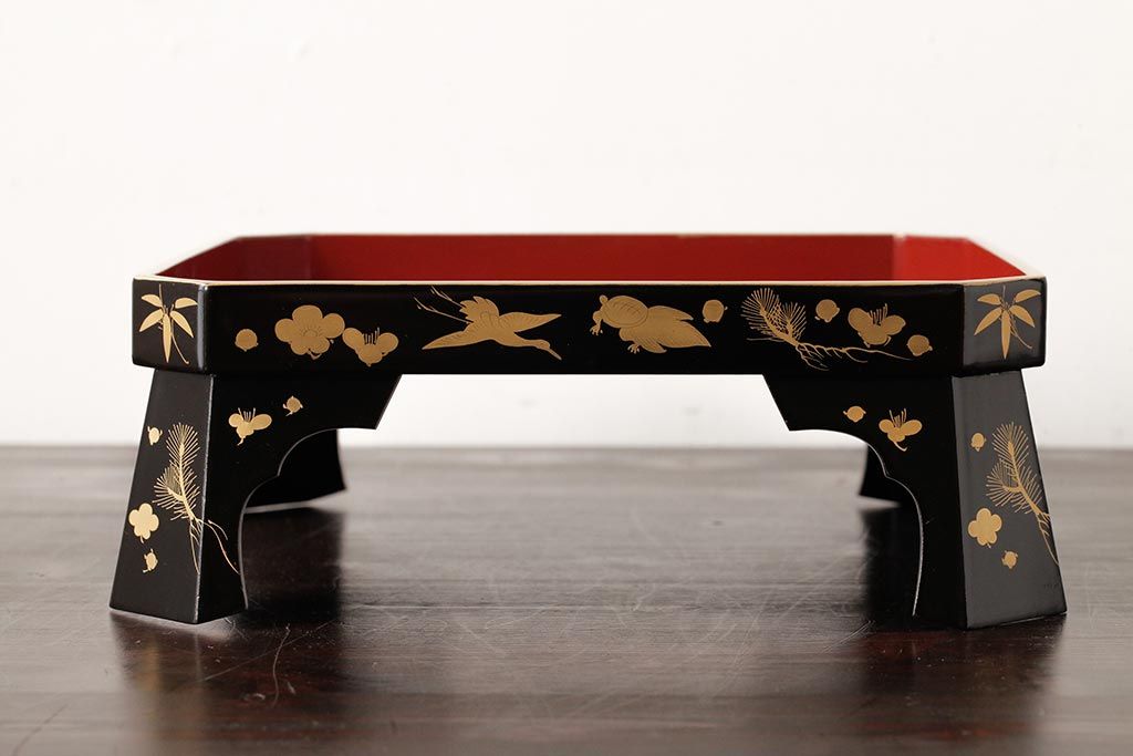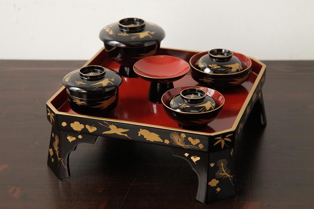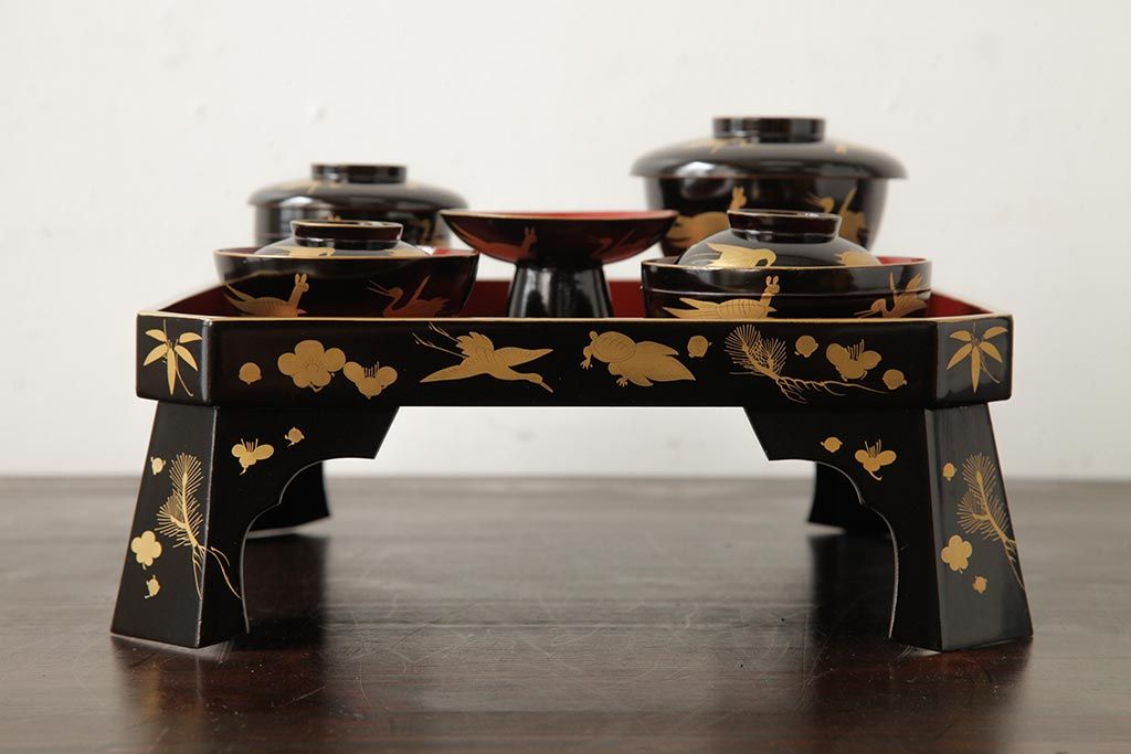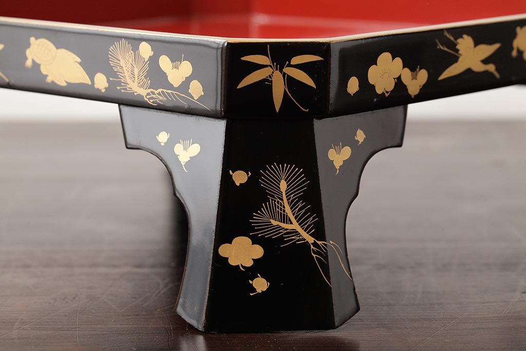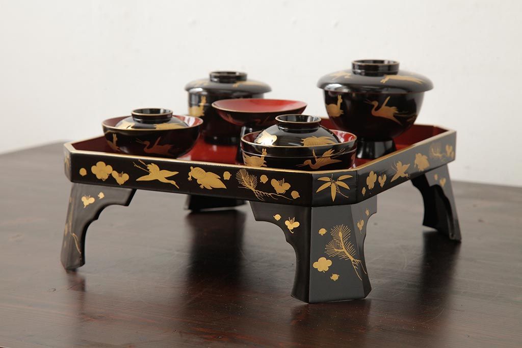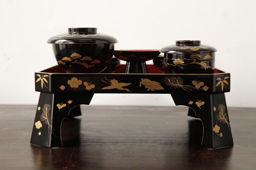ラフジュ工房> 和食器・茶道具> お盆・お膳・お重 > 極上 本手家具師 田中屋常蔵 黒内朱 金蒔絵 鶴亀 松竹梅 木製 仏膳セット 漆器(R-039315)