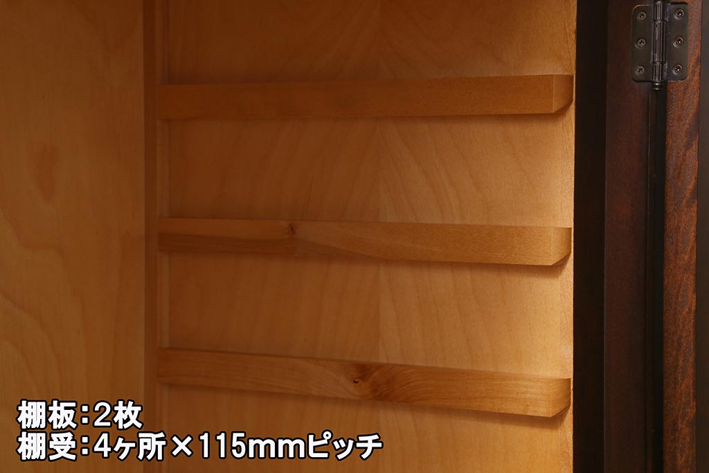 棚板は取り外しできます。棚板は2枚あります。棚受けは4ヶ所、115mmピッチで調整できます。棚幅サイズのものが1枚の作りです。