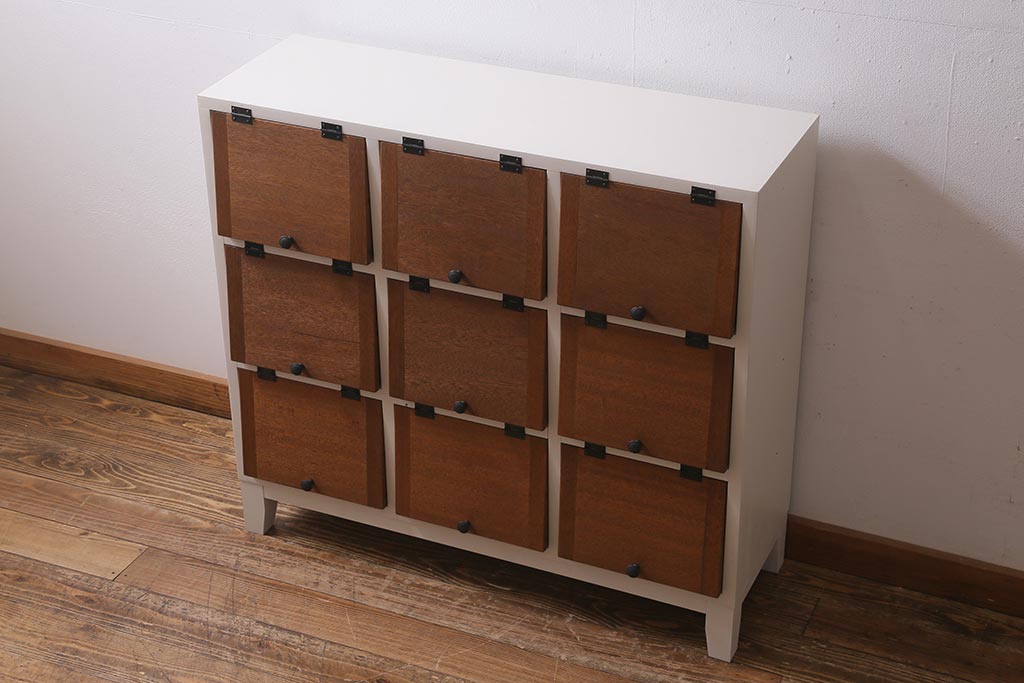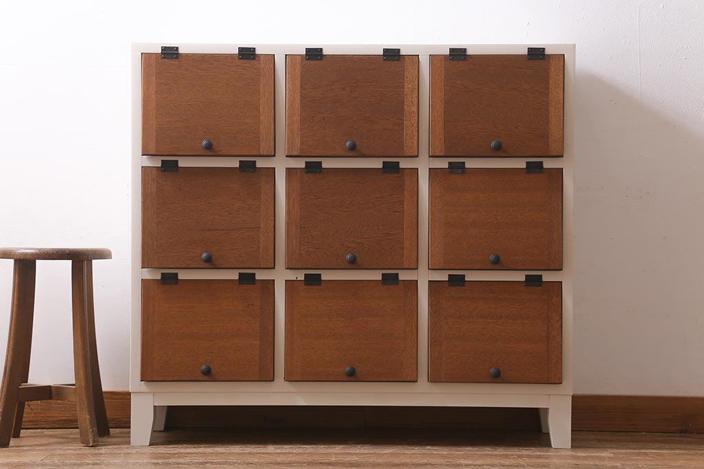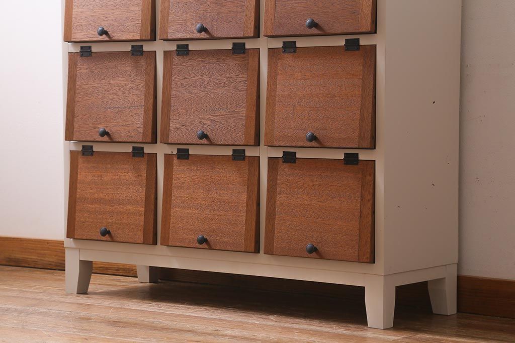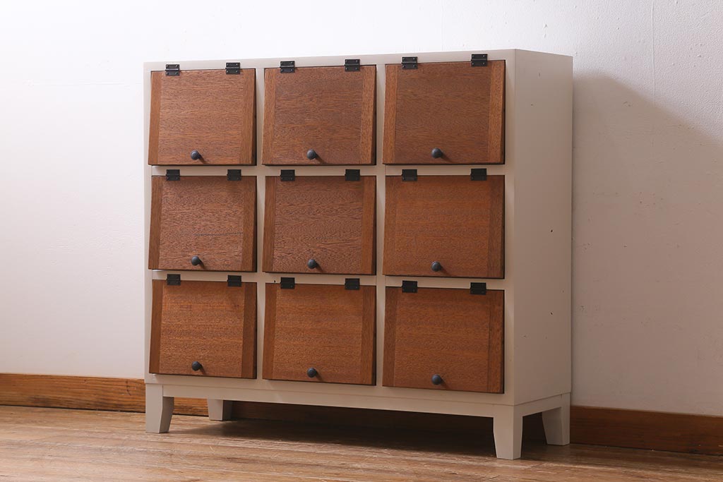キャビネット・戸棚> 下駄箱 > ラフジュ工房オリジナル 3×3マス 古材リメイク ペイント ヒノキ無垢材・ラワン古材 可愛らしいカラーのパタパタ扉付きマス目棚(収納棚、ロッカー、下駄箱)(R-039408)