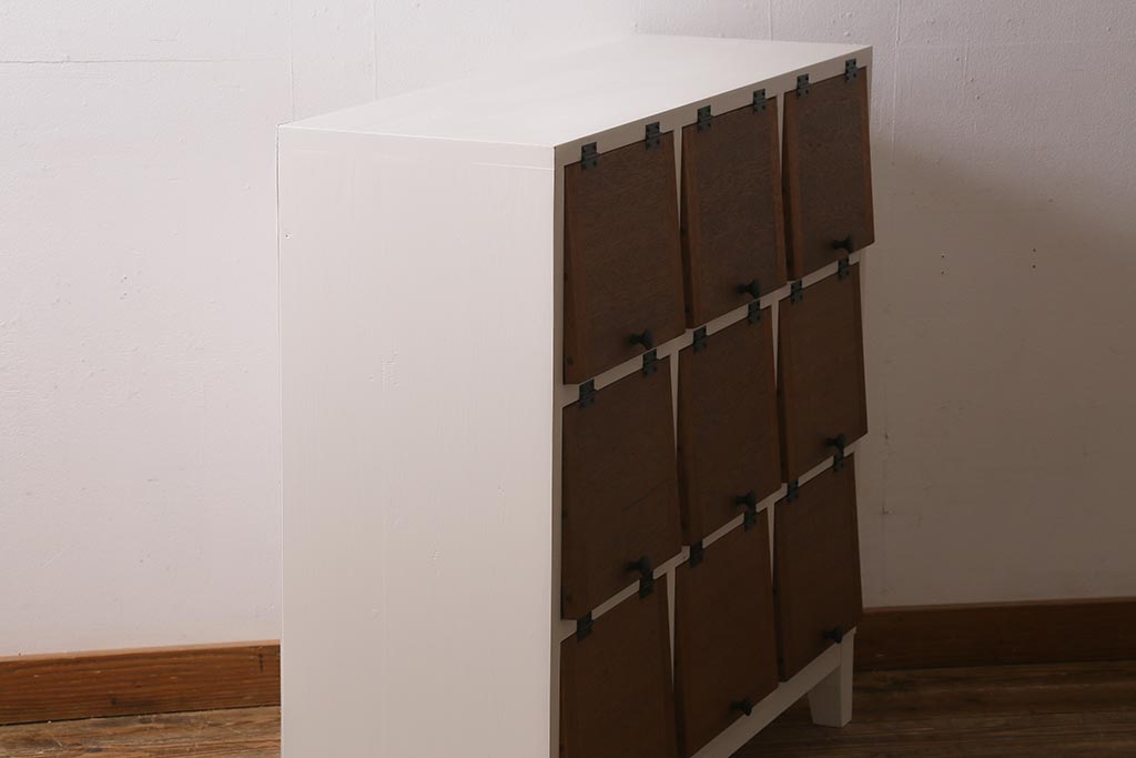 ラフジュ工房オリジナル 3×3マス 古材リメイク ペイント ヒノキ無垢材・ラワン古材 可愛らしいカラーのパタパタ扉付きマス目棚(収納棚、ロッカー、下駄箱)(R-039408)