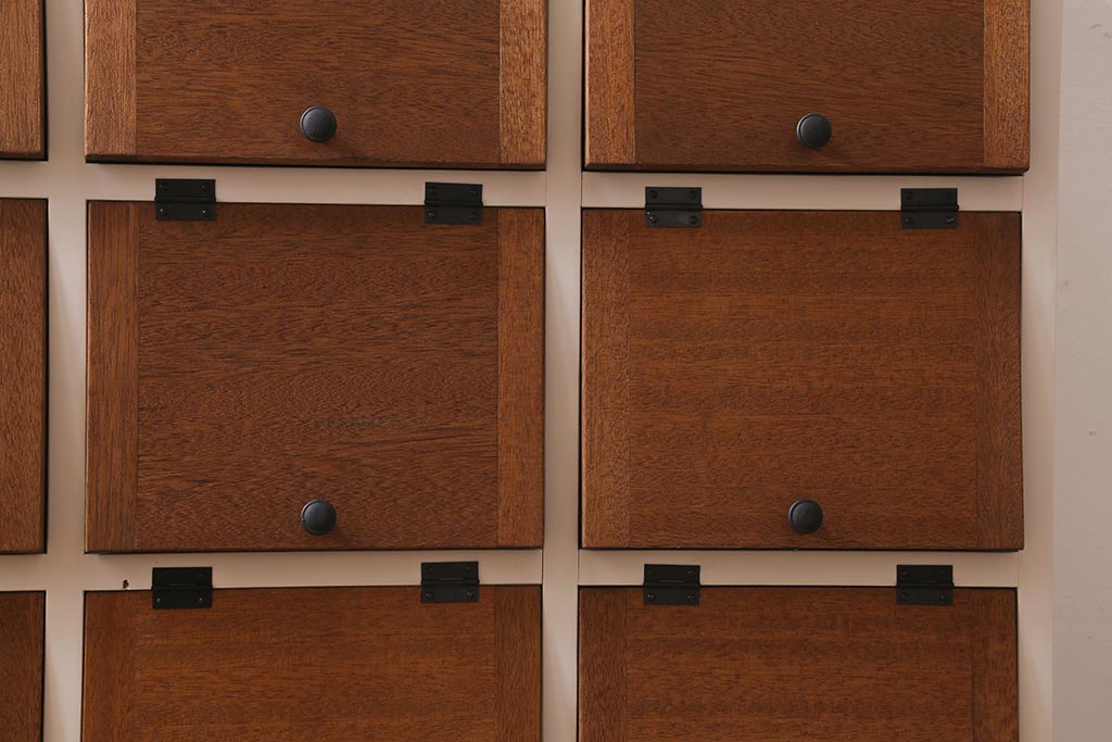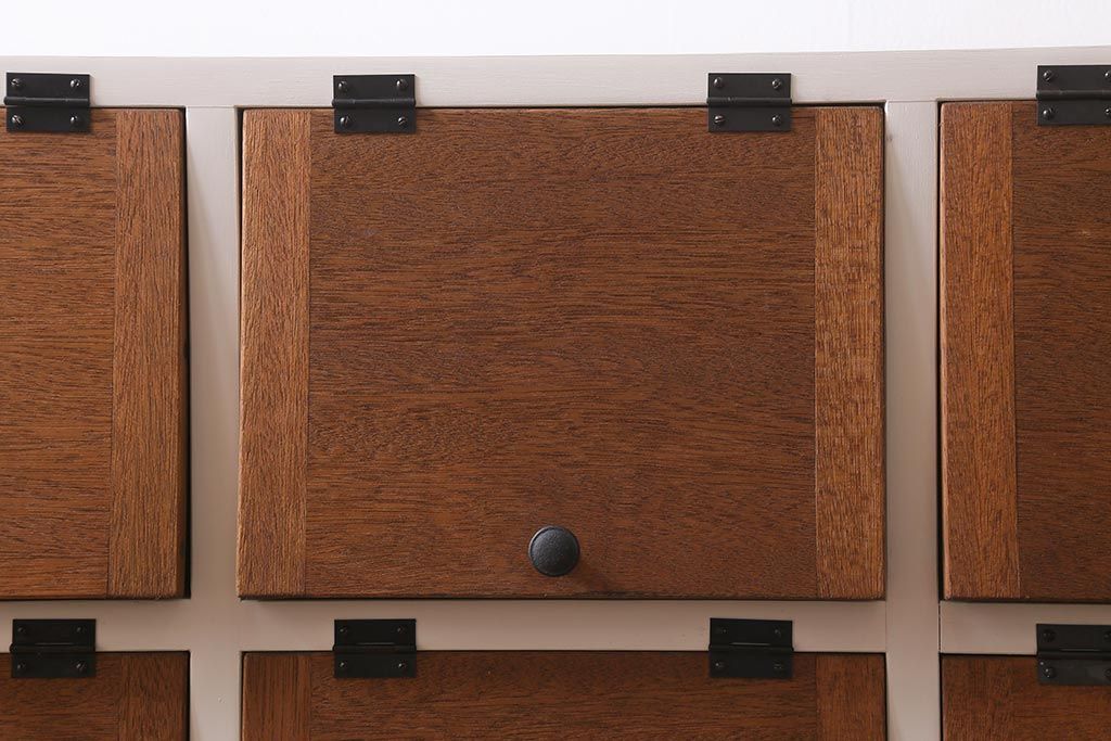 ワードローブ・ロッカー> ロッカー > ラフジュ工房オリジナル 3×3マス 古材リメイク ペイント ヒノキ無垢材・ラワン古材 可愛らしいカラーのパタパタ扉付きマス目棚(収納棚、ロッカー、下駄箱)(R-039408)