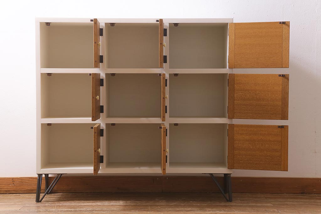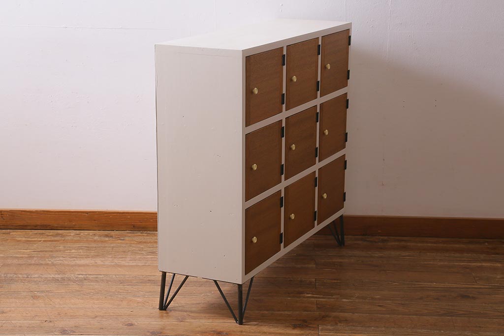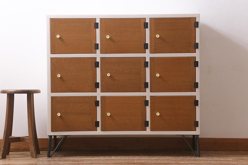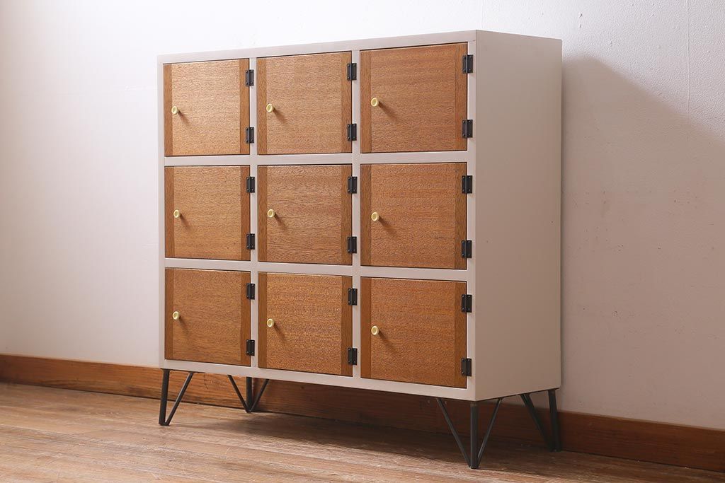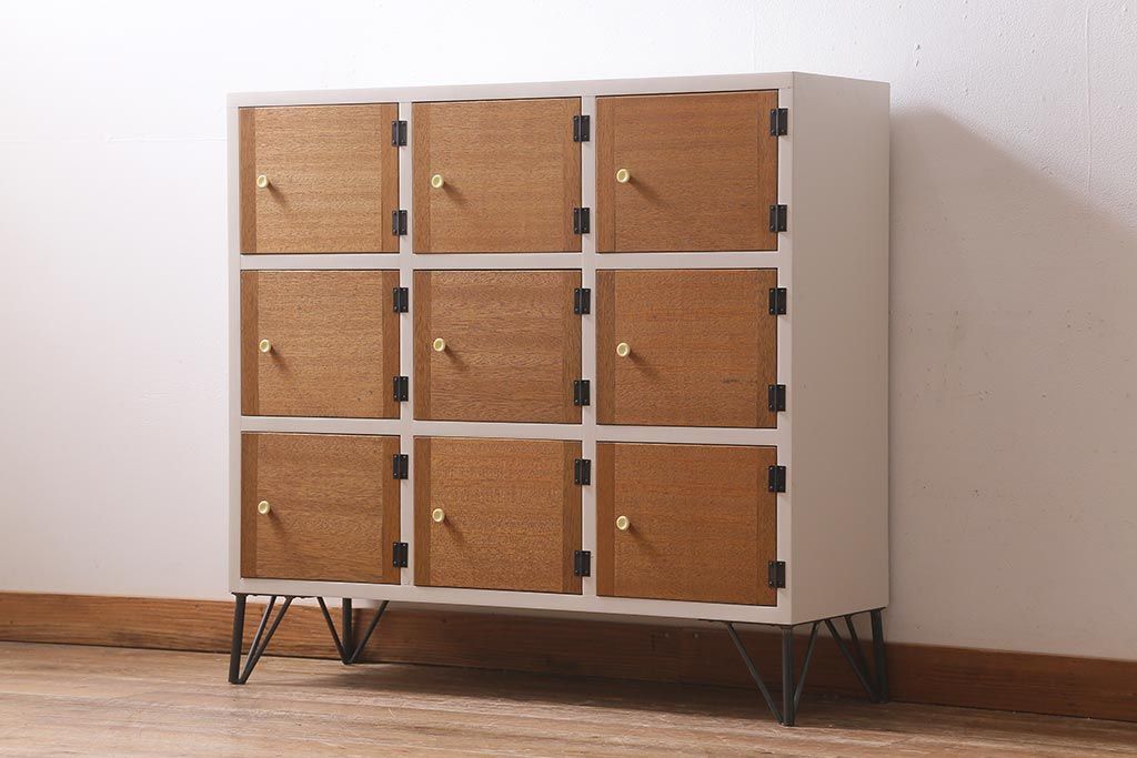 ワードローブ・ロッカー> ロッカー > ラフジュ工房オリジナル 3×3マス 古材リメイク ヒノキ無垢材・ラワン古材 メンズライクにも似合う鉄脚付きのペイントマス目棚・右開き(収納棚、ロッカー、下駄箱)(R-039407)