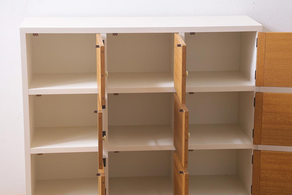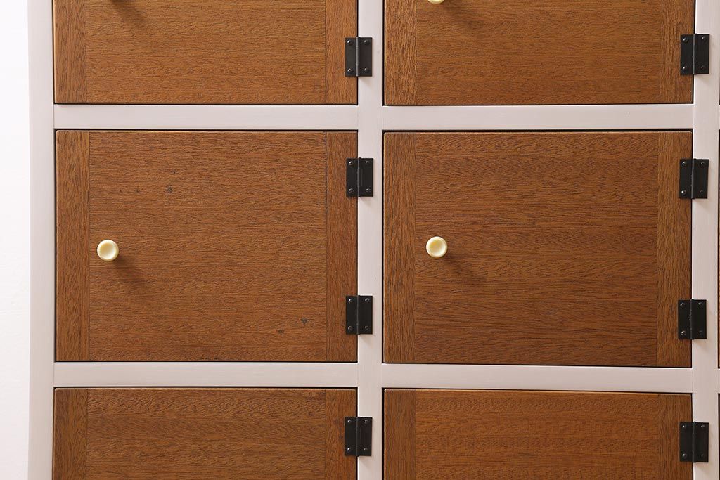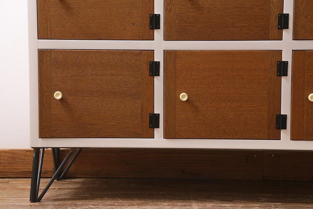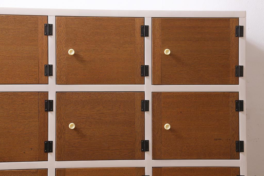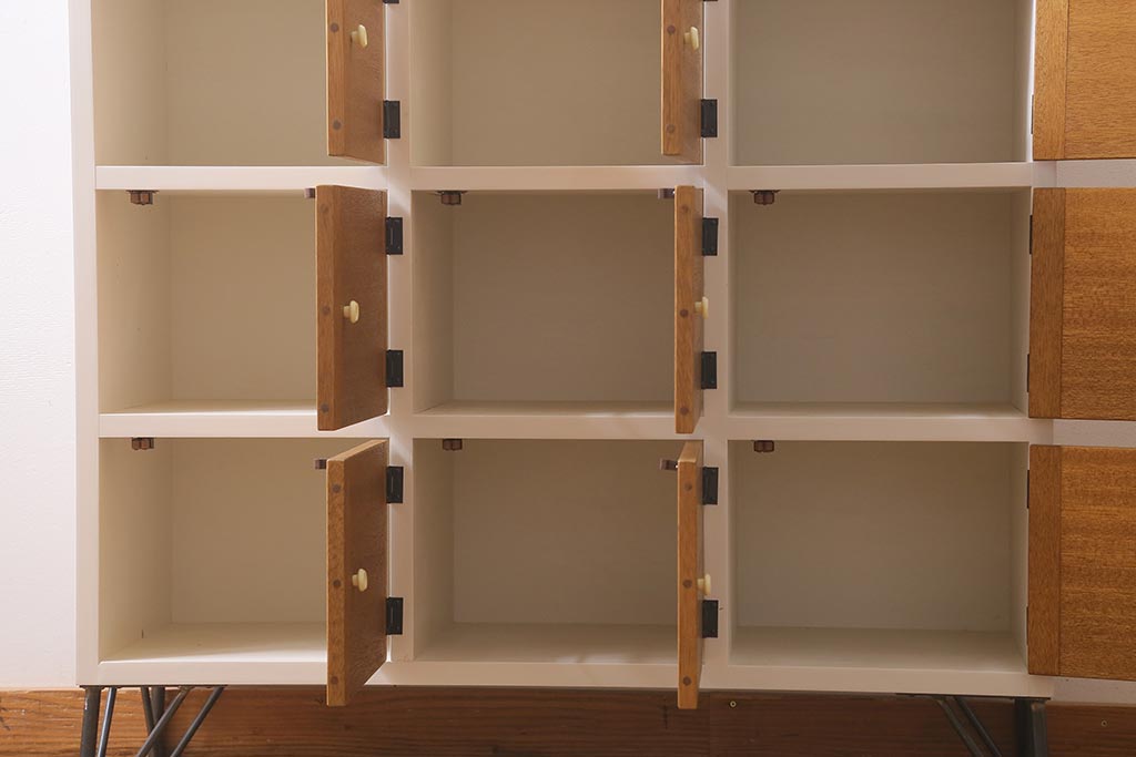 ワードローブ・ロッカー> ロッカー > ラフジュ工房オリジナル 3×3マス 古材リメイク ヒノキ無垢材・ラワン古材 メンズライクにも似合う鉄脚付きのペイントマス目棚・右開き(収納棚、ロッカー、下駄箱)(R-039407)