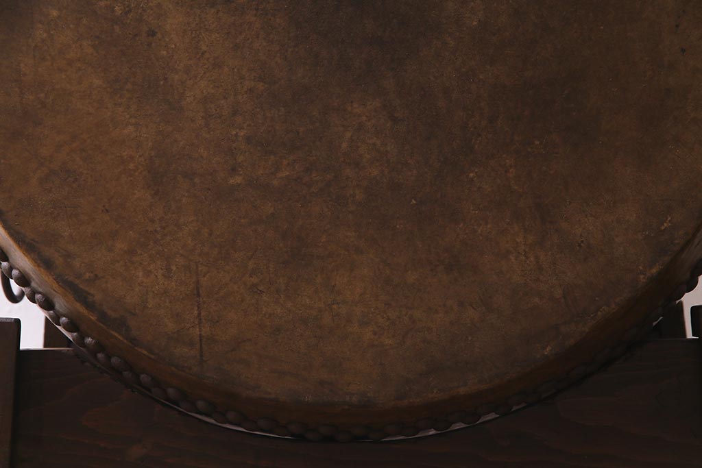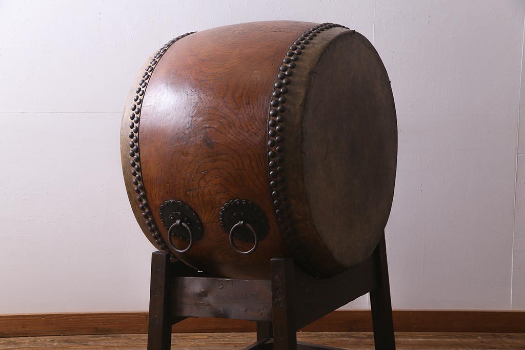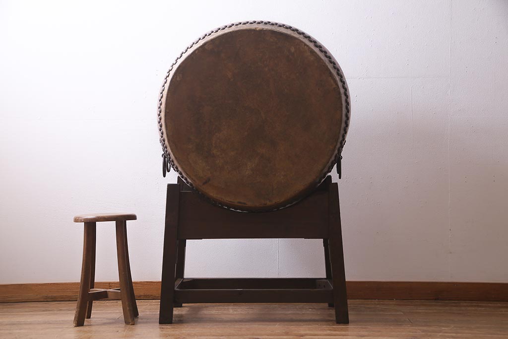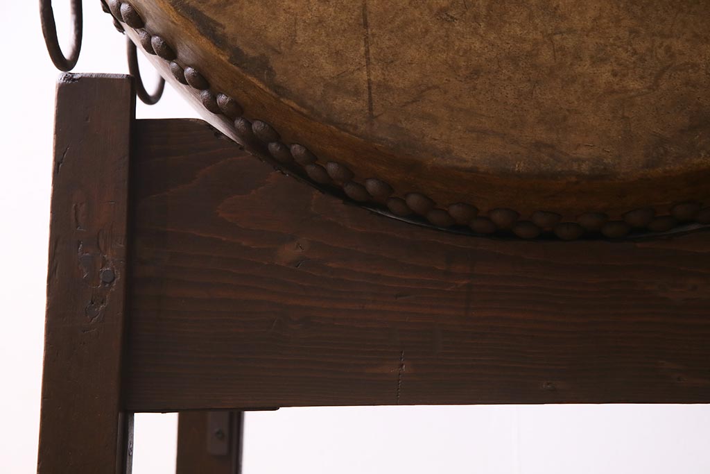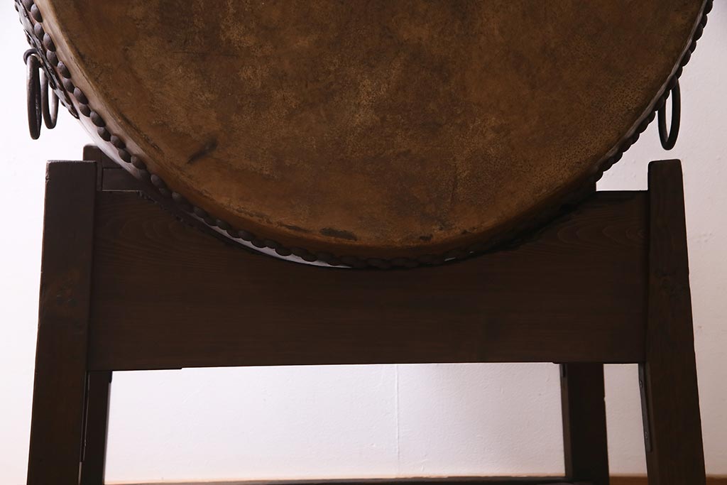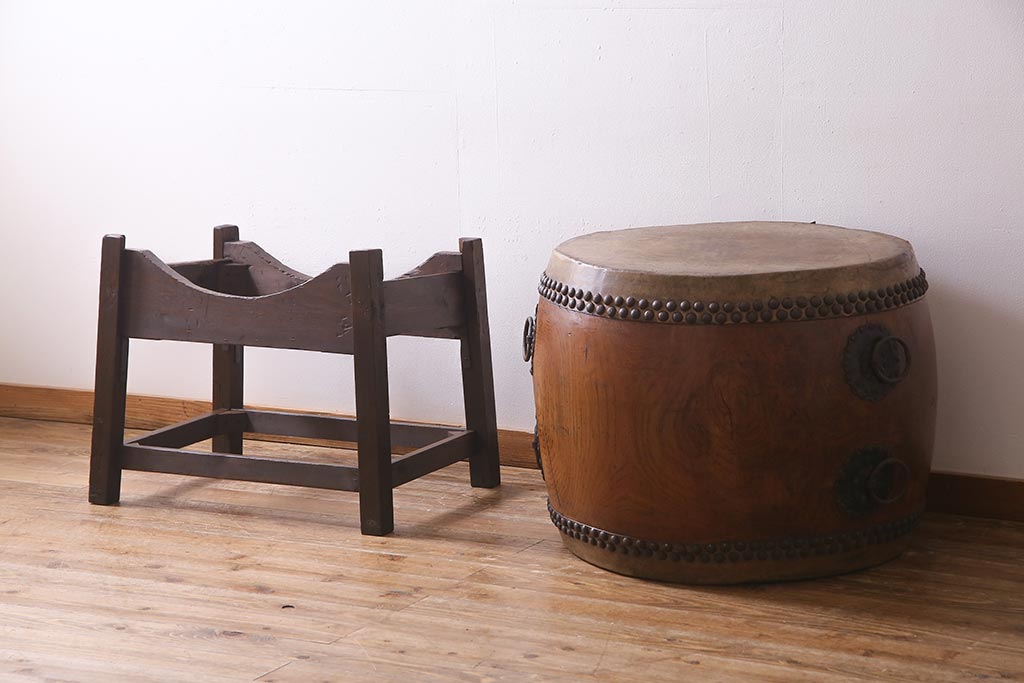 和楽器 2尺4寸 欅(ケヤキ) 古い刳り貫き太鼓・太鼓台付き(くり貫き太鼓、和太鼓)(R-038269)