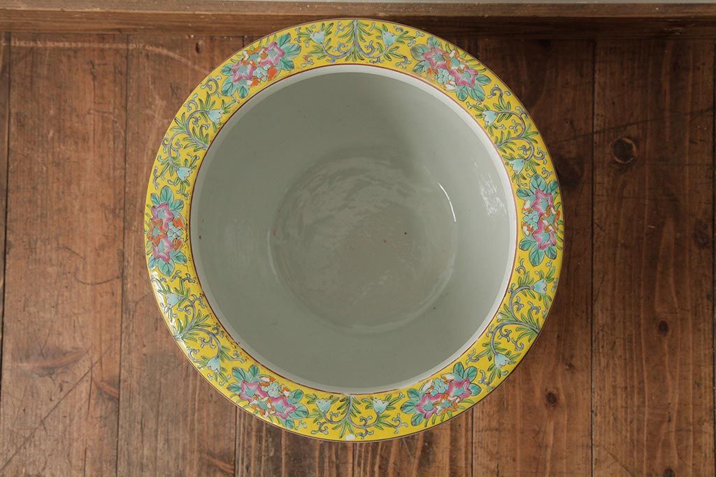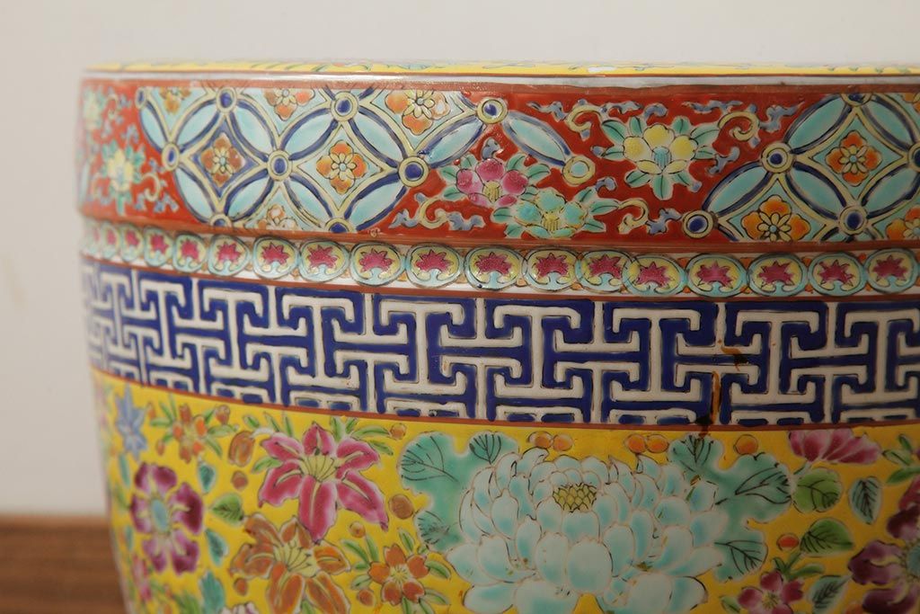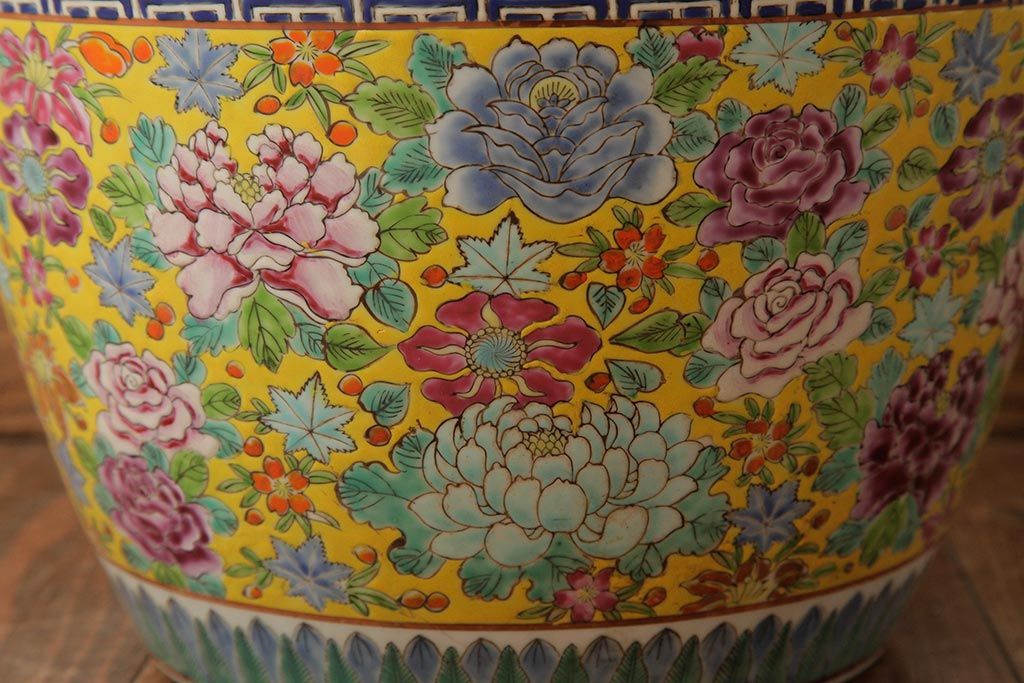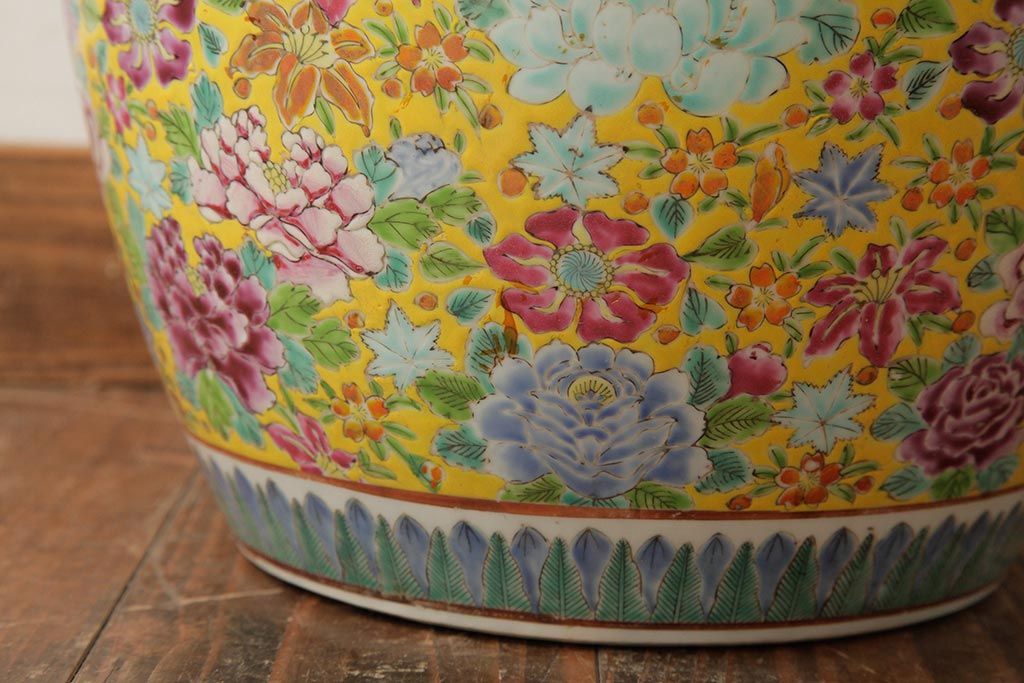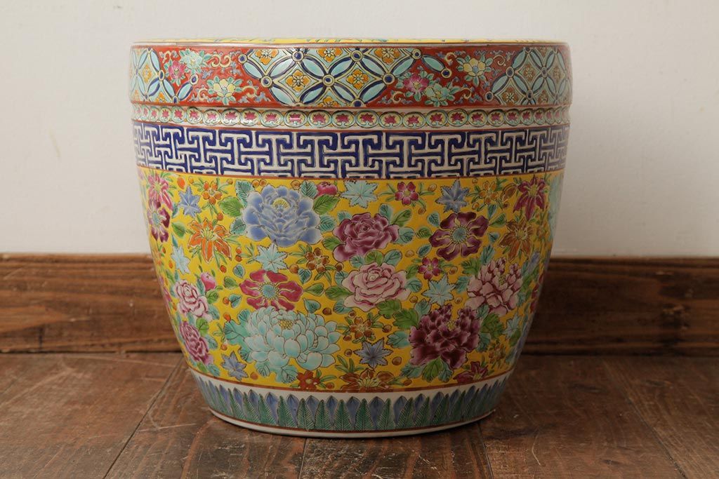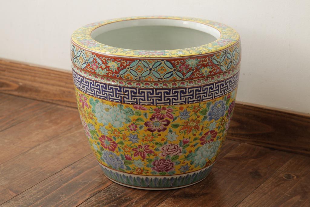 アンティーク雑貨 花々の図が鮮やかな十錦手火鉢(瀬戸火鉢)(R-039484)