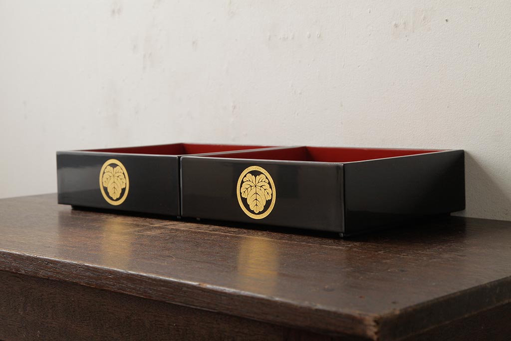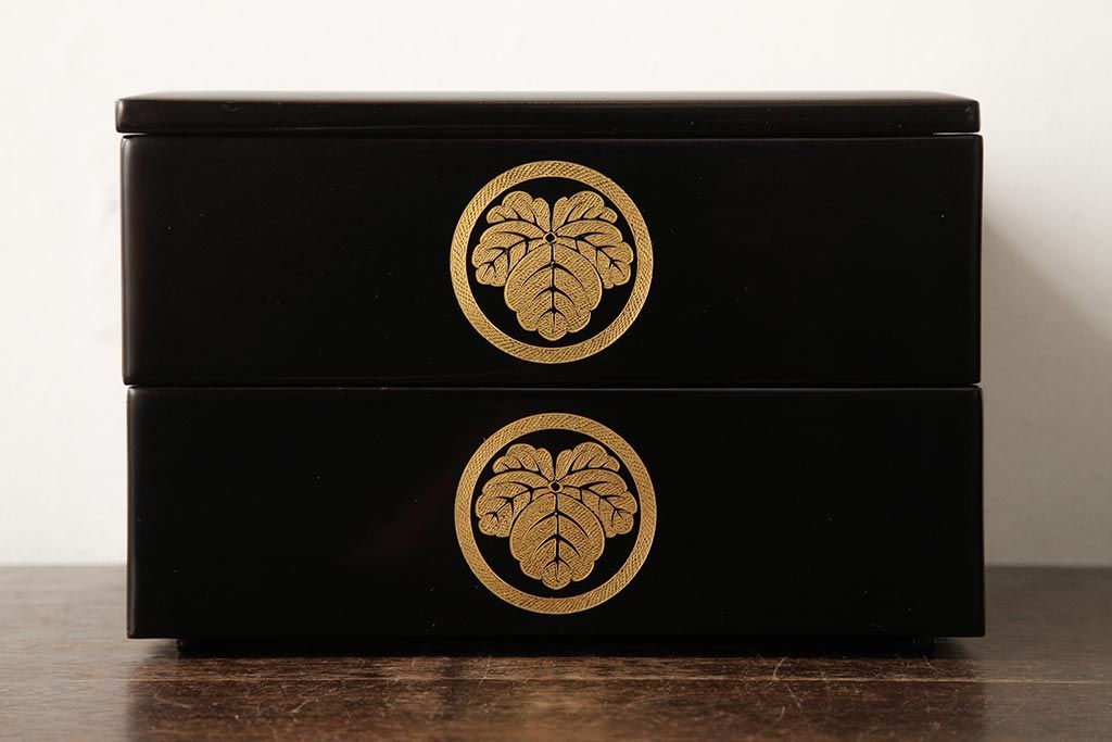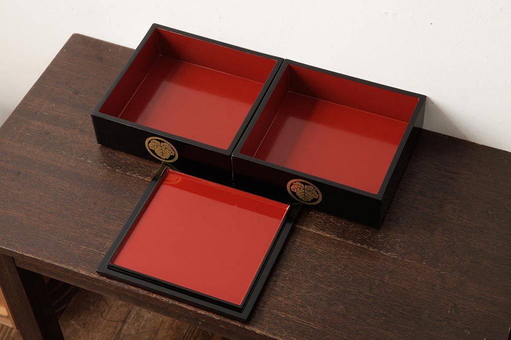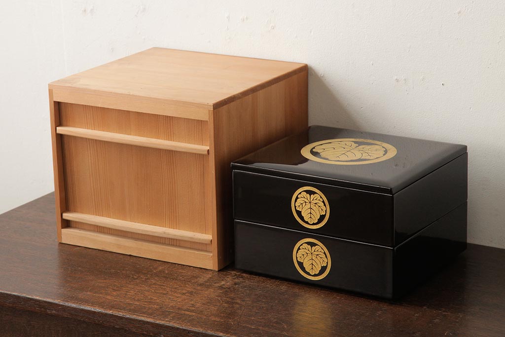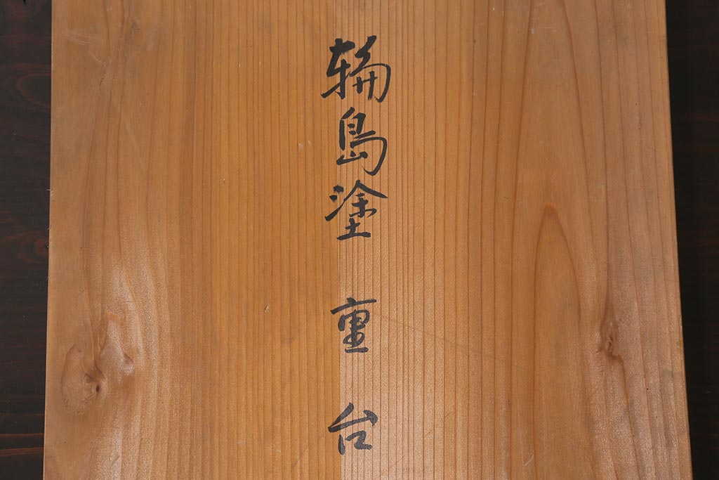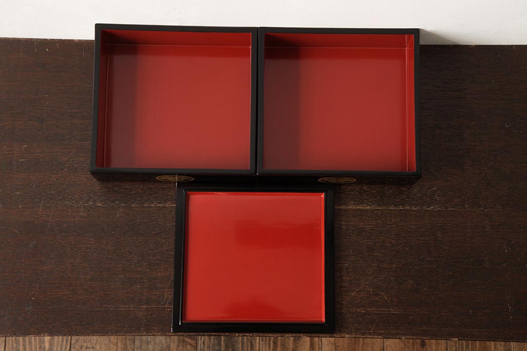アンティーク雑貨 伝統工芸 輪島塗 漆塗り 共箱 蔦紋重箱・台付き(お重、重台、漆器)(R-039307)