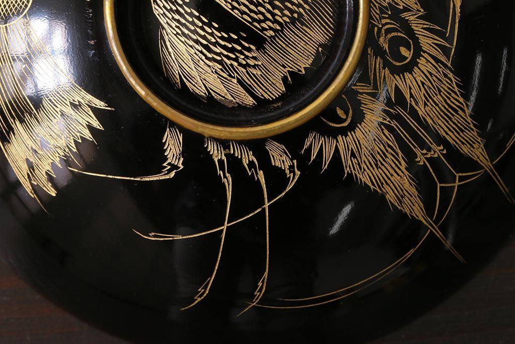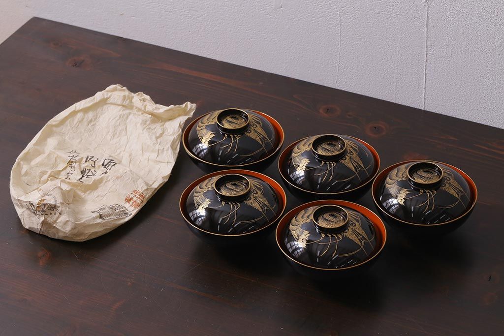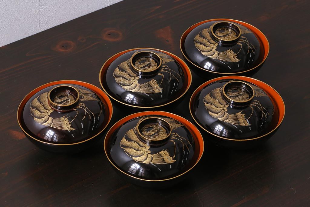 アンティーク雑貨 和製アンティーク 漆器 迫力ある海老の図柄が描かれた木製椀5客セット(和食器)(R-039465)