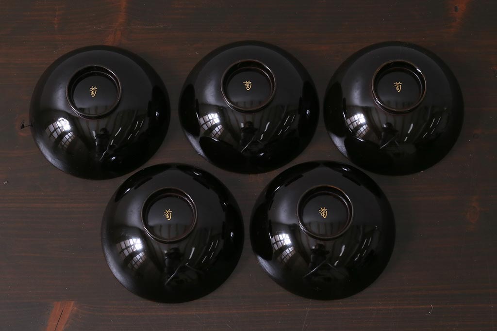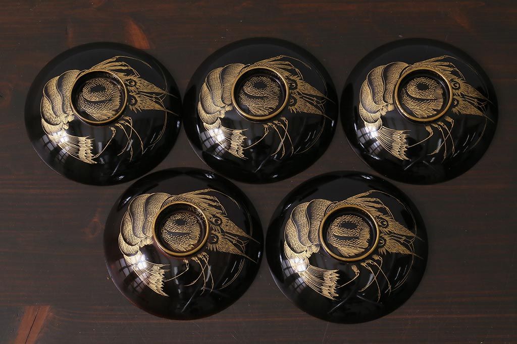 アンティーク雑貨 和製アンティーク 漆器 迫力ある海老の図柄が描かれた木製椀5客セット(和食器)(R-039463)