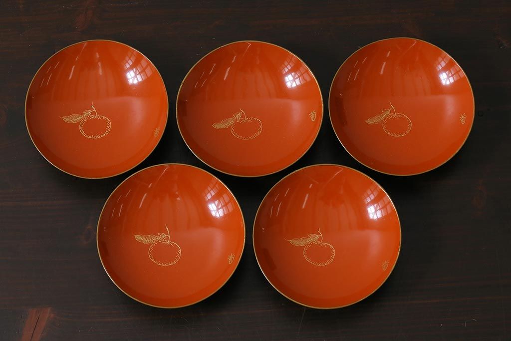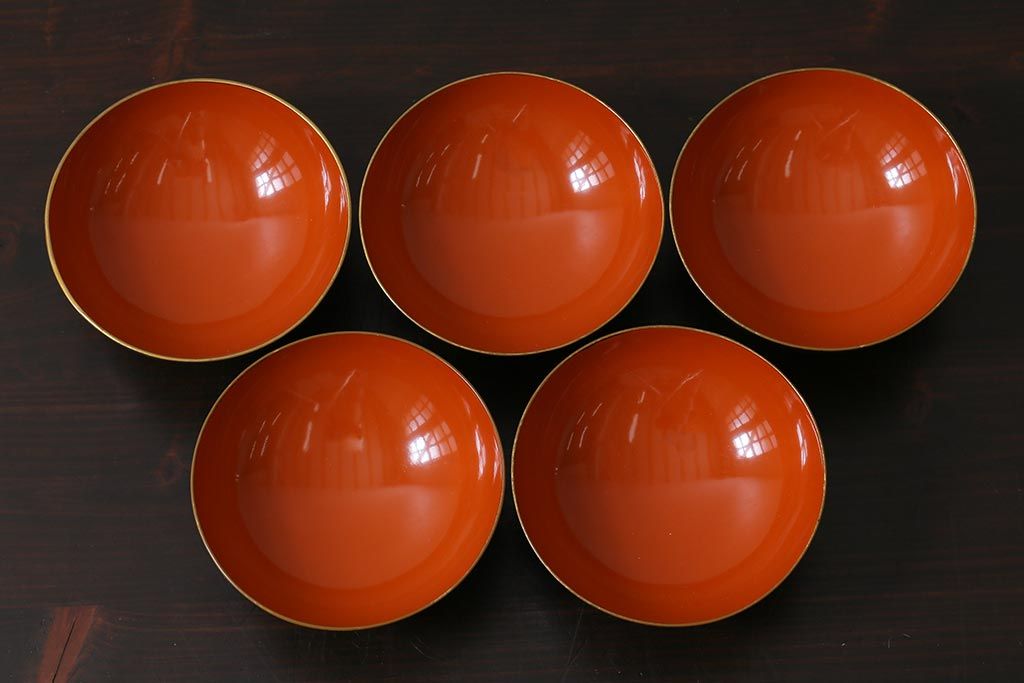 ラフジュ工房> 骨董・美術品> 骨董-漆器 > アンティーク雑貨 和製アンティーク 漆器 迫力ある海老の図柄が描かれた木製椀5客セット(和食器)(R-039463)