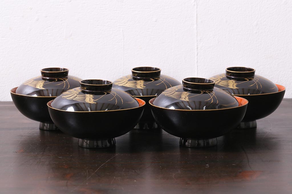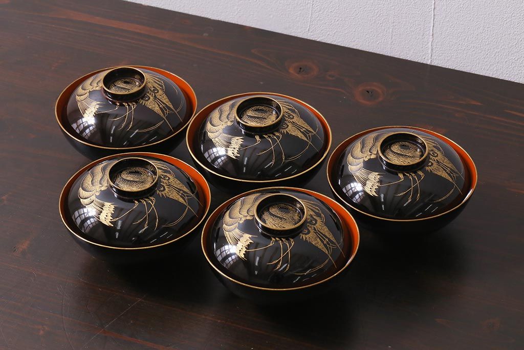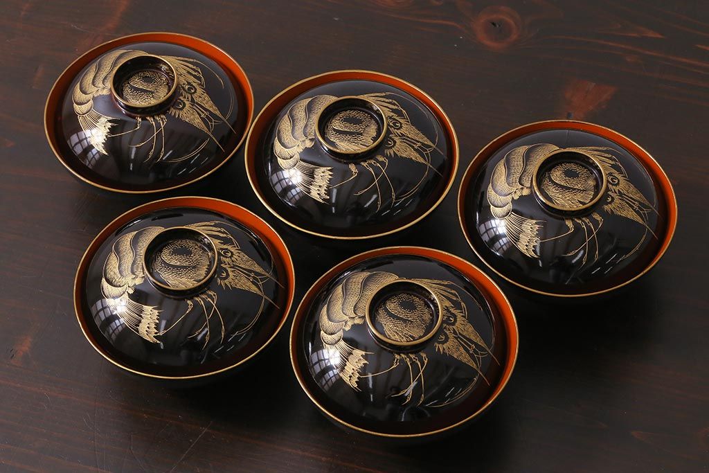 アンティーク雑貨 和製アンティーク 漆器 迫力ある海老の図柄が描かれた木製椀5客セット(和食器)(R-039464)
