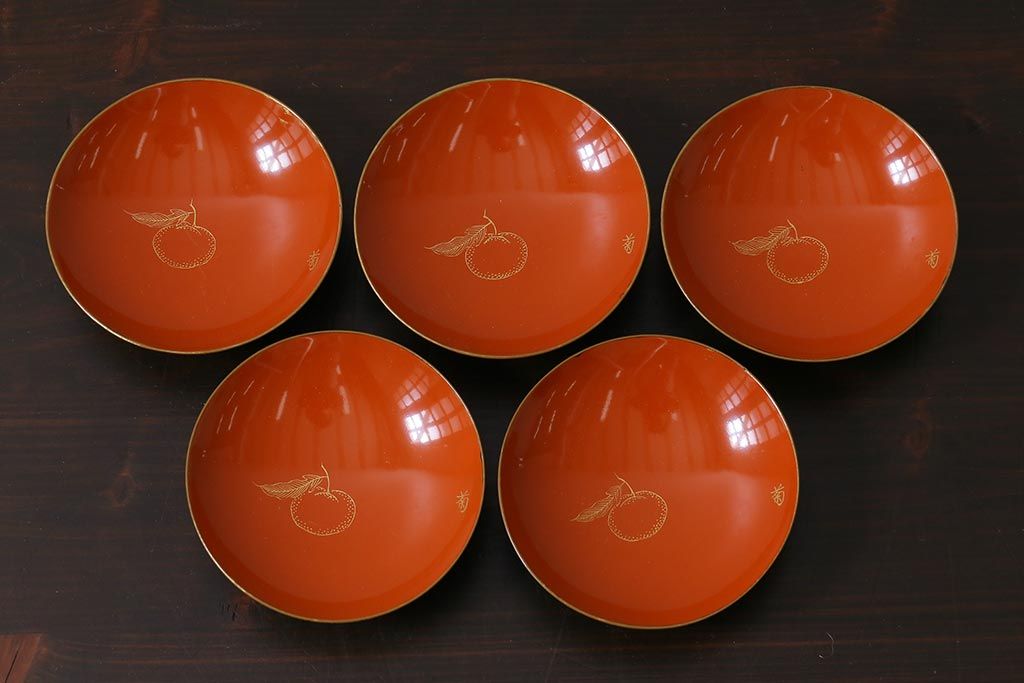 ラフジュ工房> 骨董・美術品> 骨董-漆器 > アンティーク雑貨 和製アンティーク 漆器 迫力ある海老の図柄が描かれた木製椀5客セット(和食器)(R-039464)