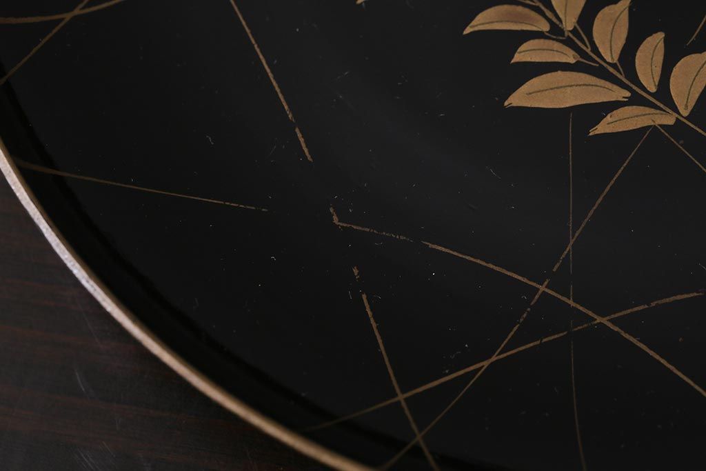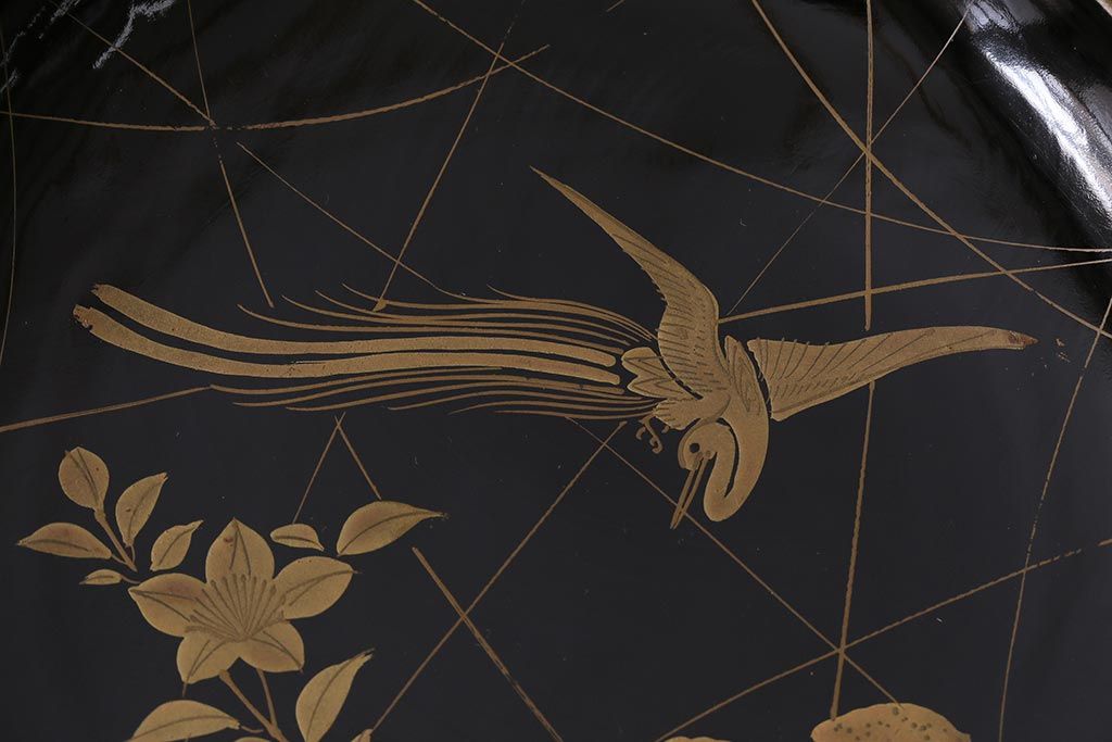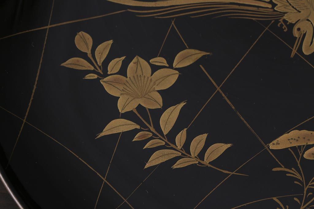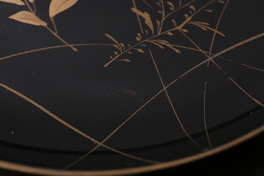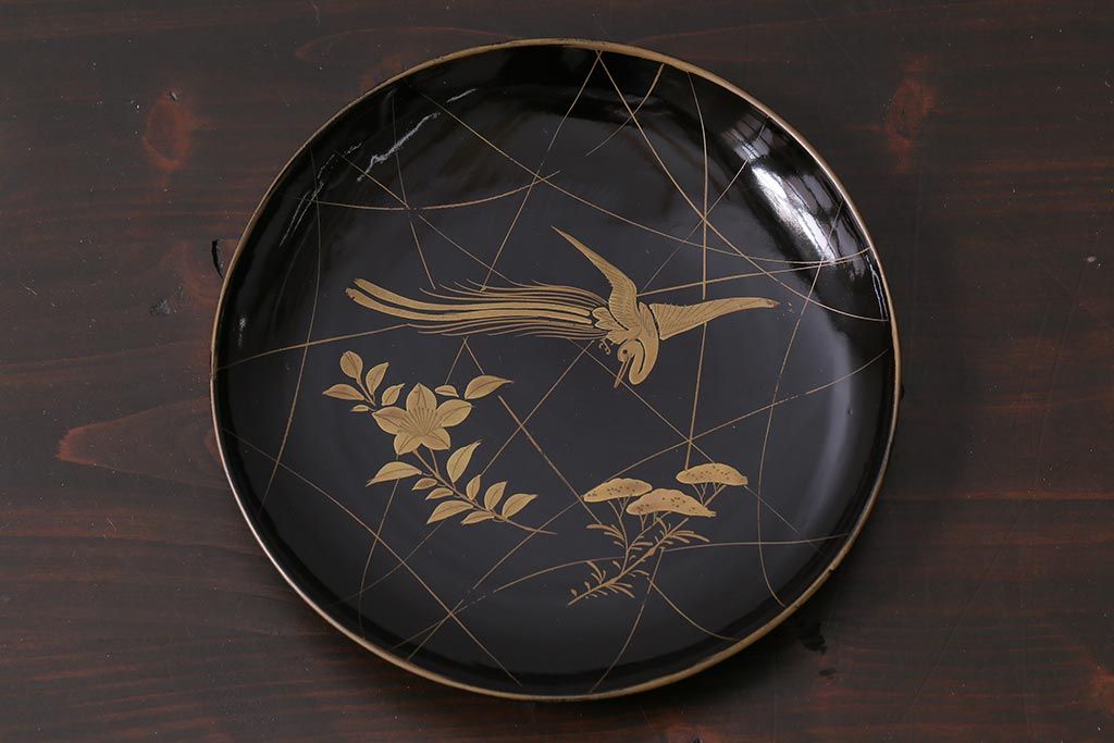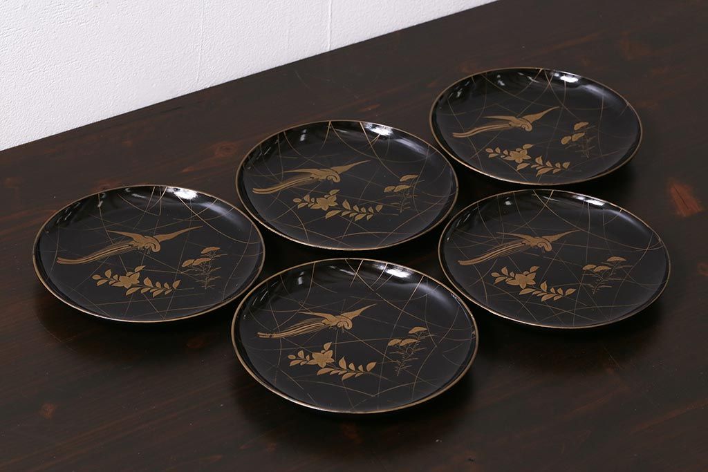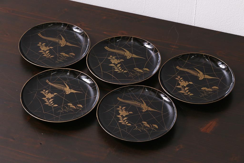 アンティーク雑貨 和製アンティーク 5.6寸桔梗鳥蒔絵木製菓子皿5枚セット(木皿、漆器)(R-039368)