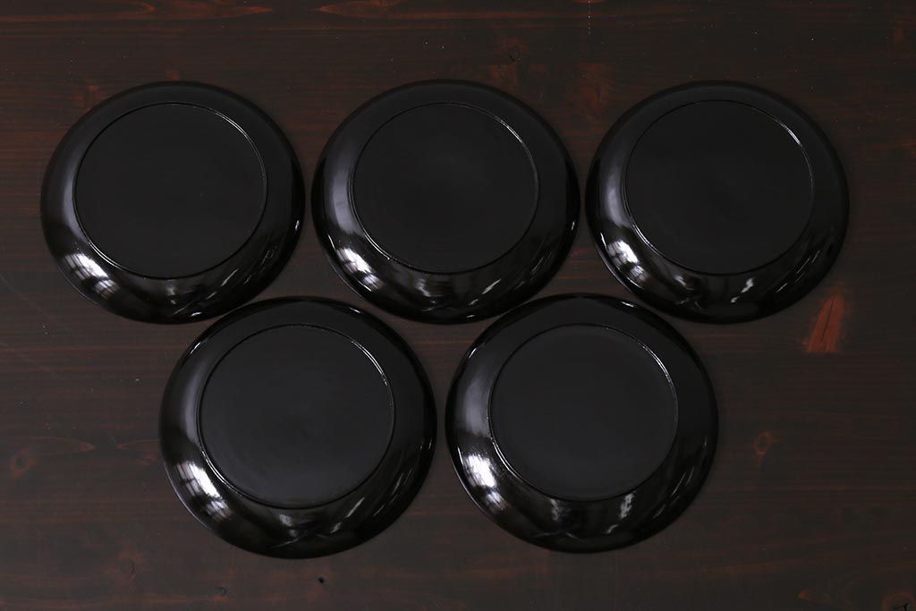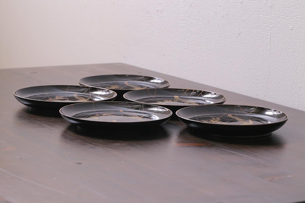 ラフジュ工房> 和食器・茶道具> 皿 > アンティーク雑貨 和製アンティーク 5.6寸桔梗鳥蒔絵木製菓子皿5枚セット(木皿、漆器)(R-039368)