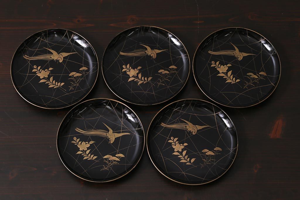 ラフジュ工房> 骨董・美術品> 骨董-漆器 > アンティーク雑貨 和製アンティーク 5.6寸桔梗鳥蒔絵木製菓子皿5枚セット(木皿、漆器)(R-039368)