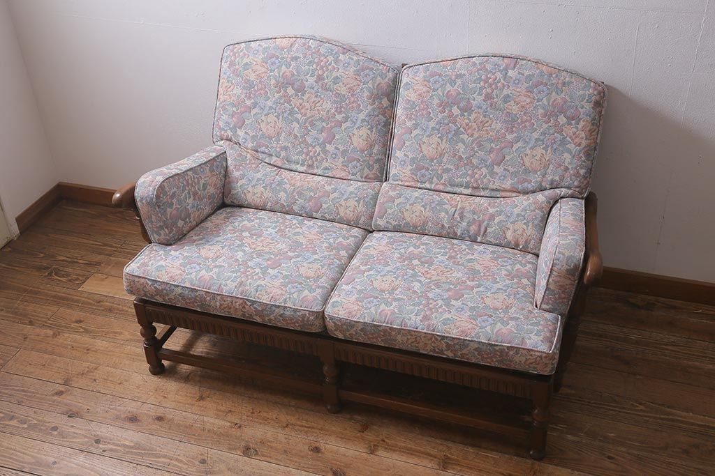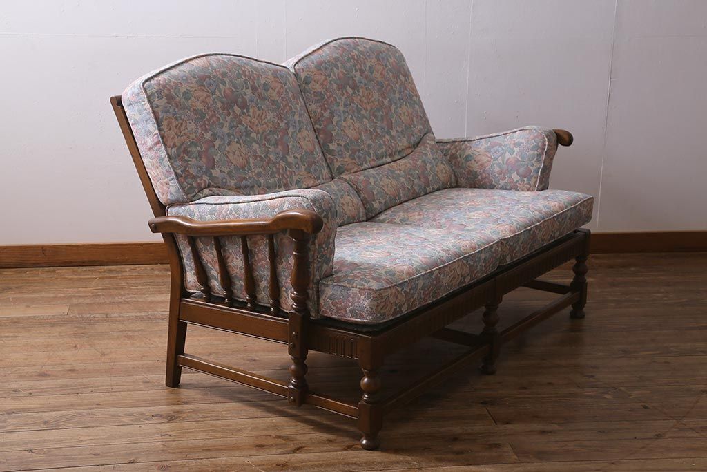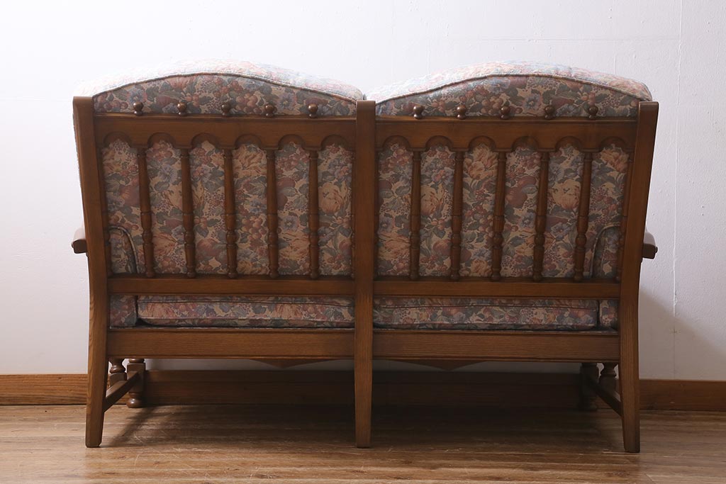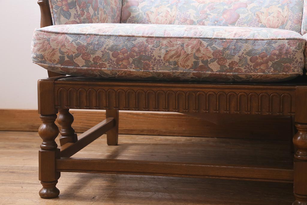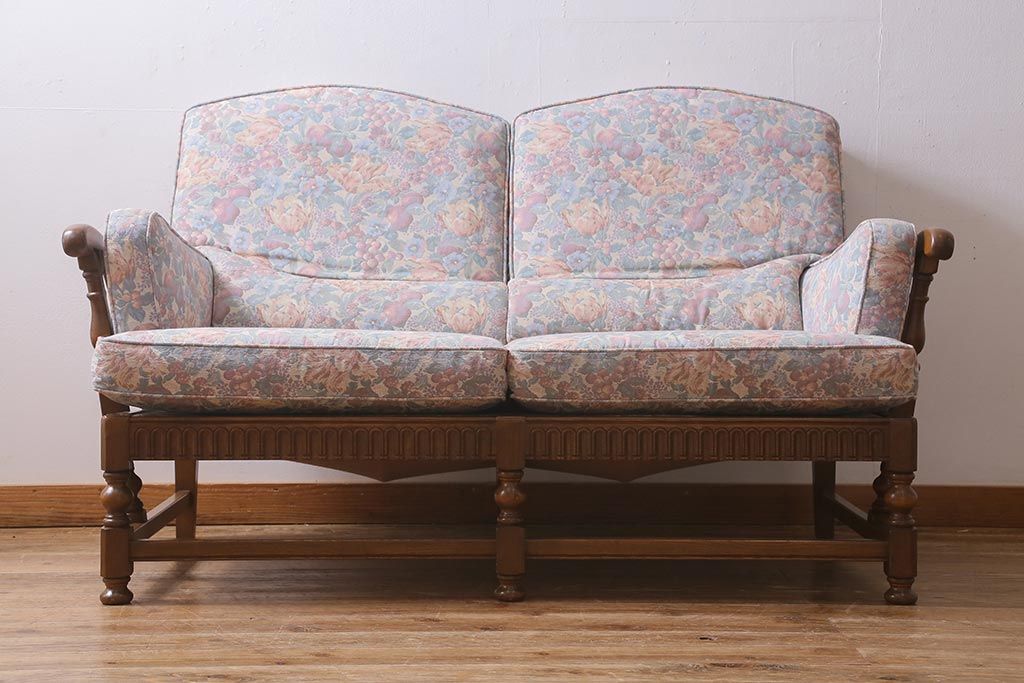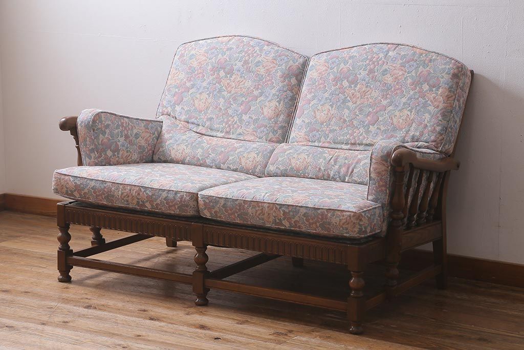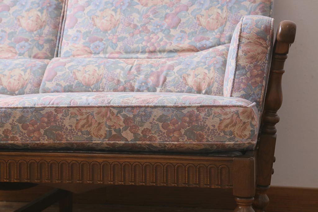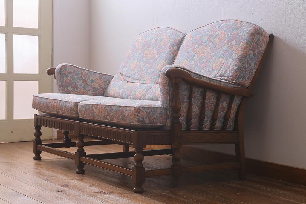 ヴィンテージ家具 美品 ERCOL(アーコール) York Minster(ヨーク・ミンスター) 淡い色味の花柄ファブリックがお洒落な2人掛けソファ(アームソファ、ラブソファ、ビンテージ)(R-039470)