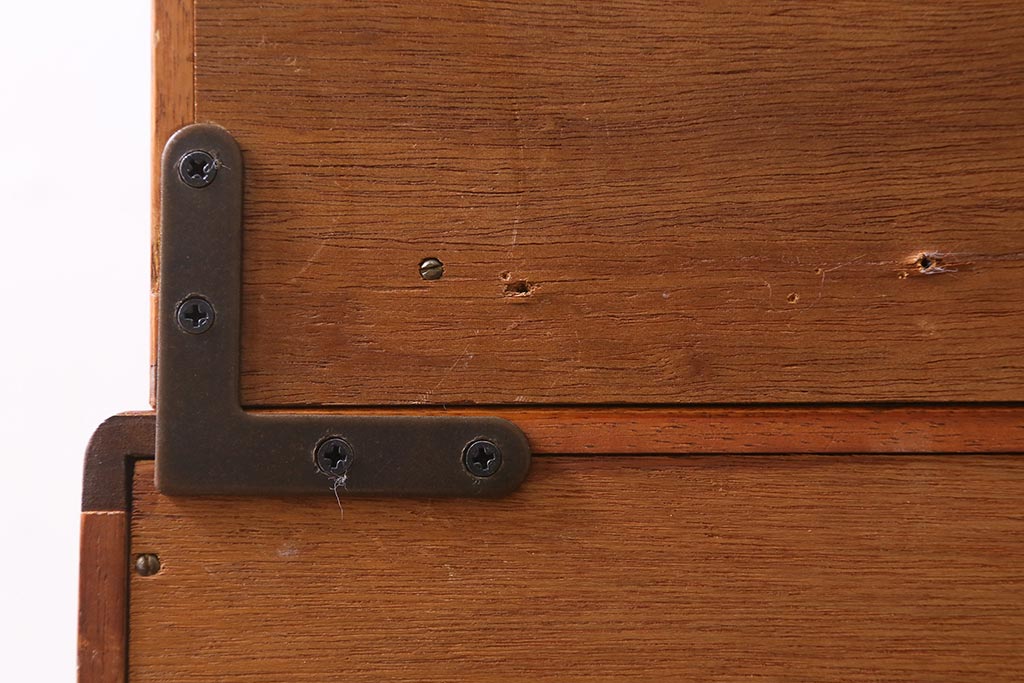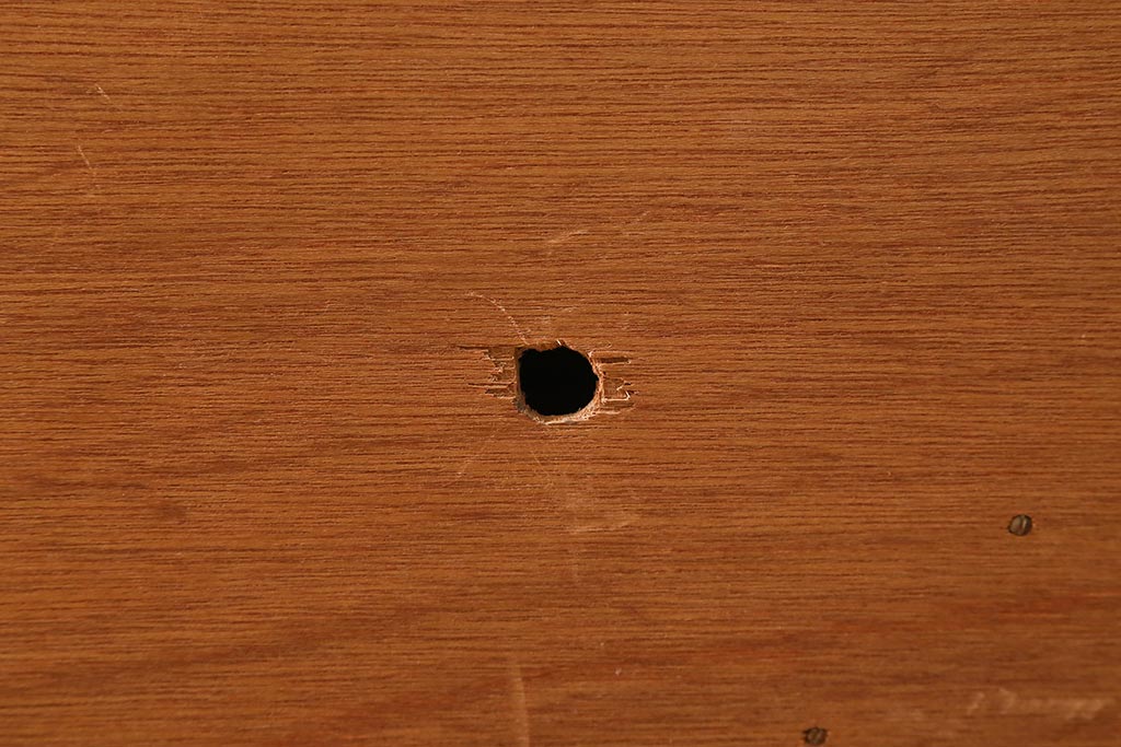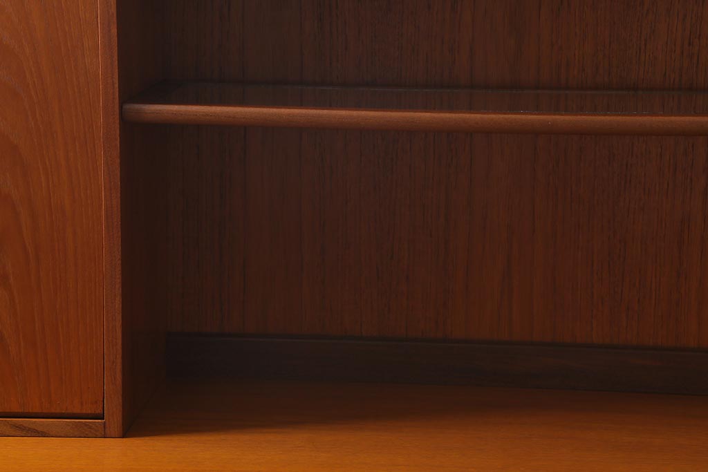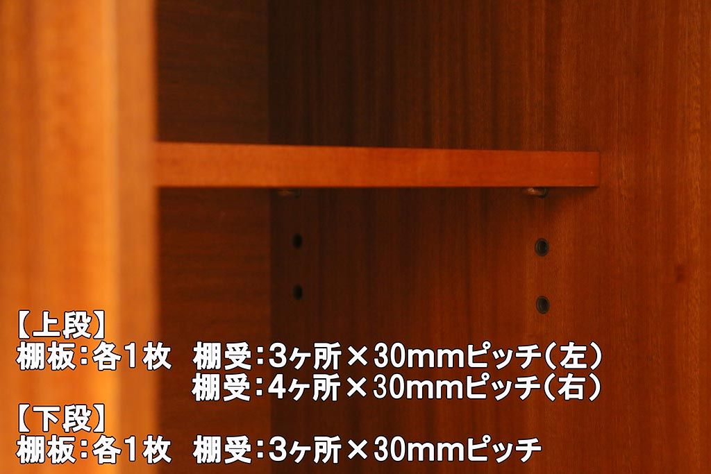 棚板は取り外しできます。棚板は各1枚ずつあります。棚受けは上段左に3ヶ所・右4ヶ所、下段に3ヶ所あり、各30mmピッチで調整できます。棚幅サイズのものが1枚の作りです。