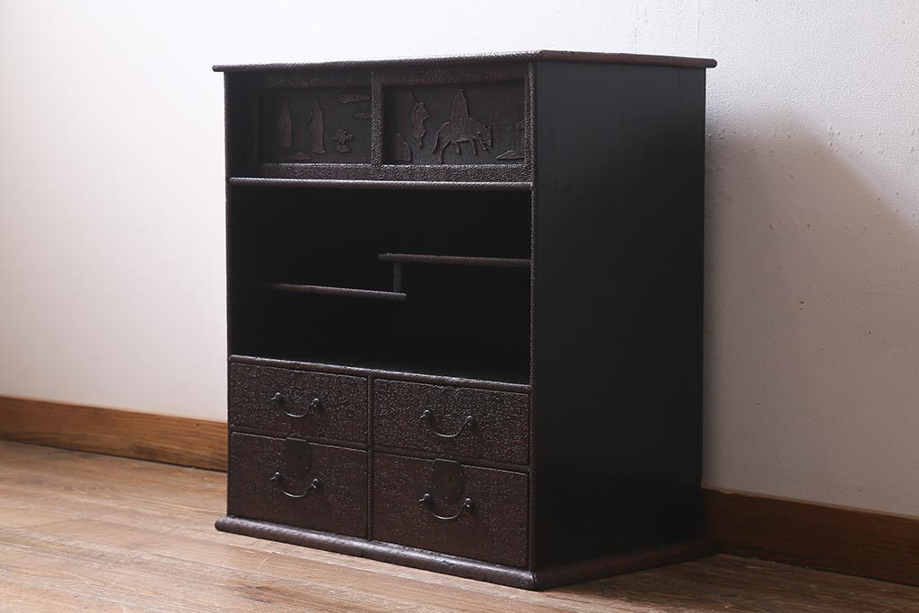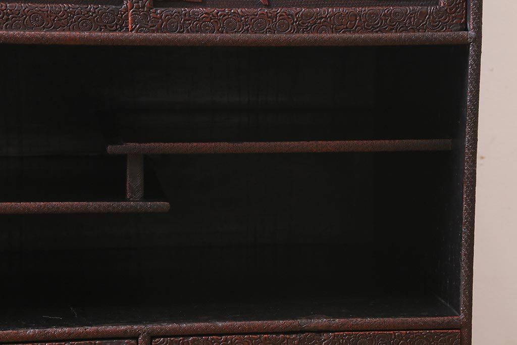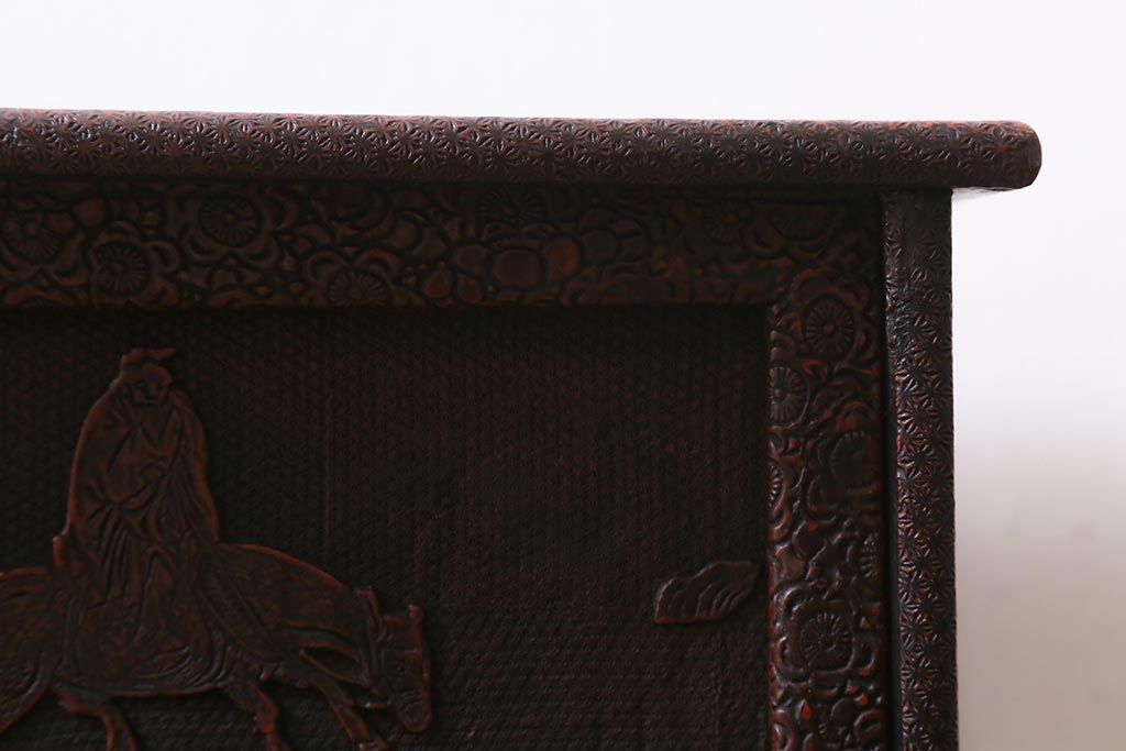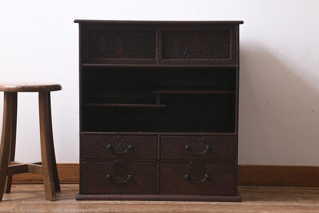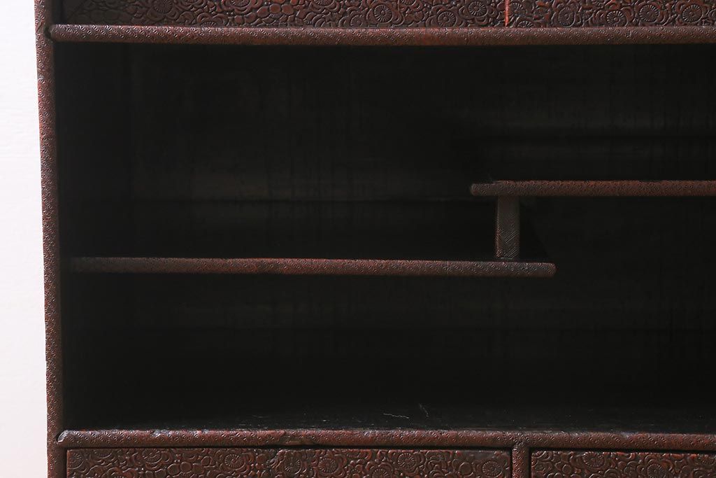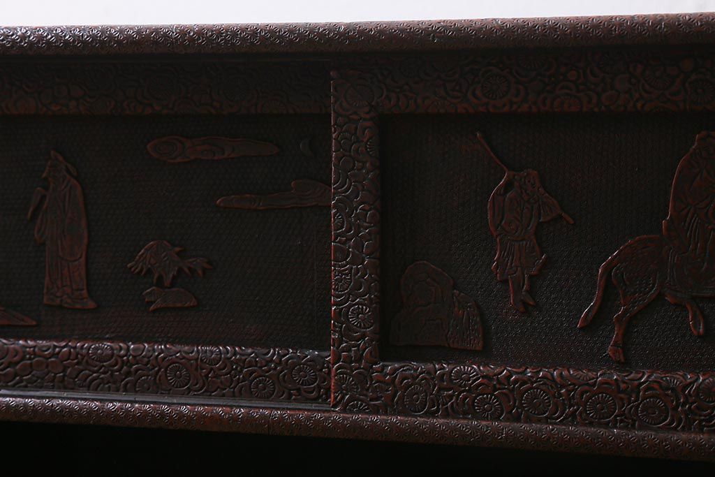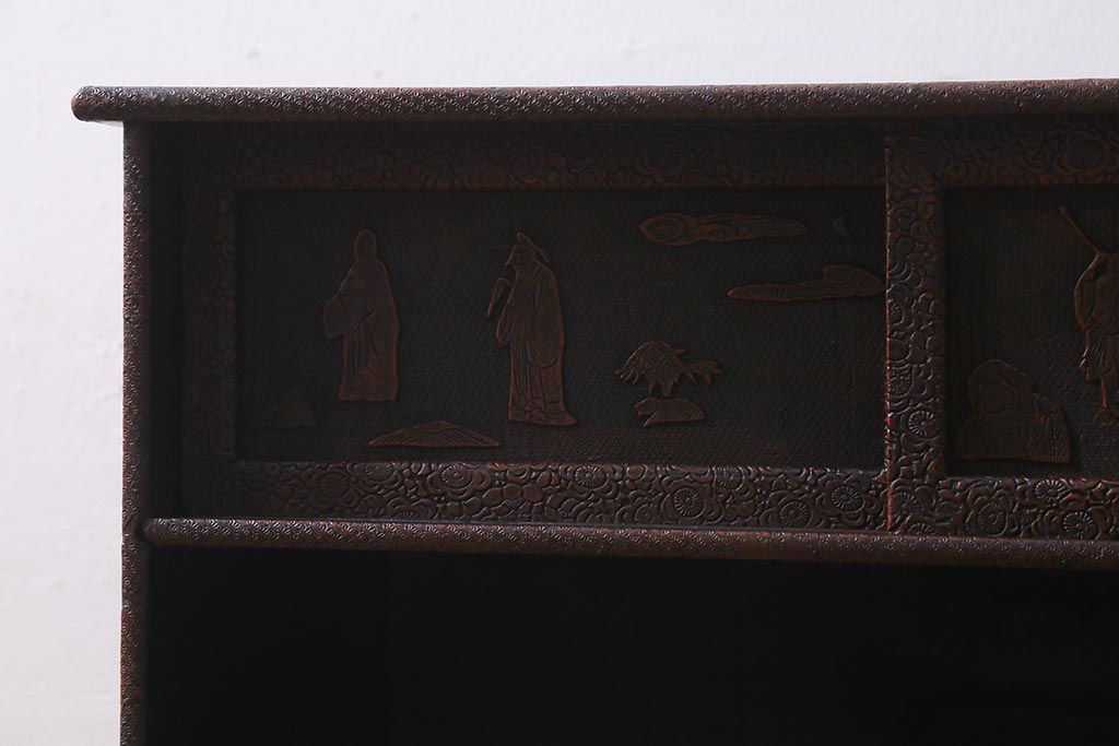 アンティーク家具 銅金具 堆朱 彫漆 凝った浮き彫りが目を引く古美術品の飾り棚(飾棚)(R-039541)です。