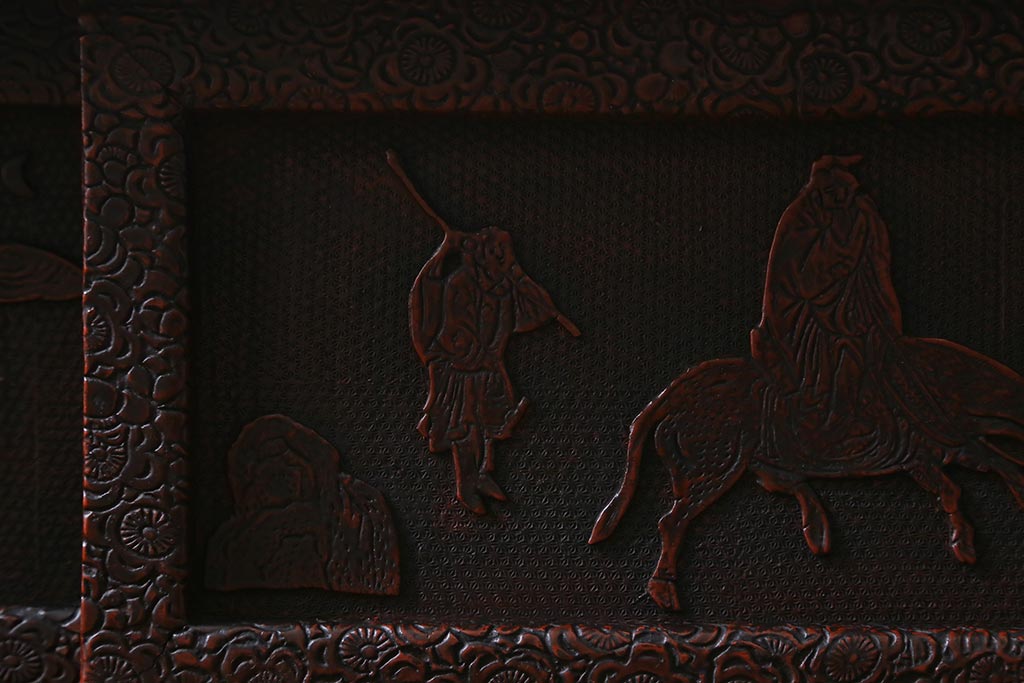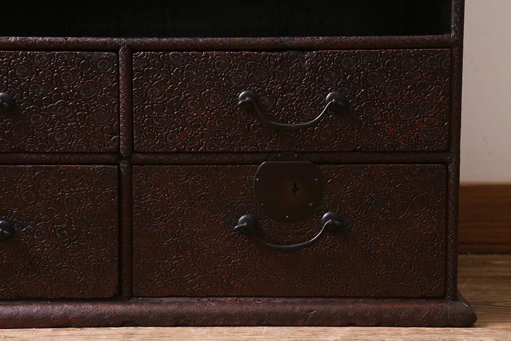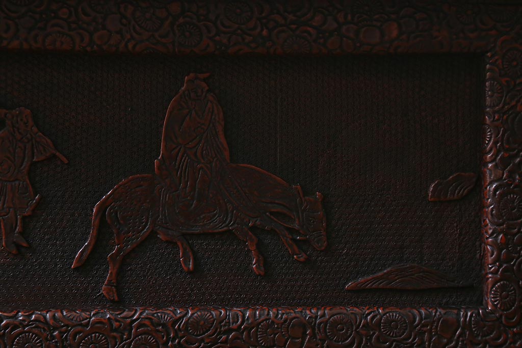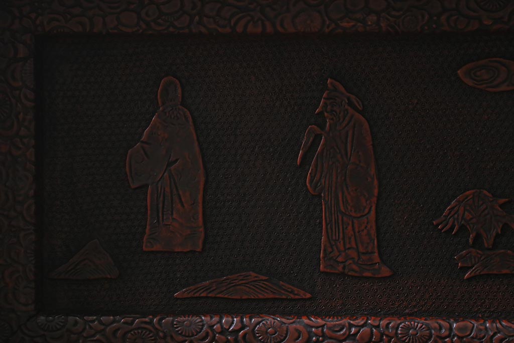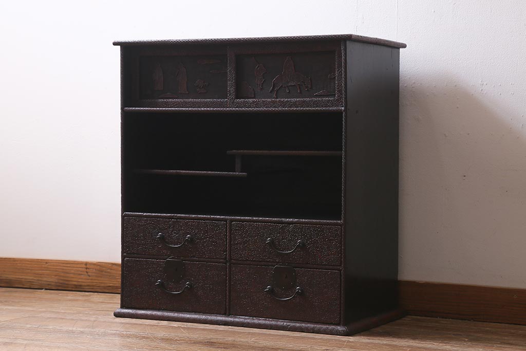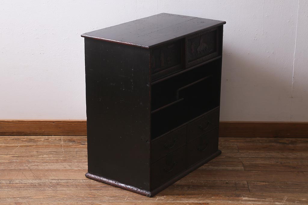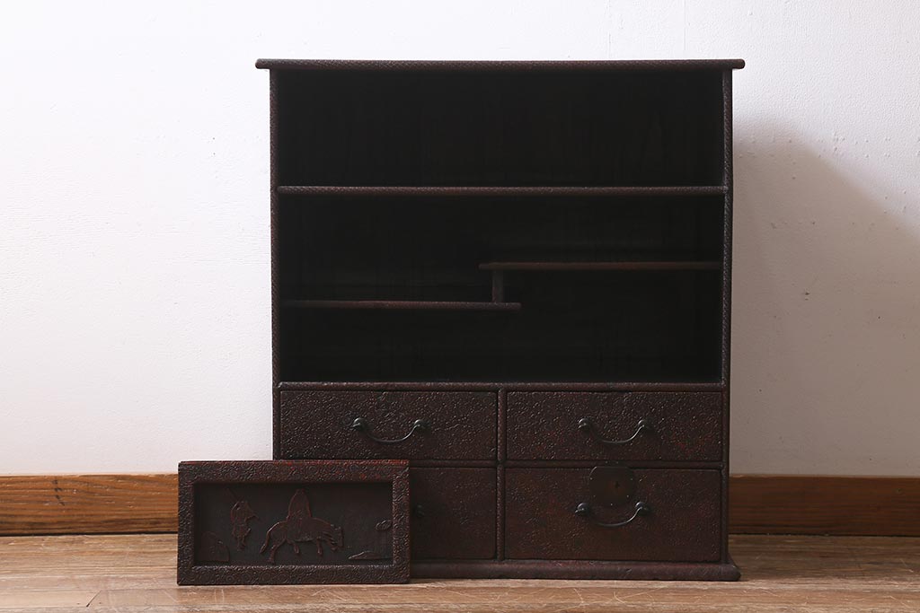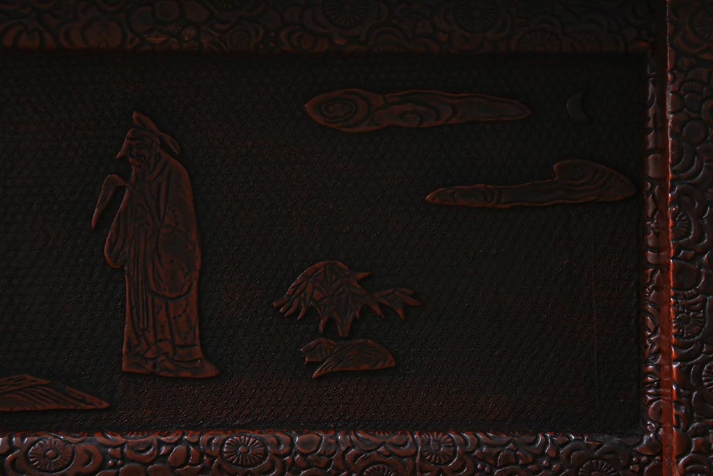 アンティーク家具 銅金具 堆朱 彫漆 凝った浮き彫りが目を引く古美術品の飾り棚(飾棚)(R-039541)です。