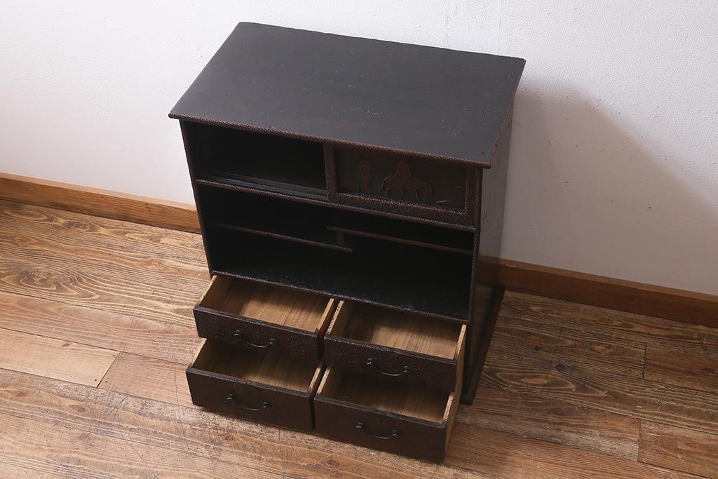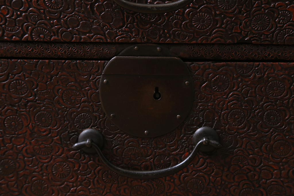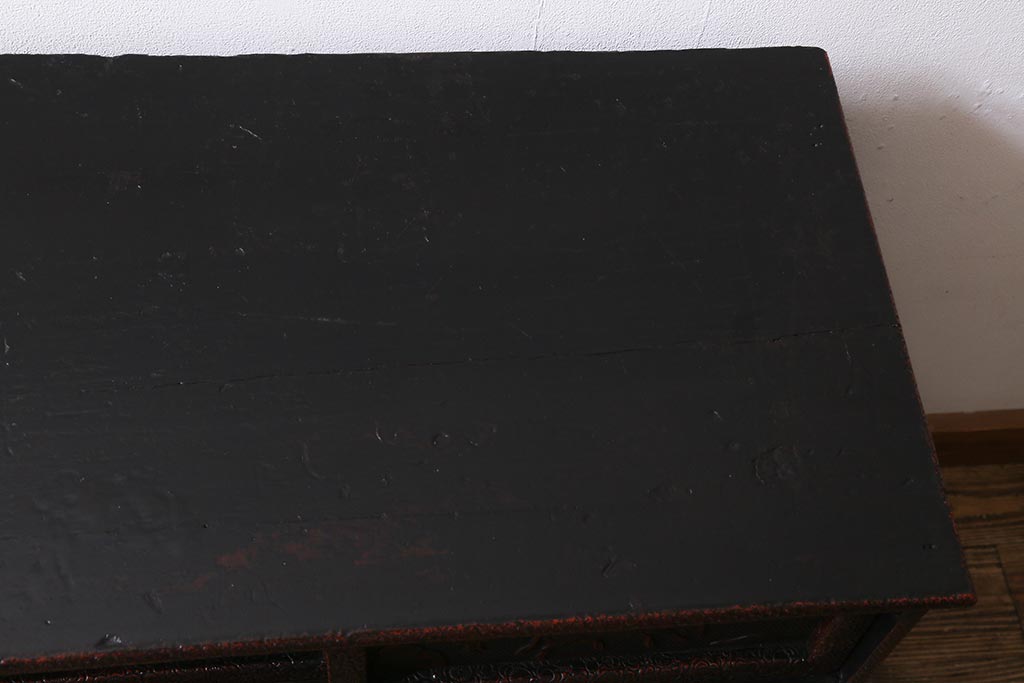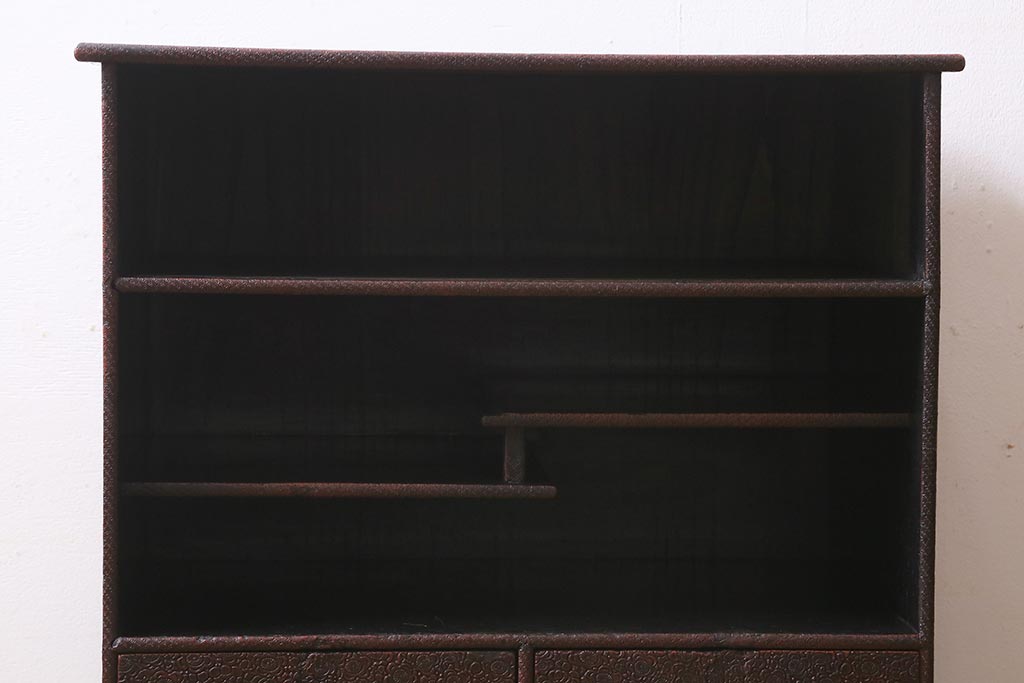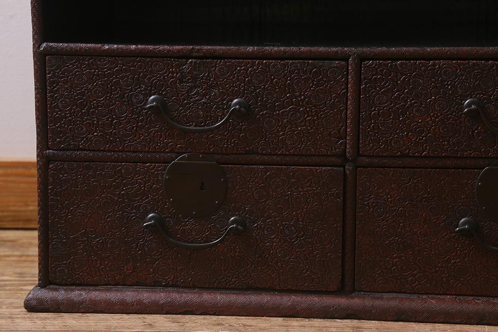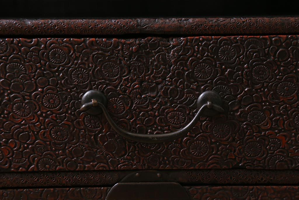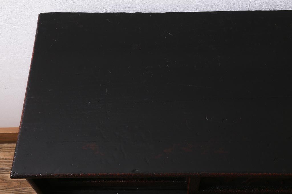 アンティーク家具 銅金具 堆朱 彫漆 凝った浮き彫りが目を引く古美術品の飾り棚(飾棚)(R-039541)です。