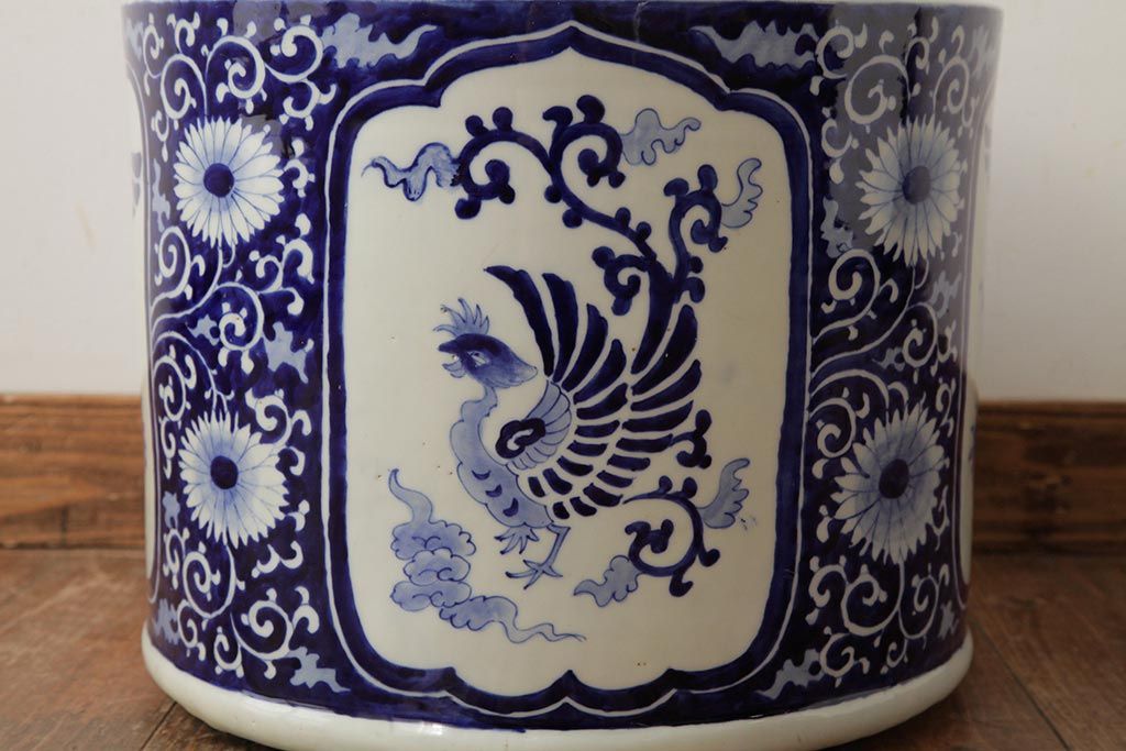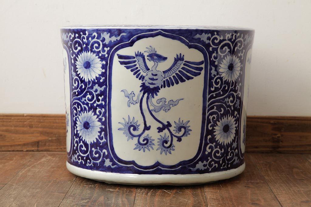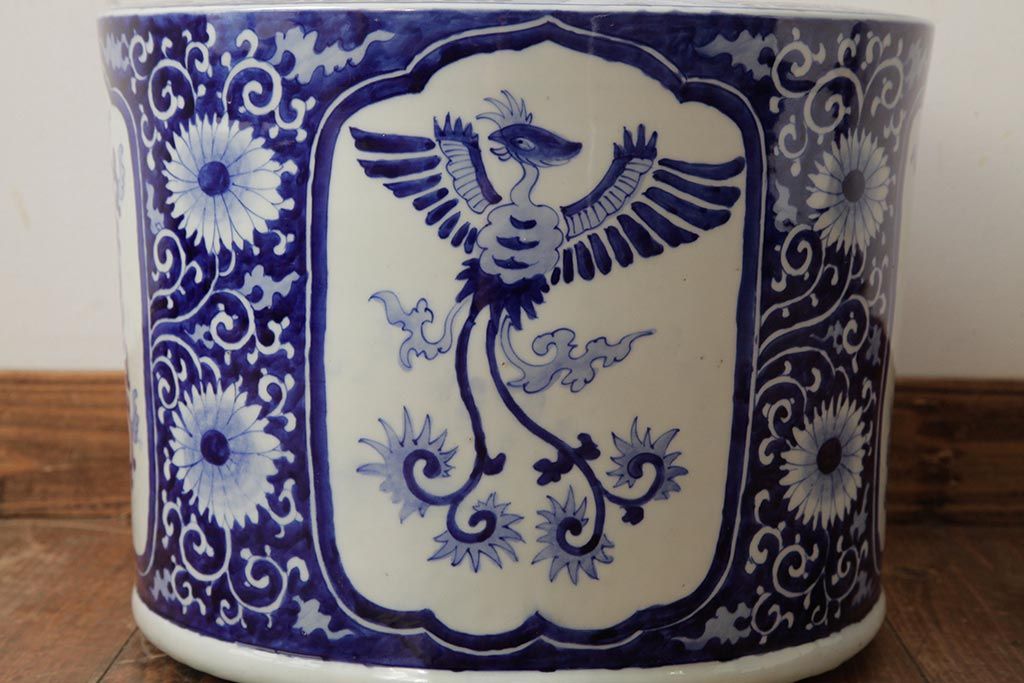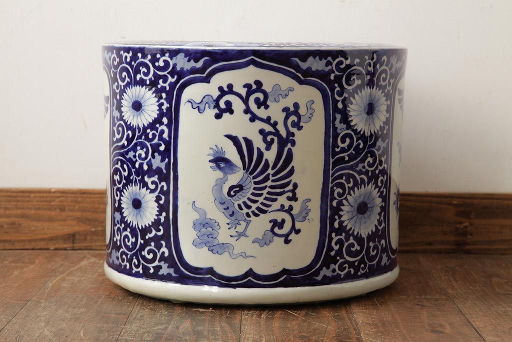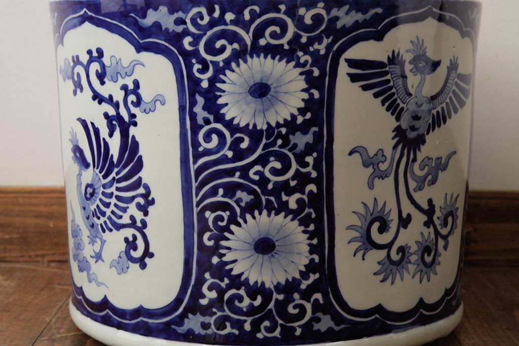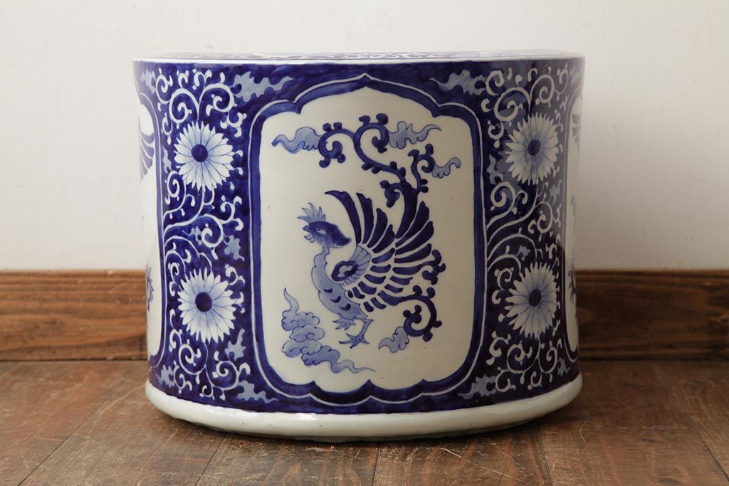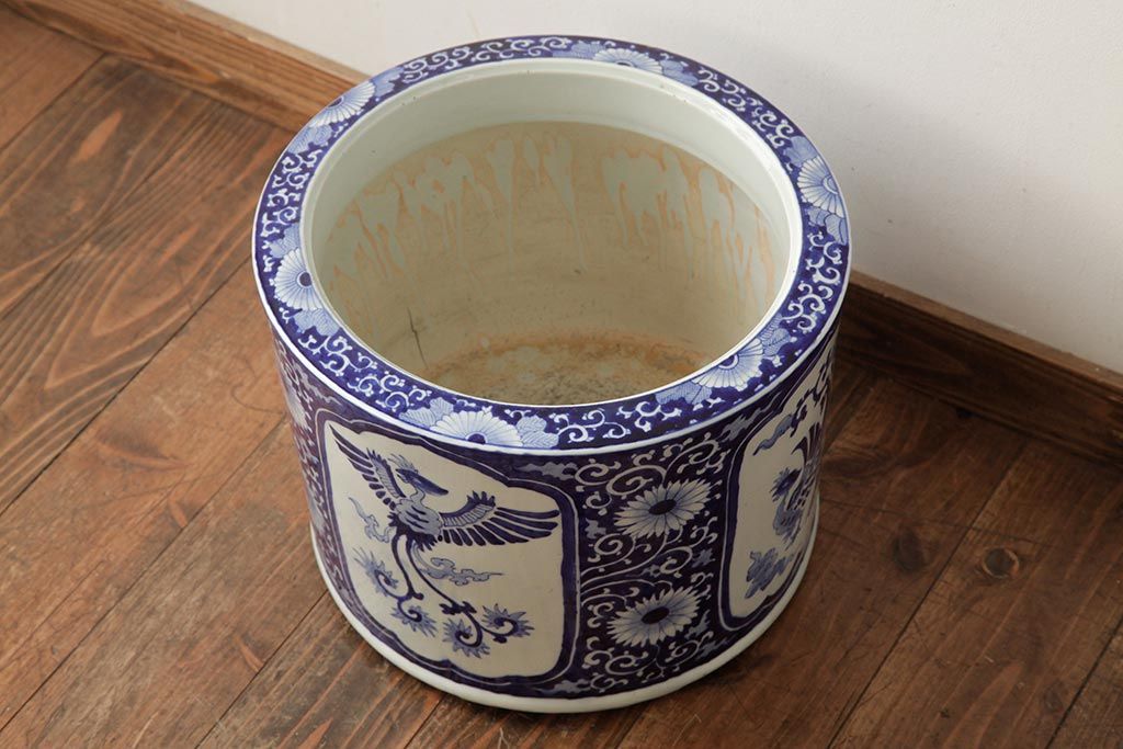 アンティーク雑貨 大正昭和初期 鳳凰の図が独特の雰囲気を醸し出す瀬戸火鉢(鉢カバー)(R-39478)