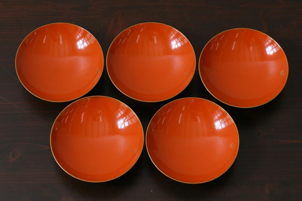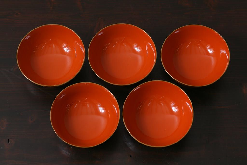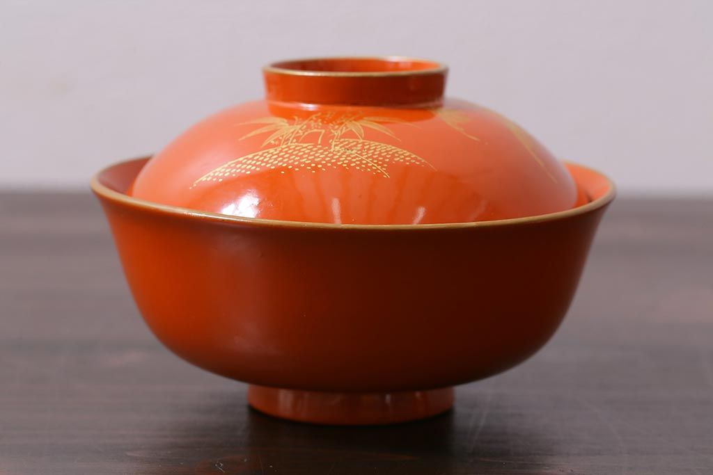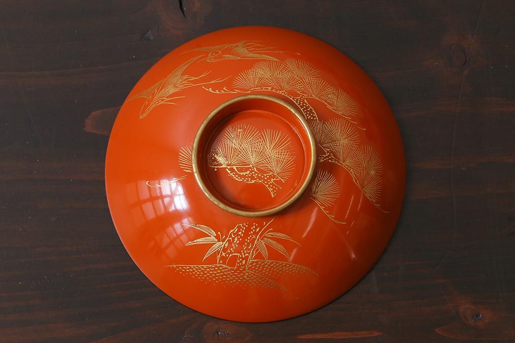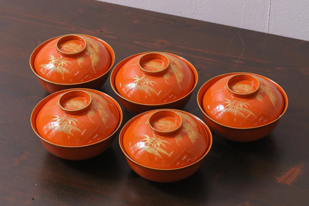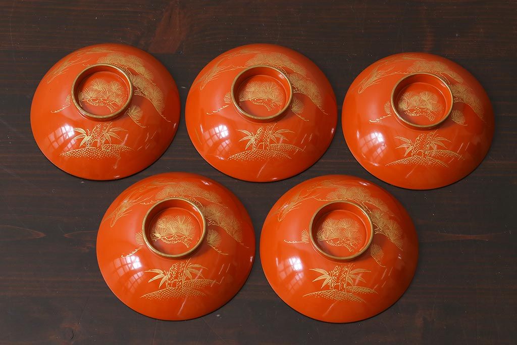 ラフジュ工房> 和食器・茶道具> お椀・茶碗 > アンティーク雑貨 和製アンティーク 鶴・松 縁起の良い沈金蒔絵の木製椀5客セット(蓋付き椀、漆器、和食器)(R-039374)