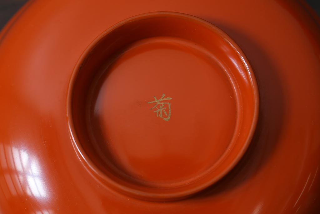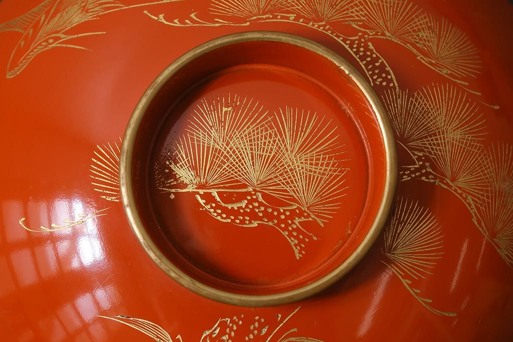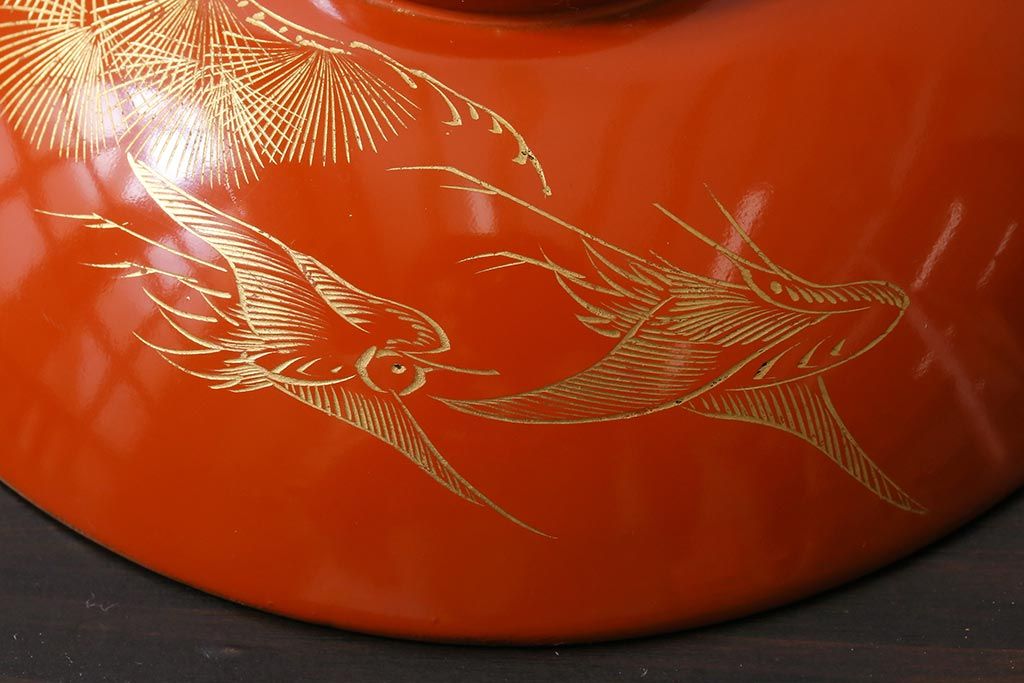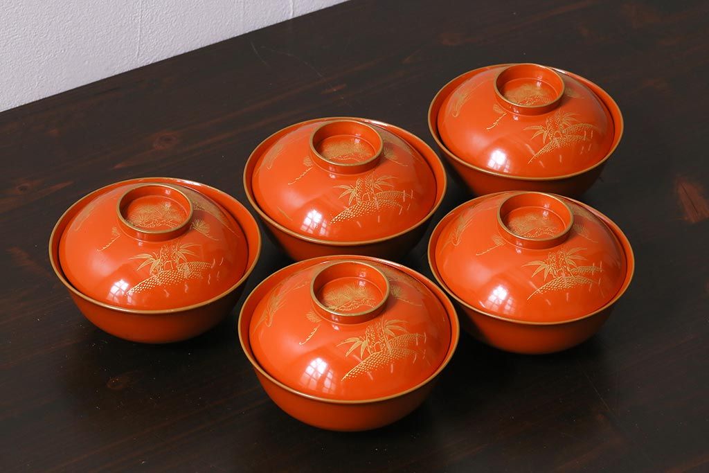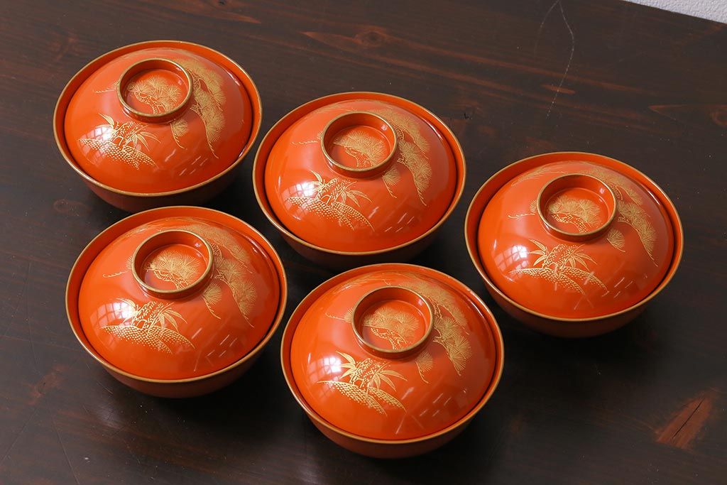 ラフジュ工房> 骨董・美術品> 骨董-漆器 > アンティーク雑貨 和製アンティーク 鶴・松 縁起の良い沈金蒔絵の木製椀5客セット(蓋付き椀、漆器、和食器)(R-039374)
