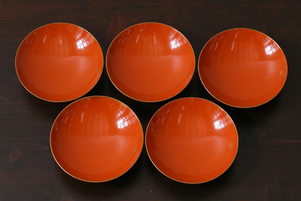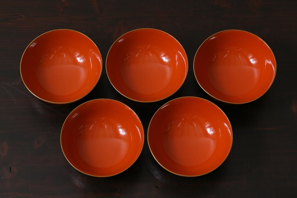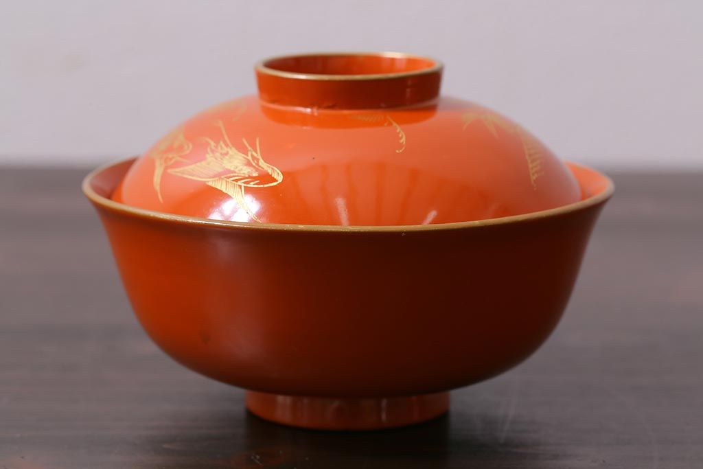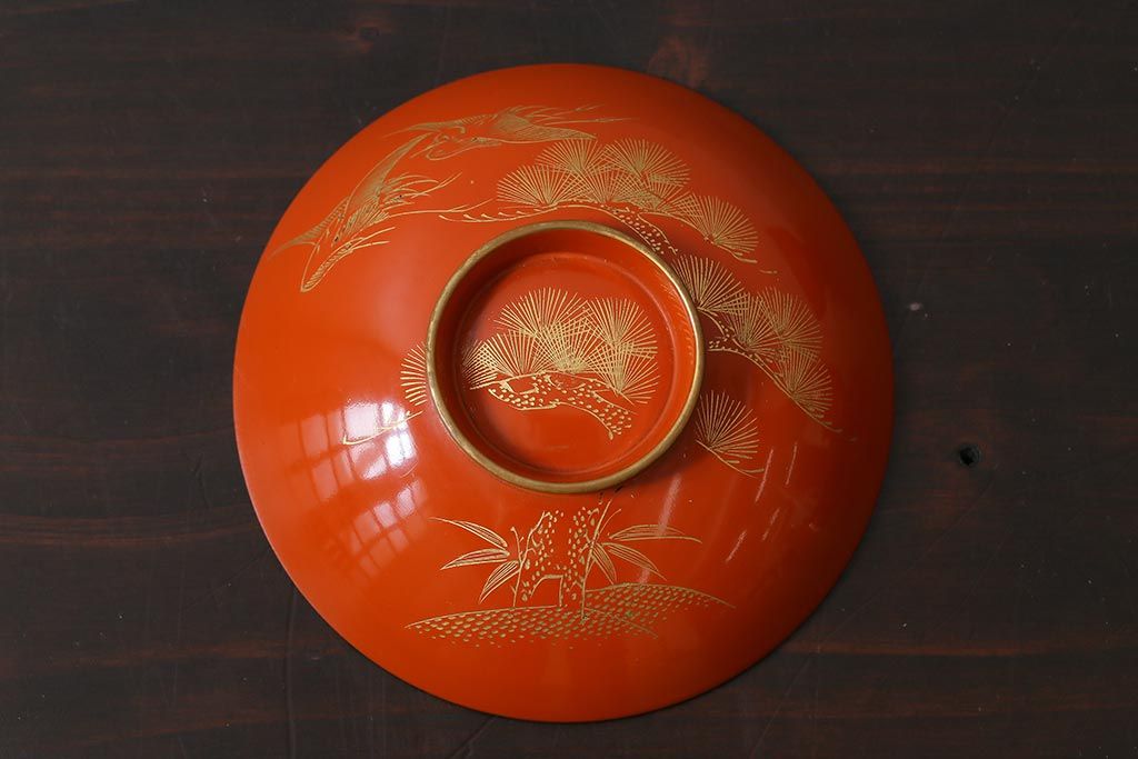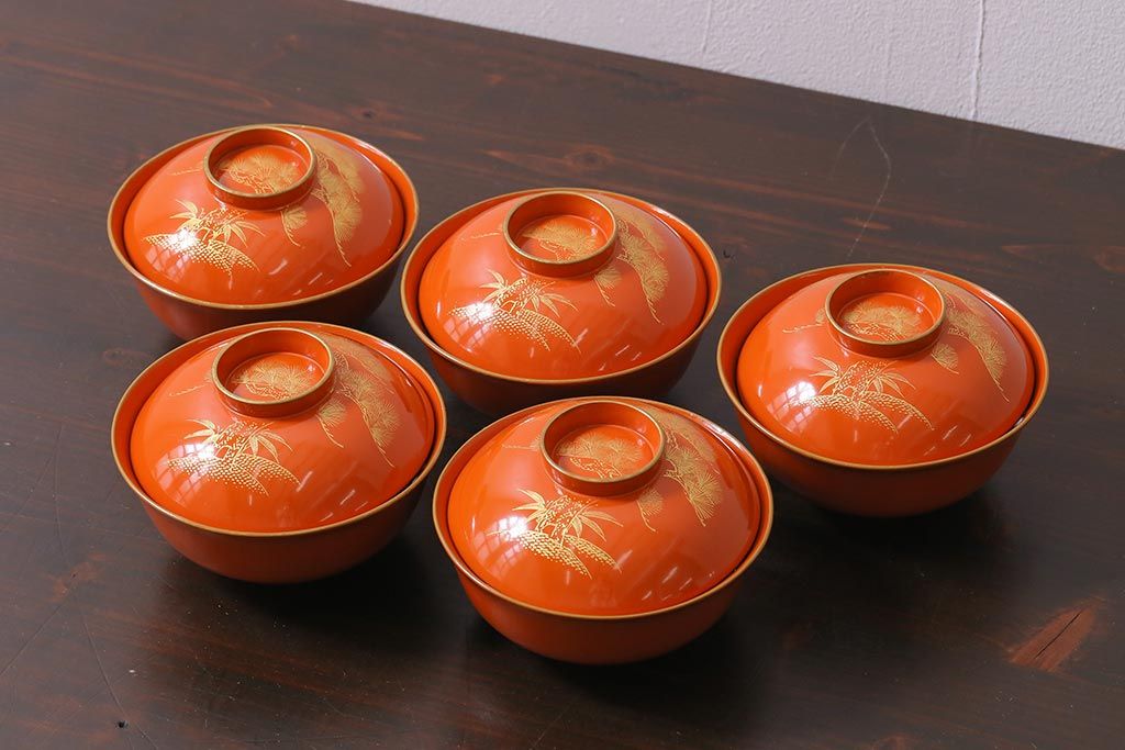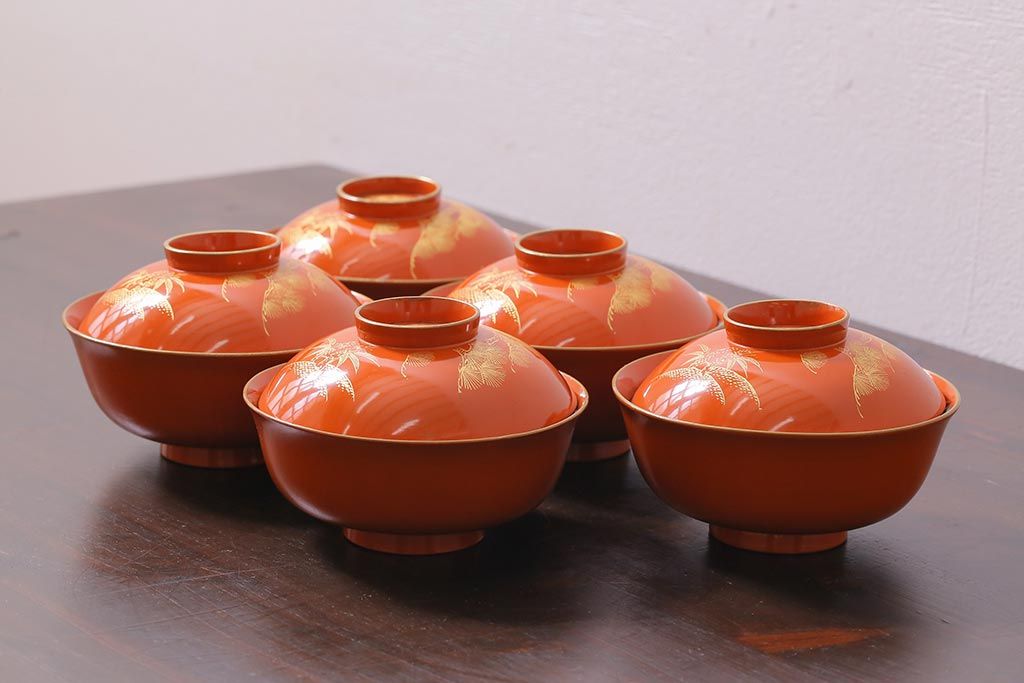 ラフジュ工房> 和食器・茶道具> お椀・茶碗 > アンティーク雑貨 和製アンティーク 鶴・松 縁起の良い沈金蒔絵の木製椀5客セット(蓋付き椀、漆器、和食器)(R-039375)