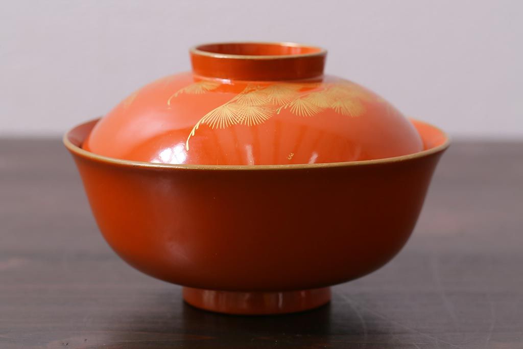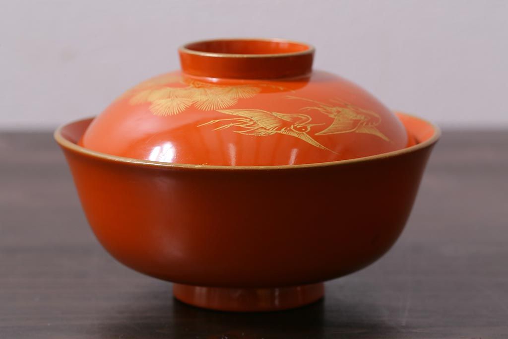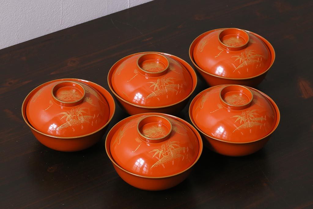 アンティーク雑貨 和製アンティーク 鶴・松 縁起の良い沈金蒔絵の木製椀5客セット(蓋付き椀、漆器、和食器)(R-039375)