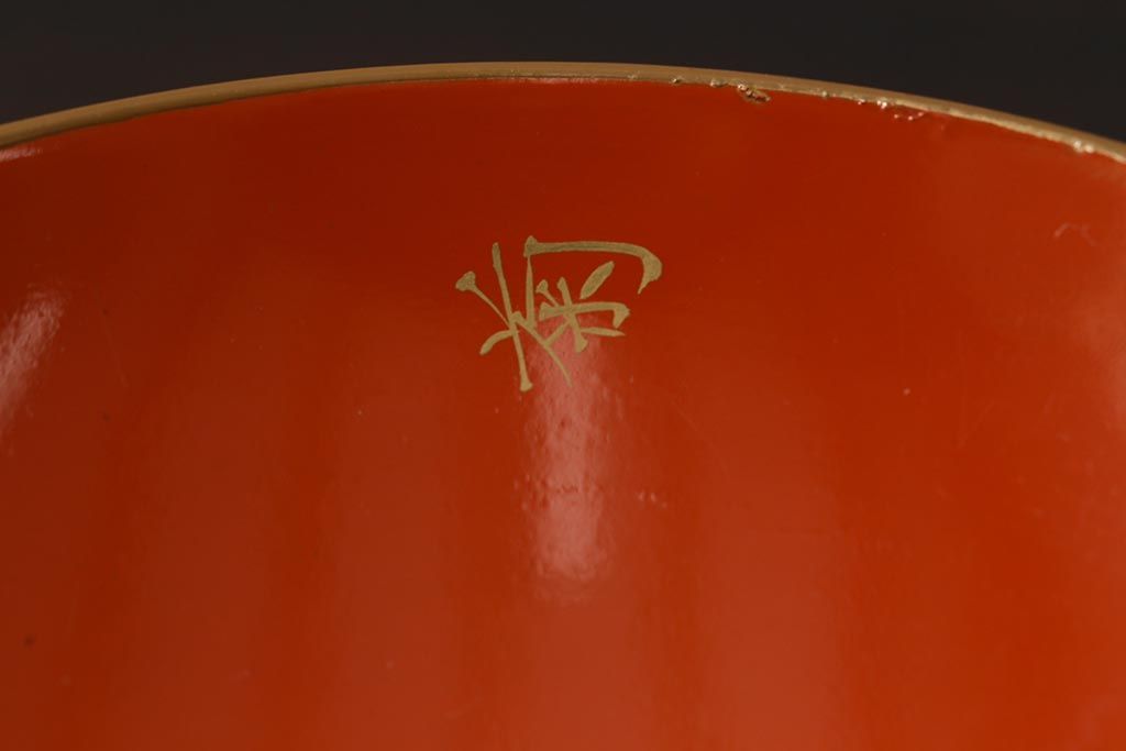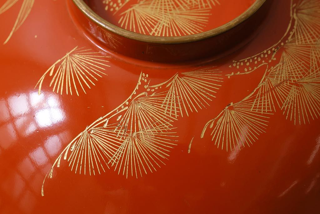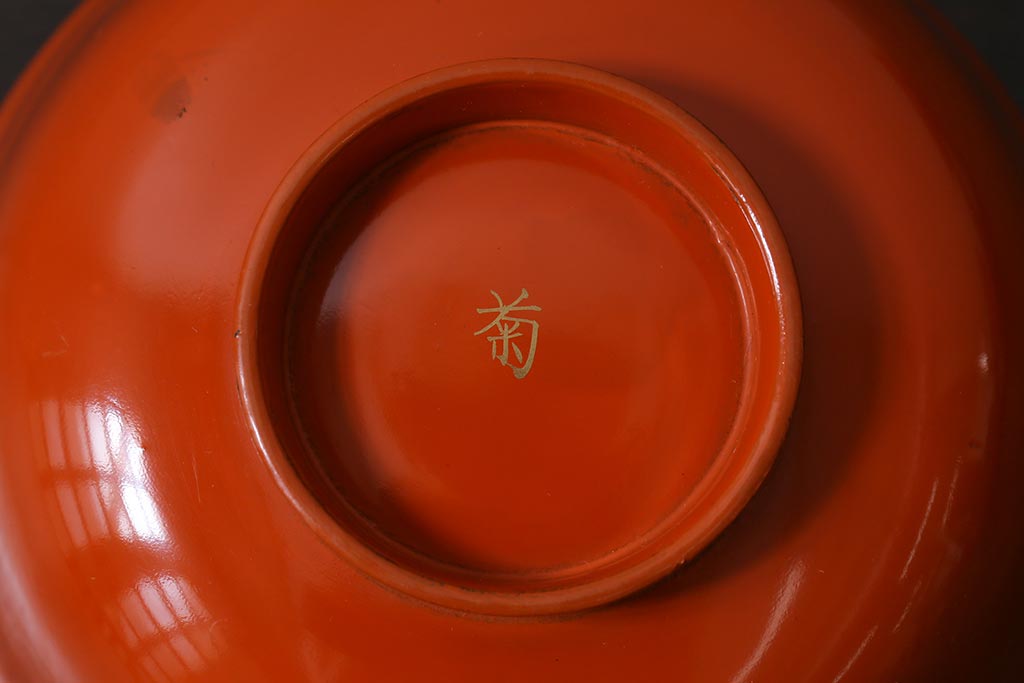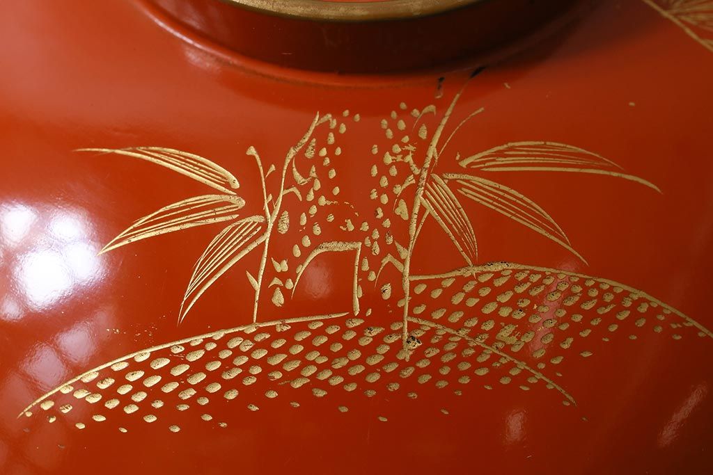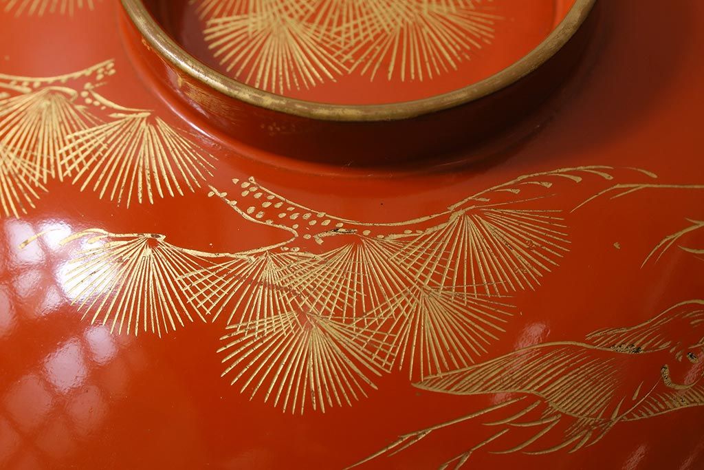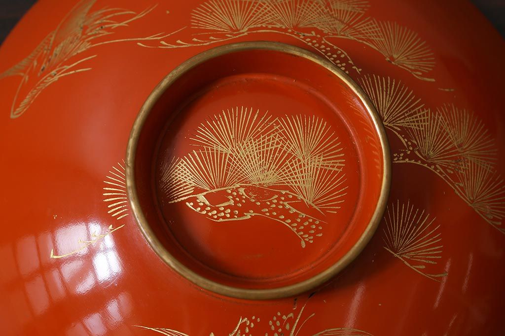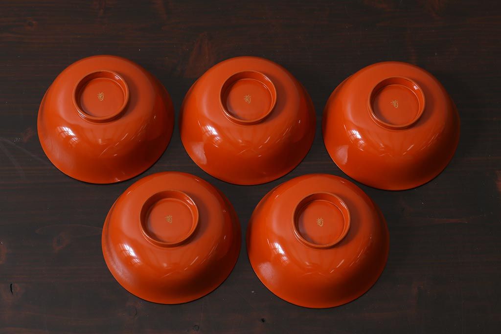 ラフジュ工房> 骨董・美術品> 骨董-漆器 > アンティーク雑貨 和製アンティーク 鶴・松 縁起の良い沈金蒔絵の木製椀5客セット(蓋付き椀、漆器、和食器)(R-039375)